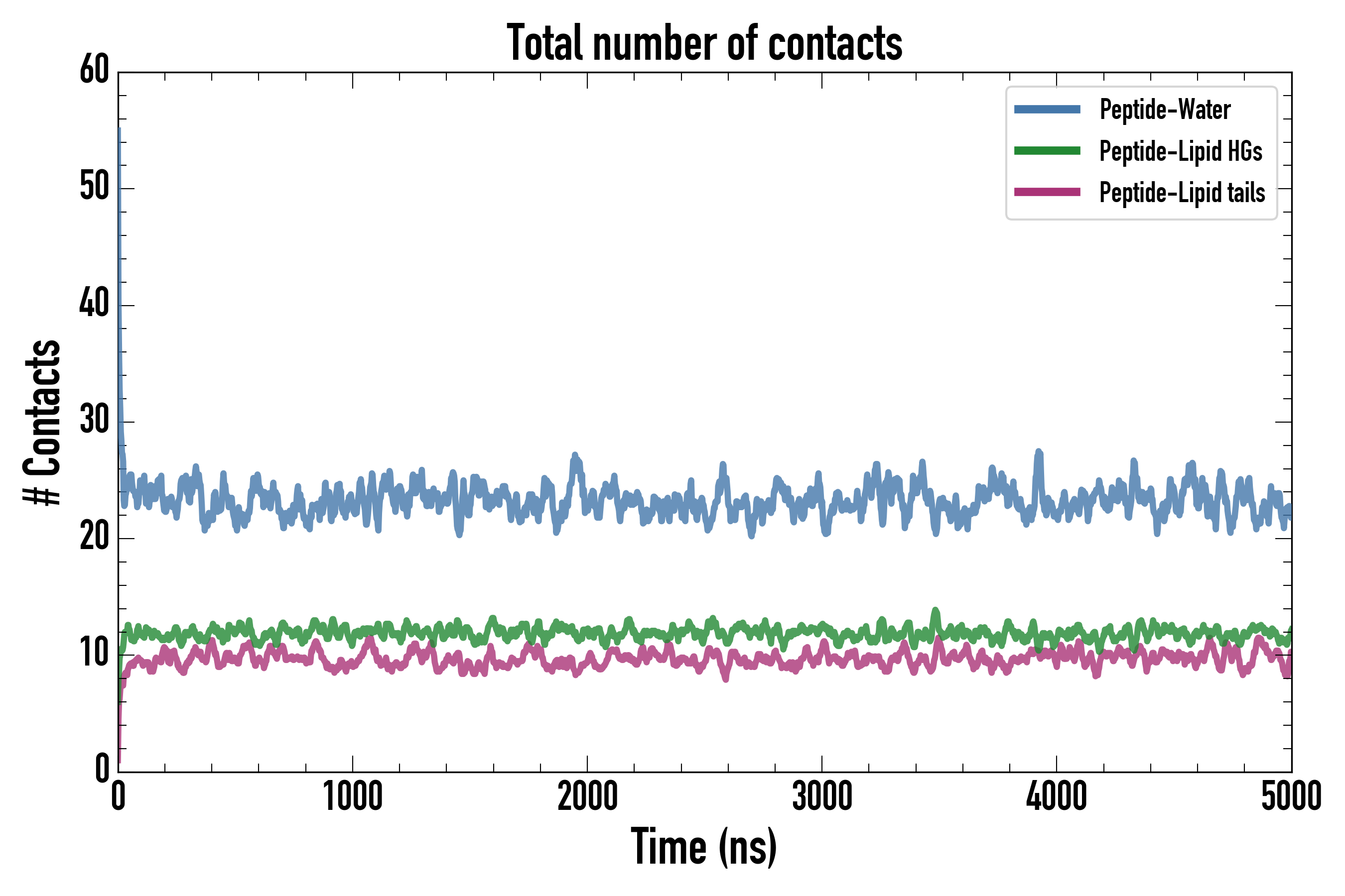 Number of contacts between each residue of the peptide backbone and the different lipid types, averaged over the last microsecond and using a cut-off of 0.6 nm.