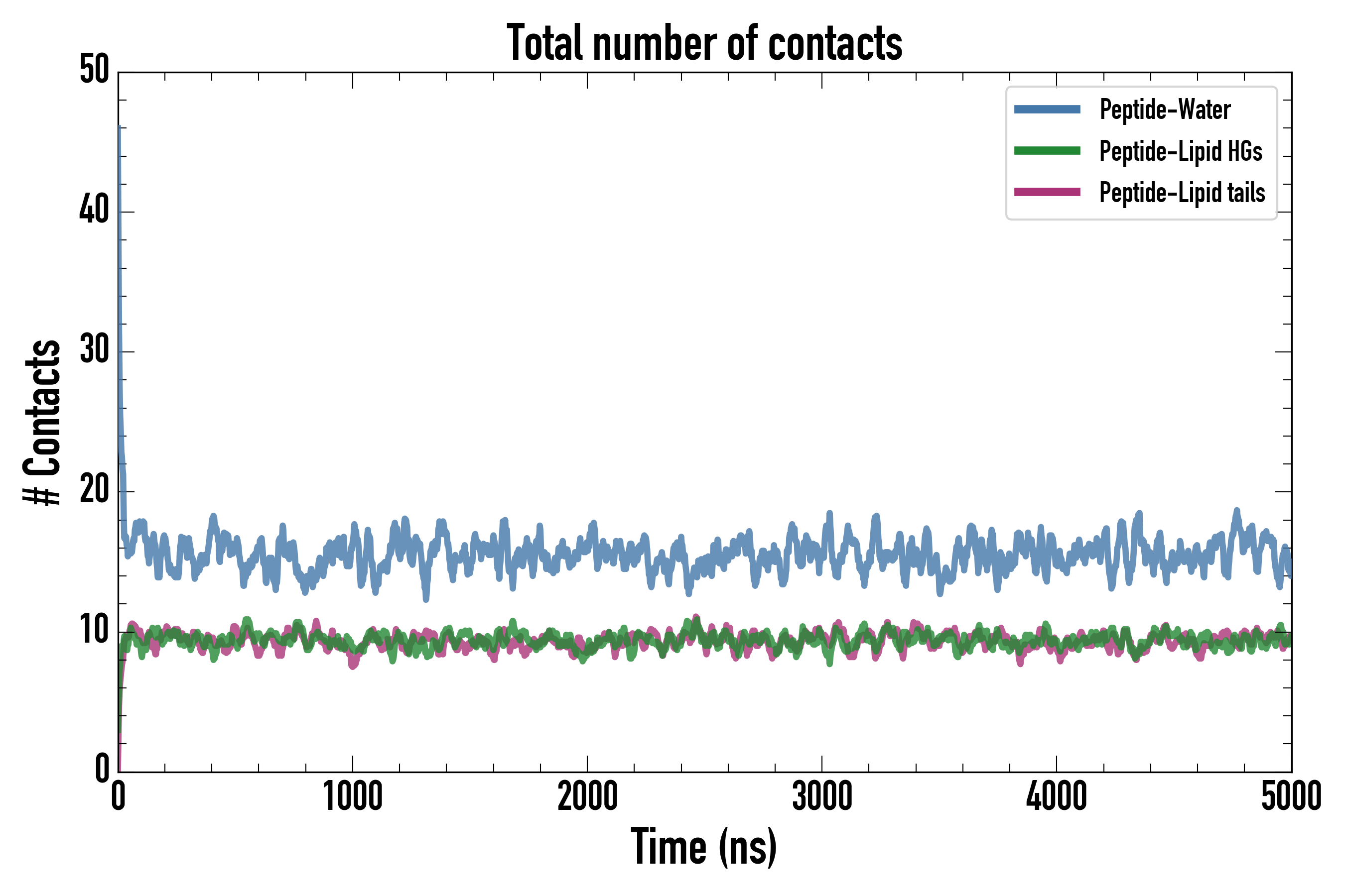 Number of contacts between each residue of the peptide backbone and the different lipid types, averaged over the last microsecond and using a cut-off of 0.6 nm.