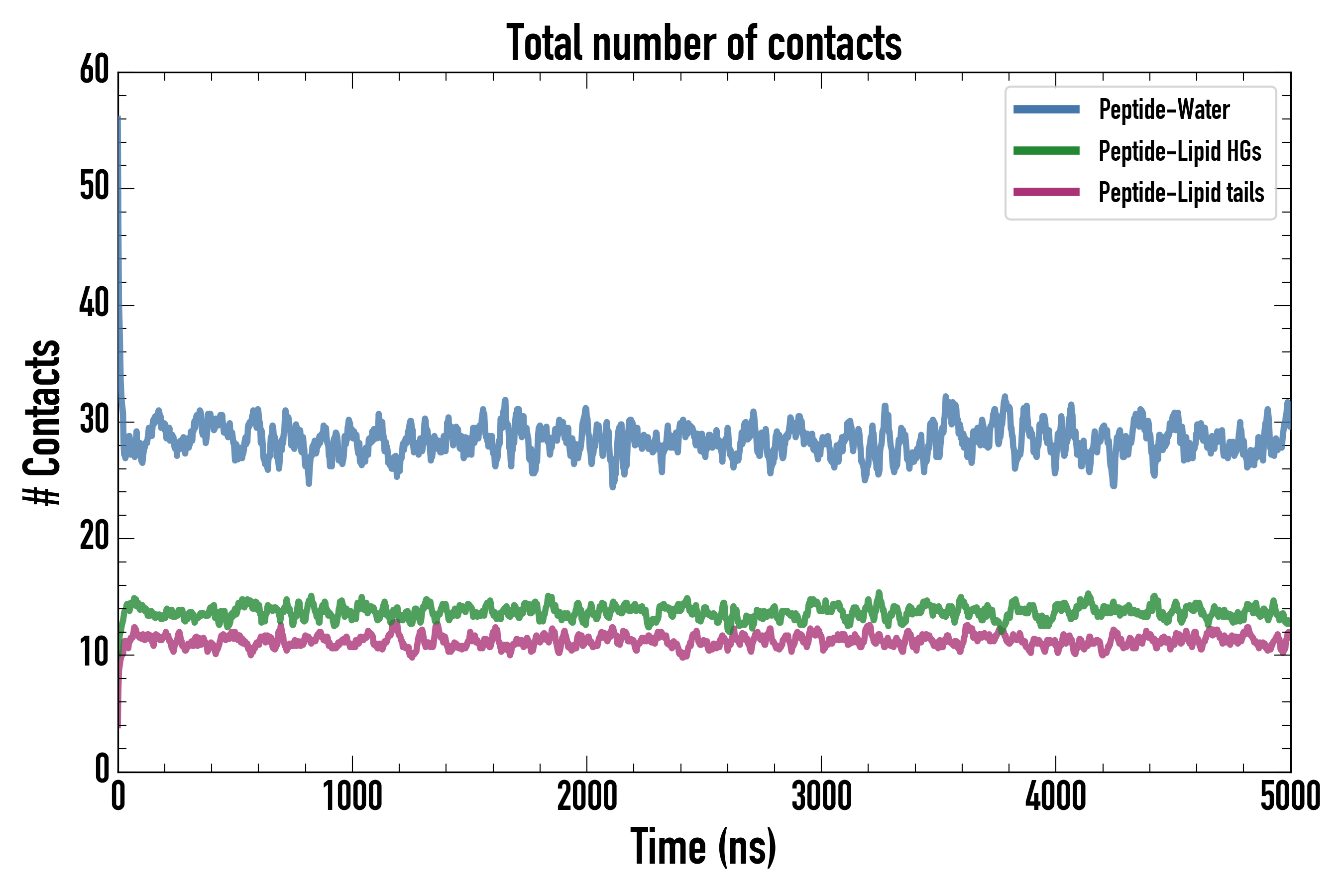 Number of contacts between each residue of the peptide backbone and the different lipid types, averaged over the last microsecond and using a cut-off of 0.6 nm.