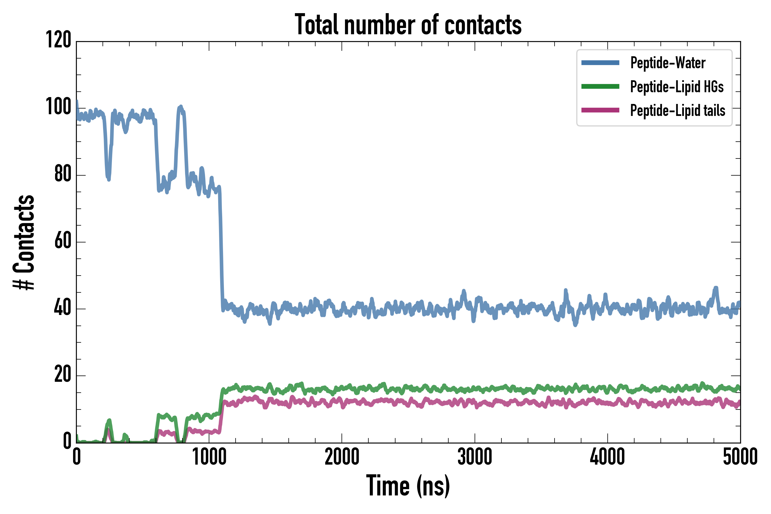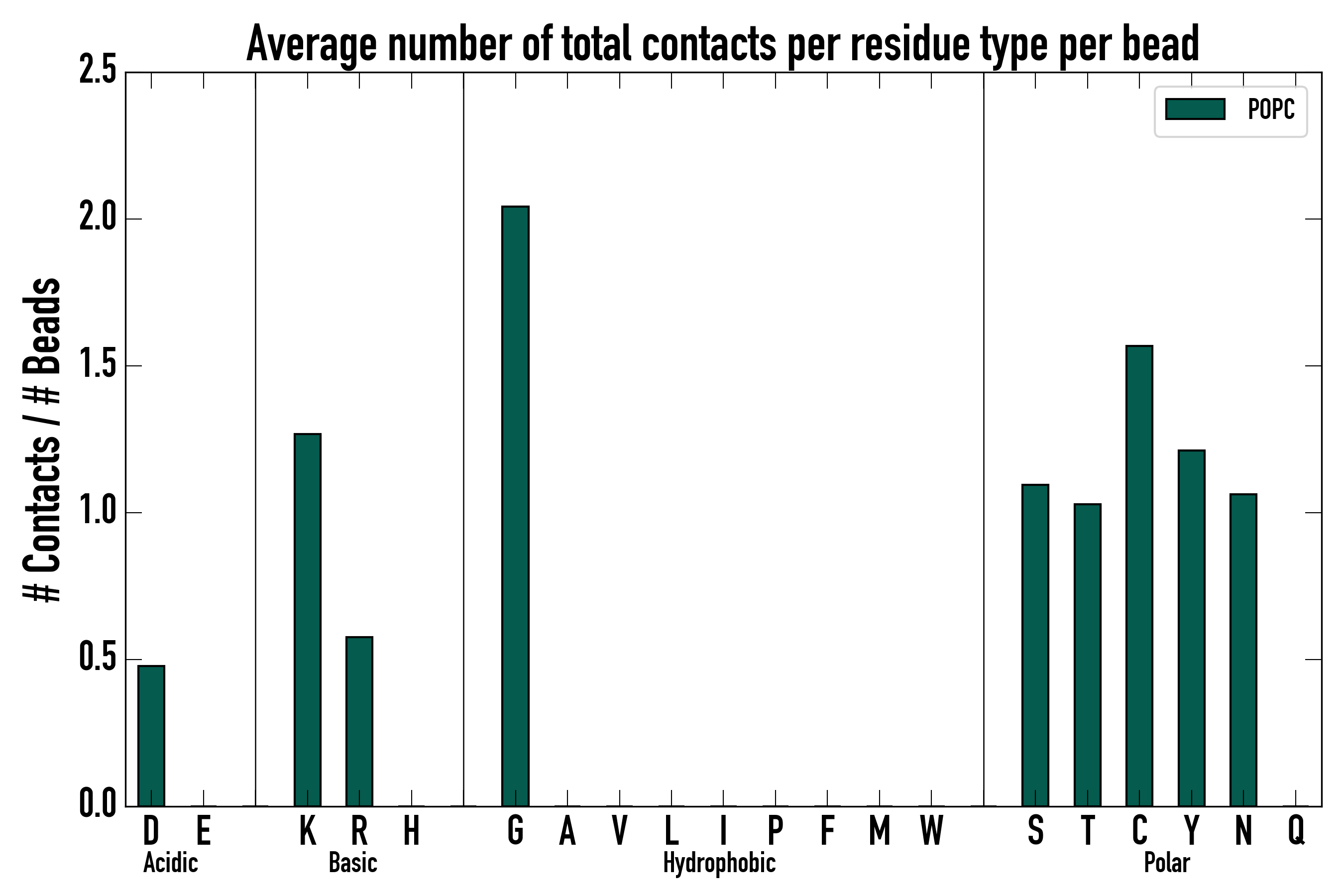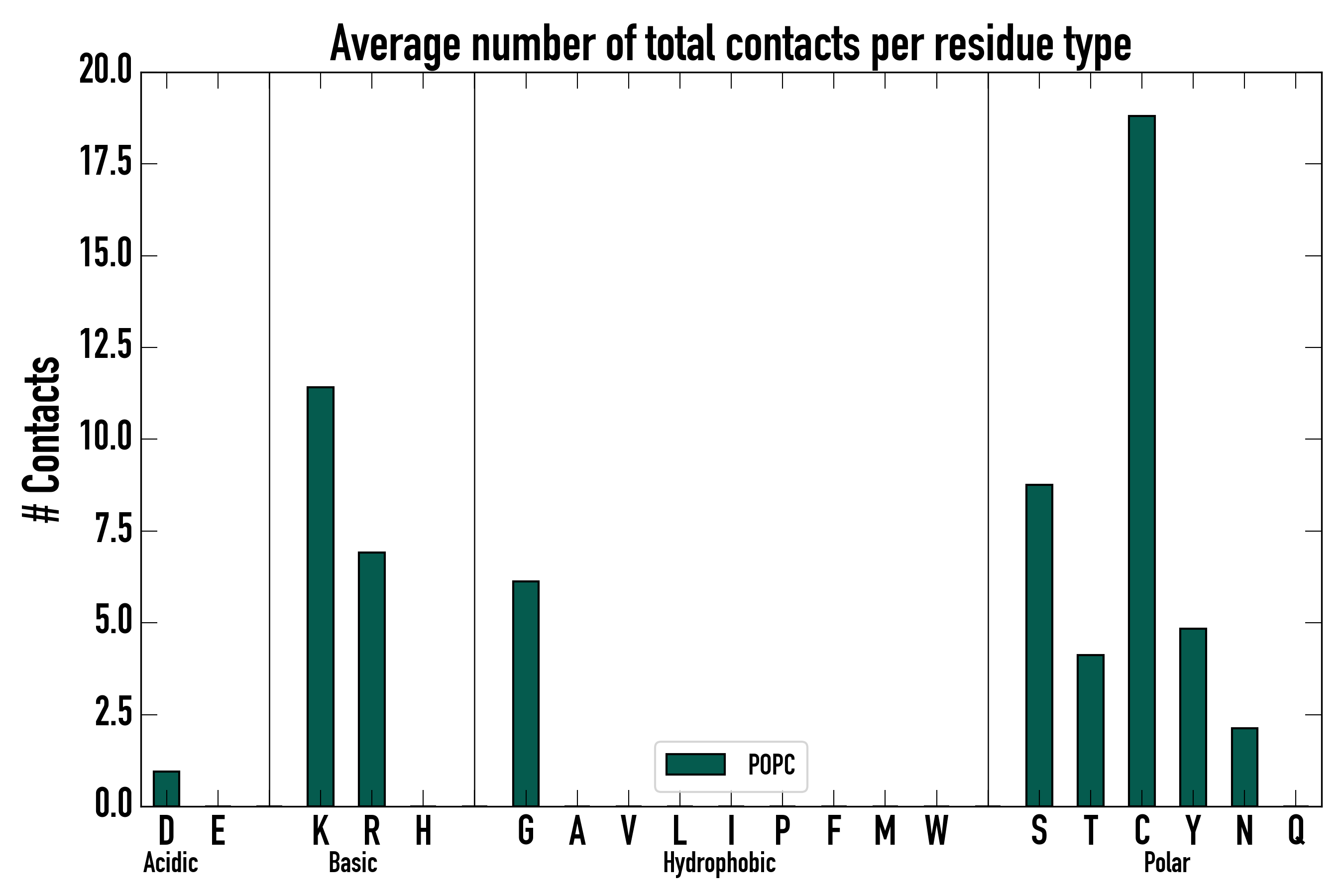 Number of contacts between each residue of the peptide backbone and the different lipid types, averaged over the last microsecond and using a cut-off of 0.6 nm.