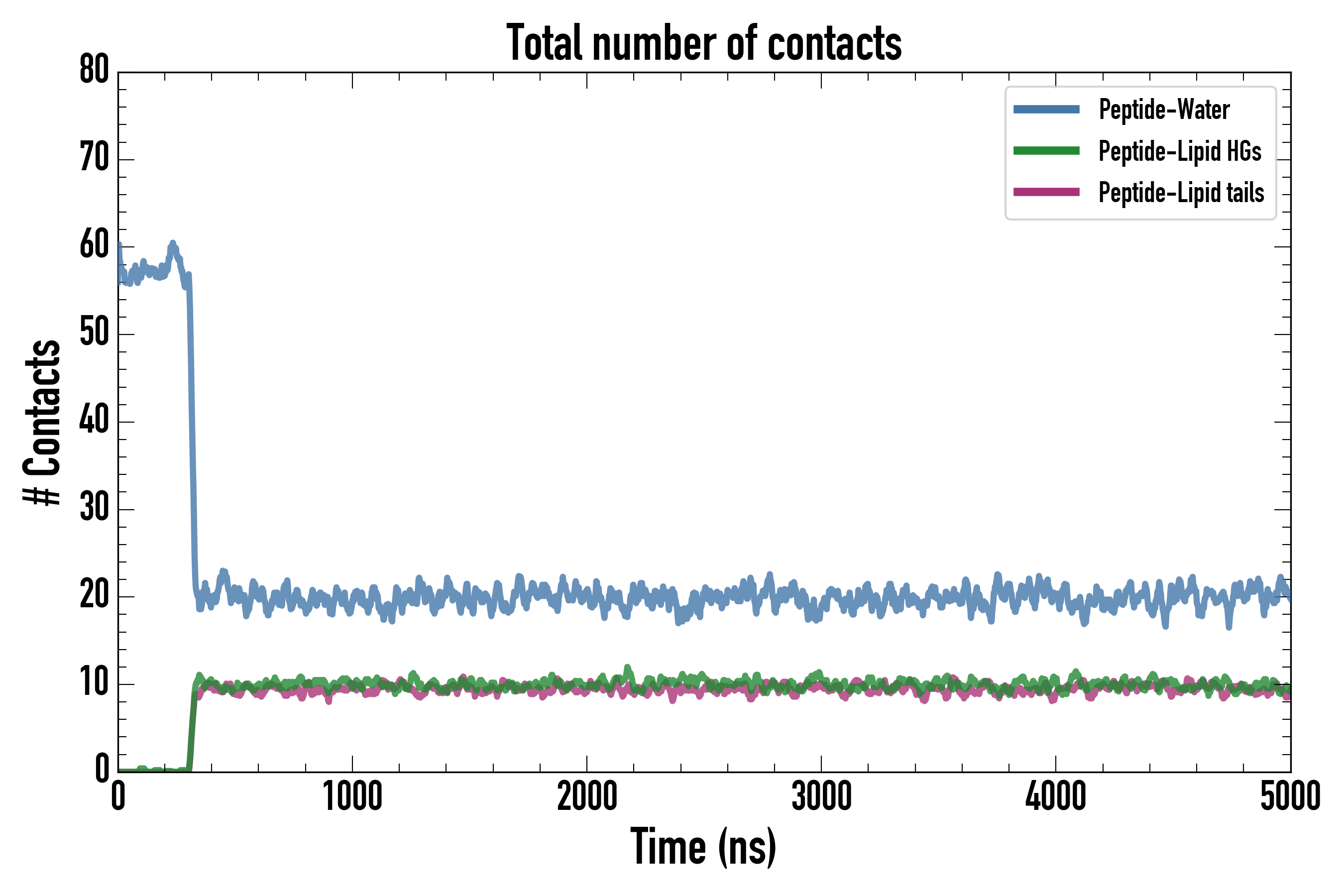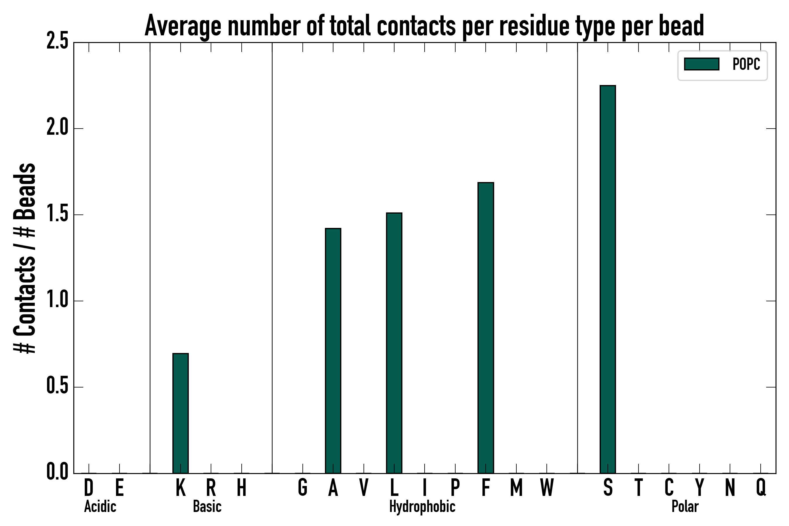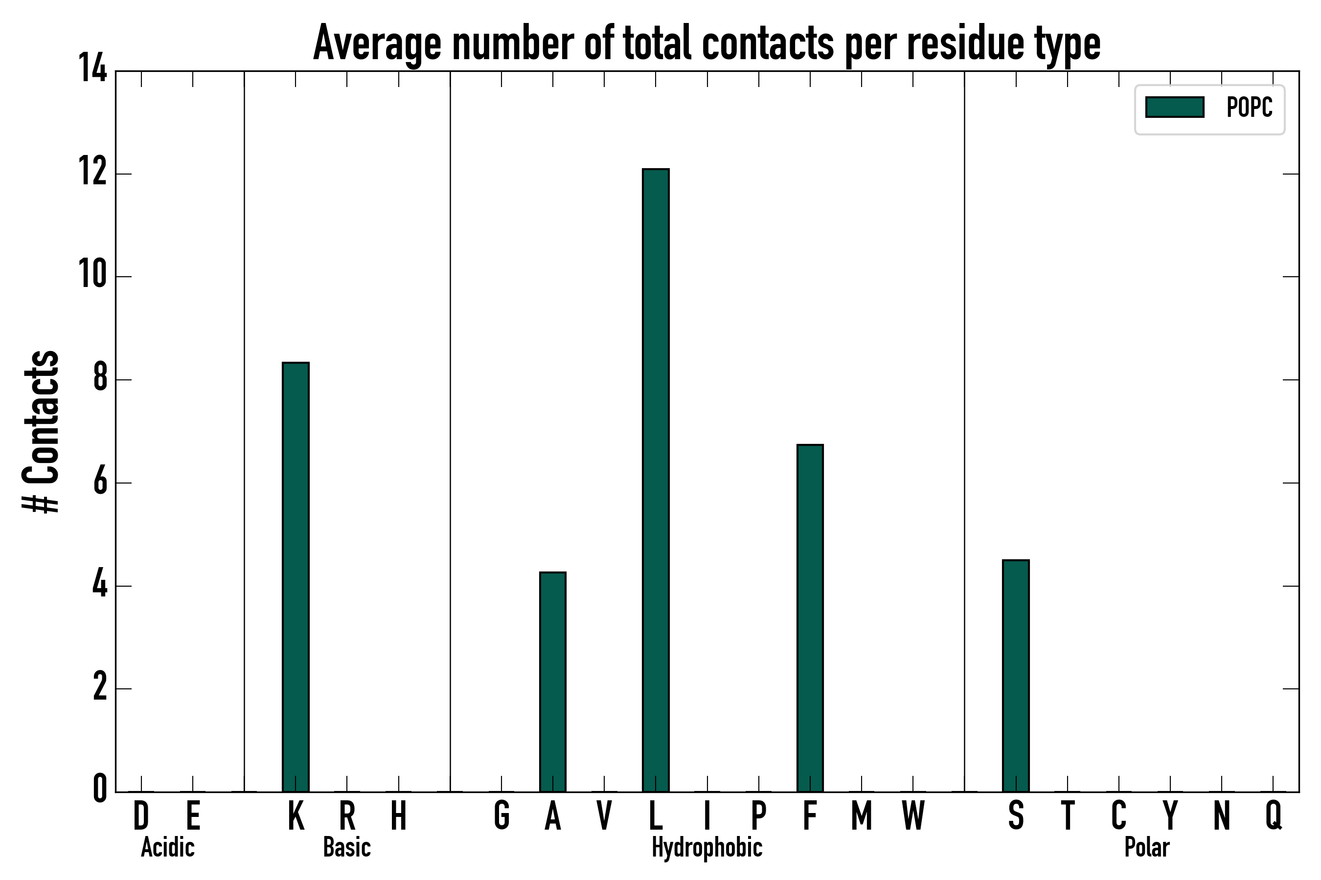 Number of contacts between each residue of the peptide backbone and the different lipid types, averaged over the last microsecond and using a cut-off of 0.6 nm.
