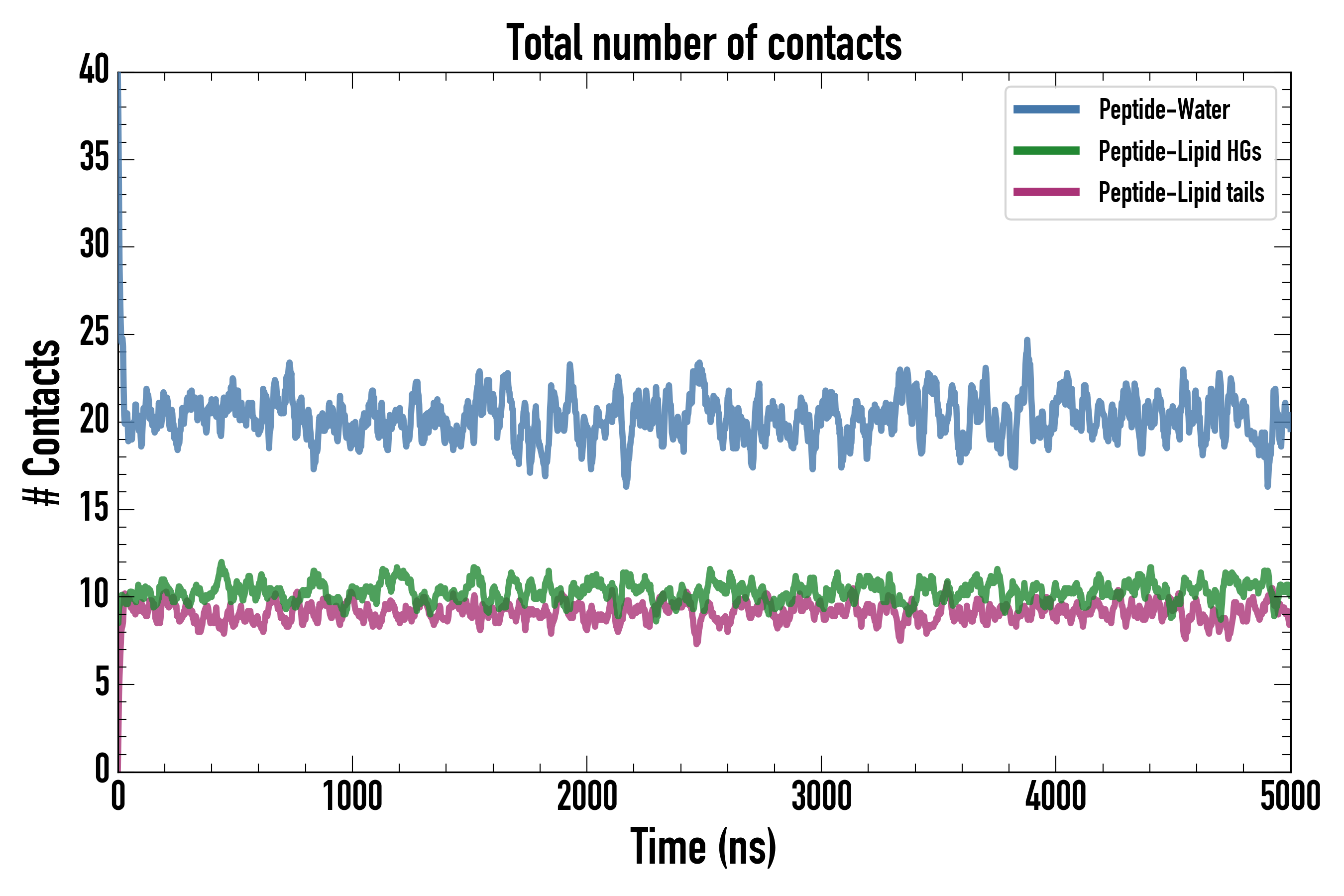 Number of contacts between each residue of the peptide backbone and the different lipid types, averaged over the last microsecond and using a cut-off of 0.6 nm.