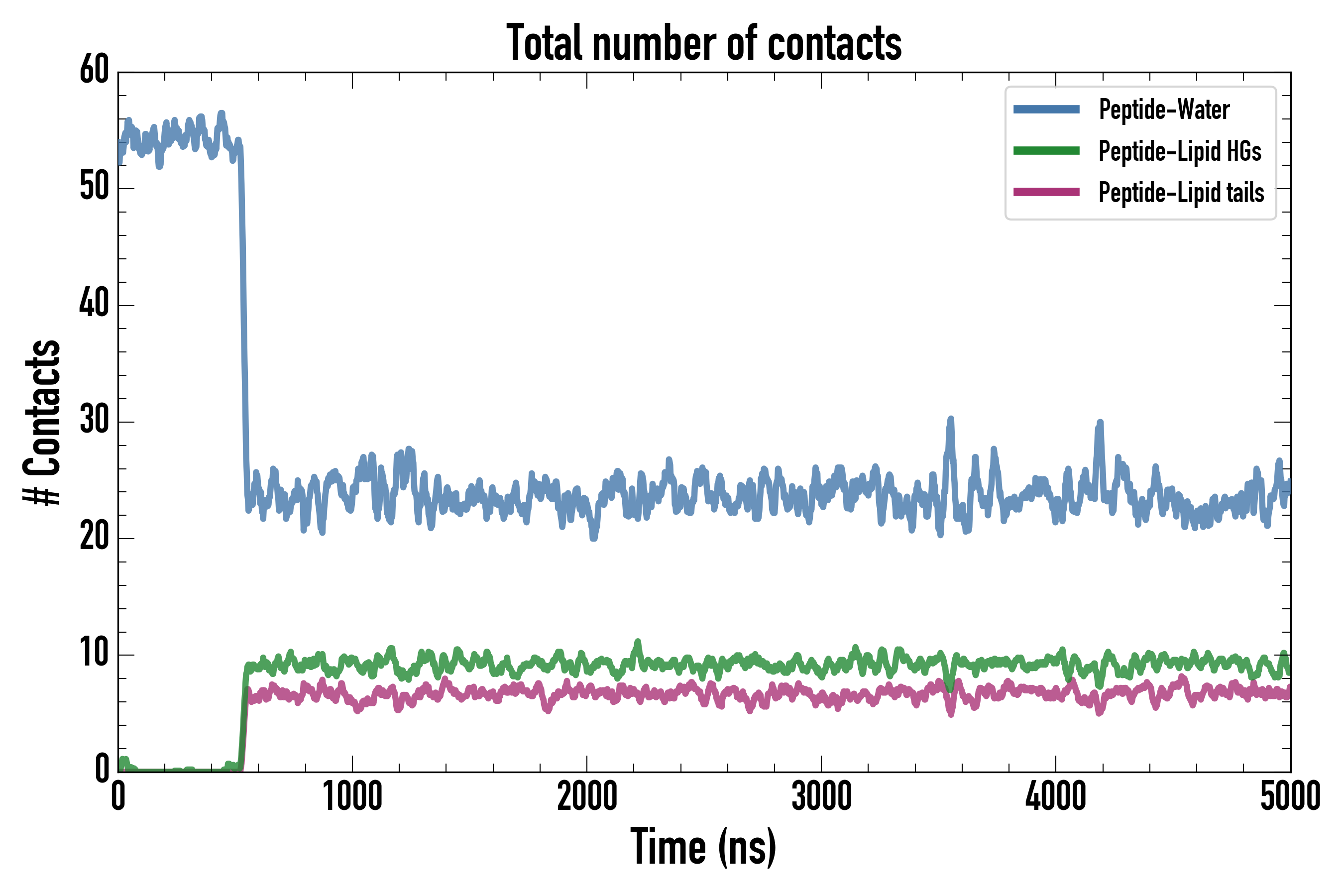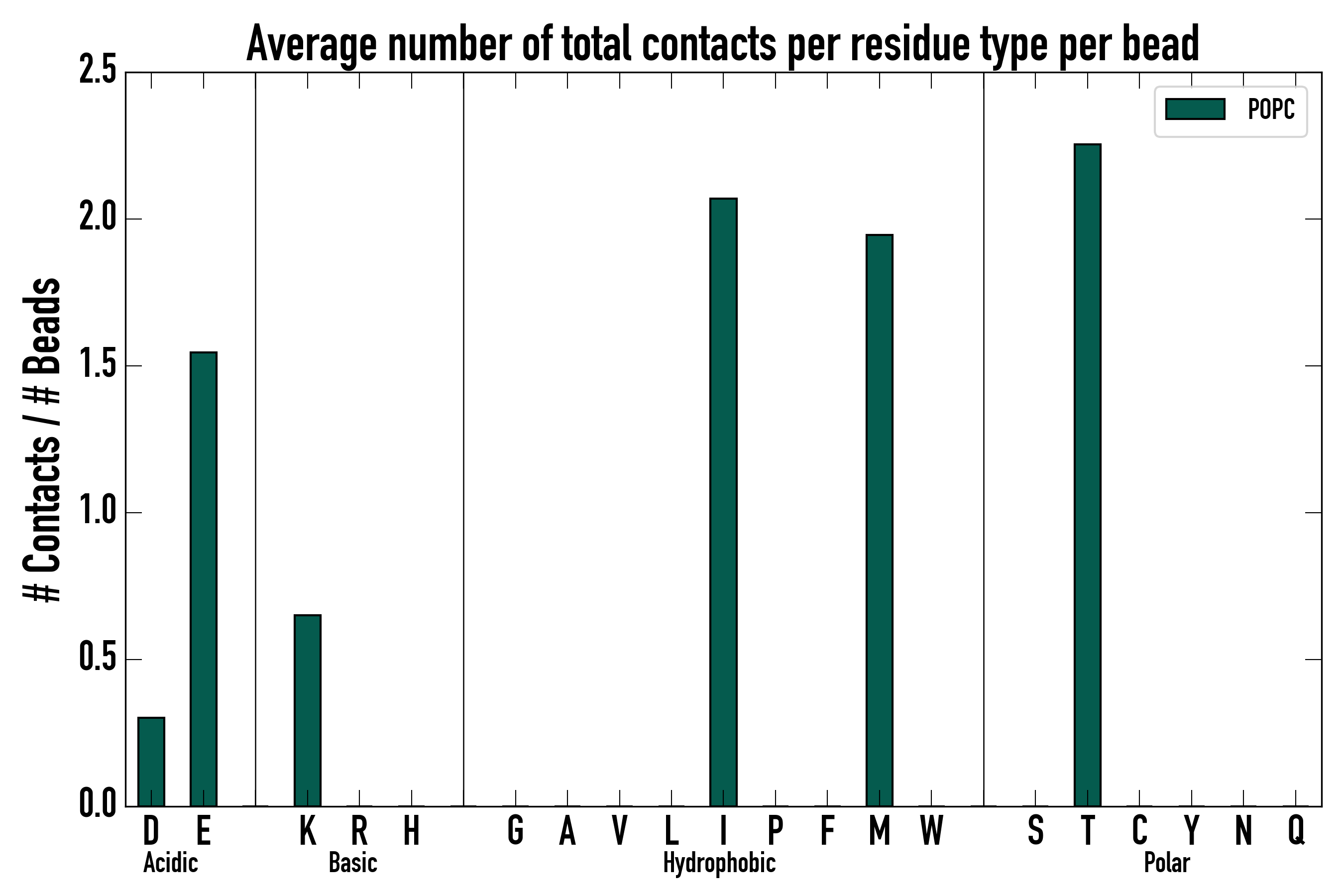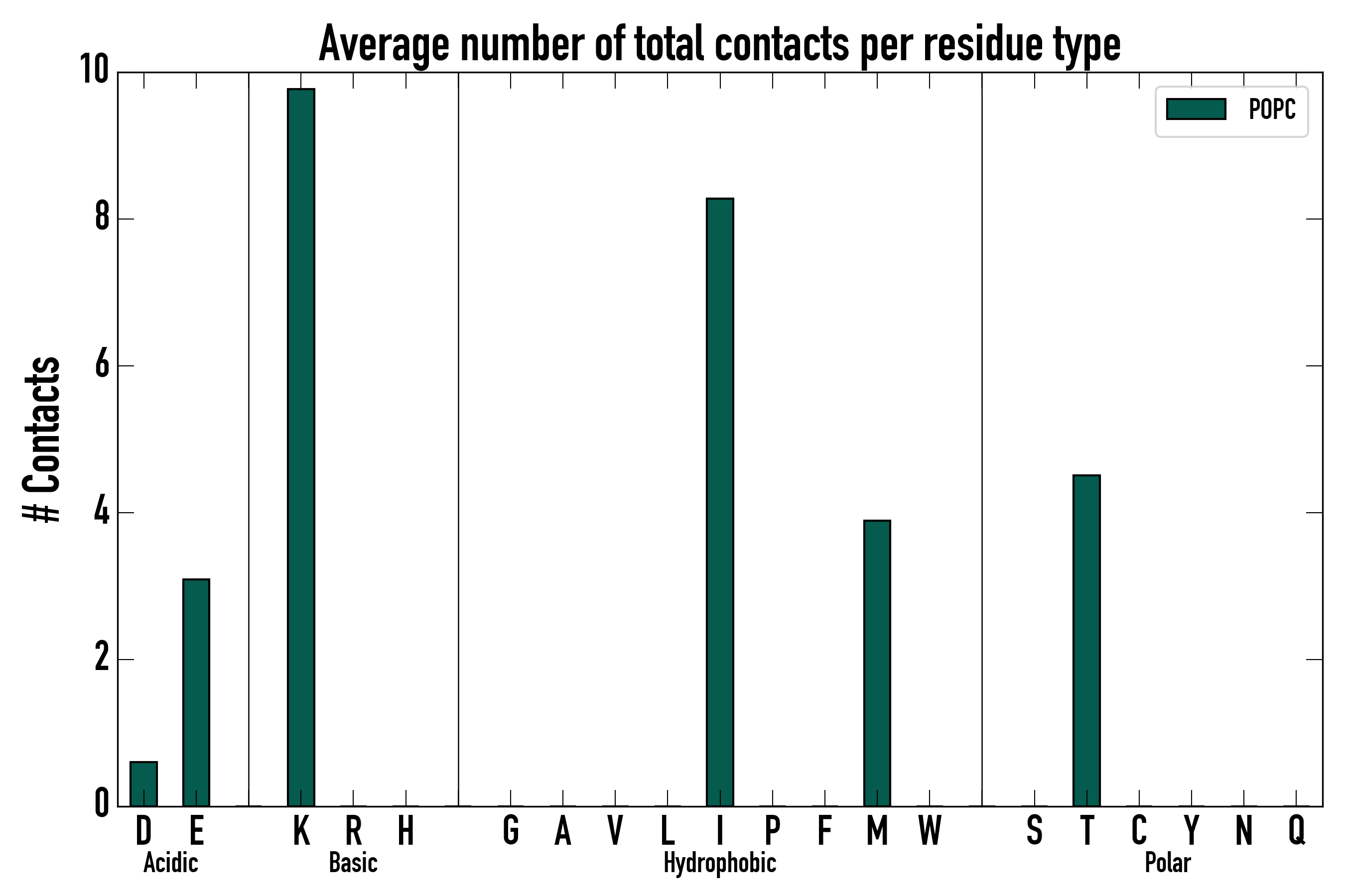 Number of contacts between each residue of the peptide backbone and the different lipid types, averaged over the last microsecond and using a cut-off of 0.6 nm.