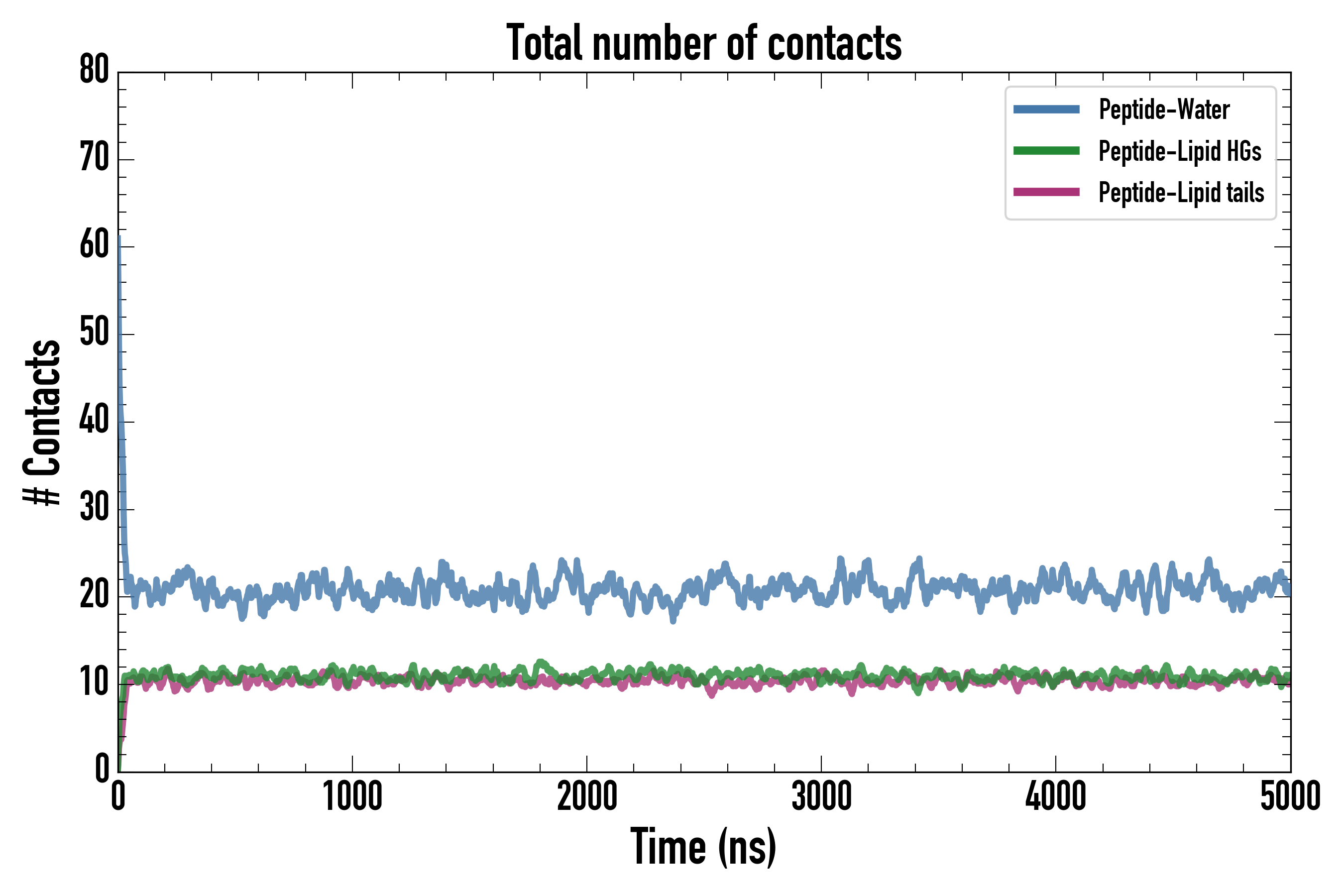 Number of contacts between each residue of the peptide backbone and the different lipid types, averaged over the last microsecond and using a cut-off of 0.6 nm.