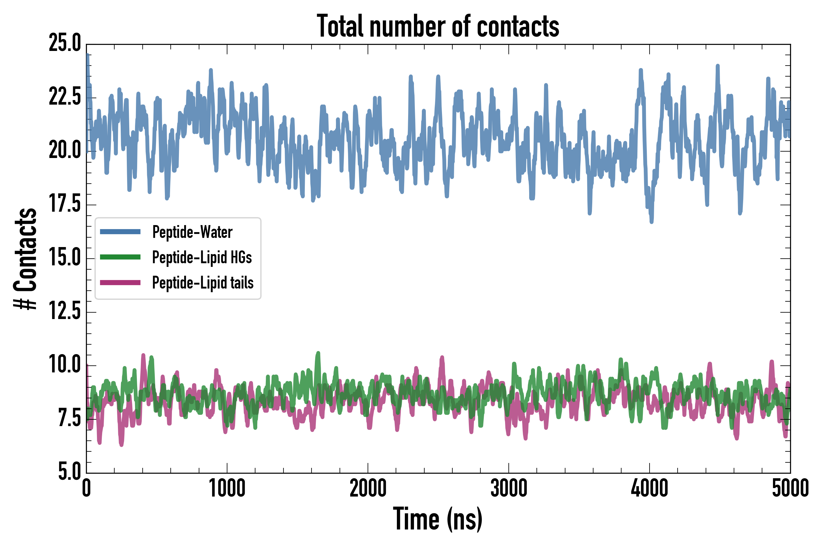 Number of contacts between each residue of the peptide backbone and the different lipid types, averaged over the last microsecond and using a cut-off of 0.6 nm.