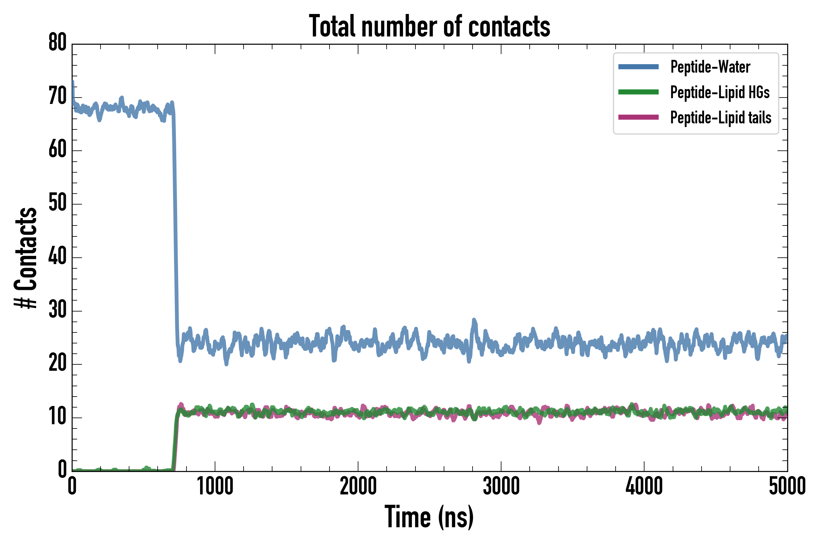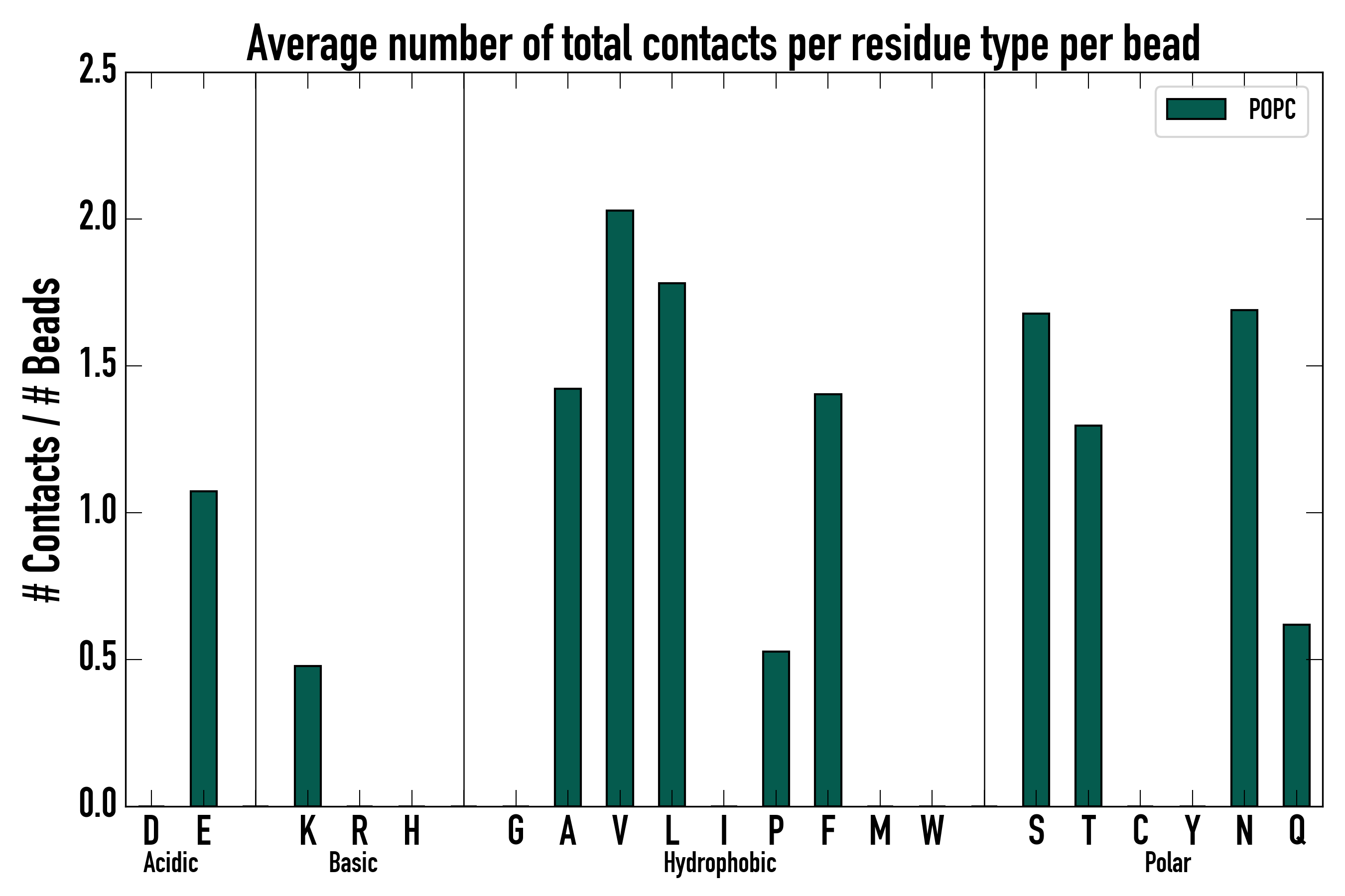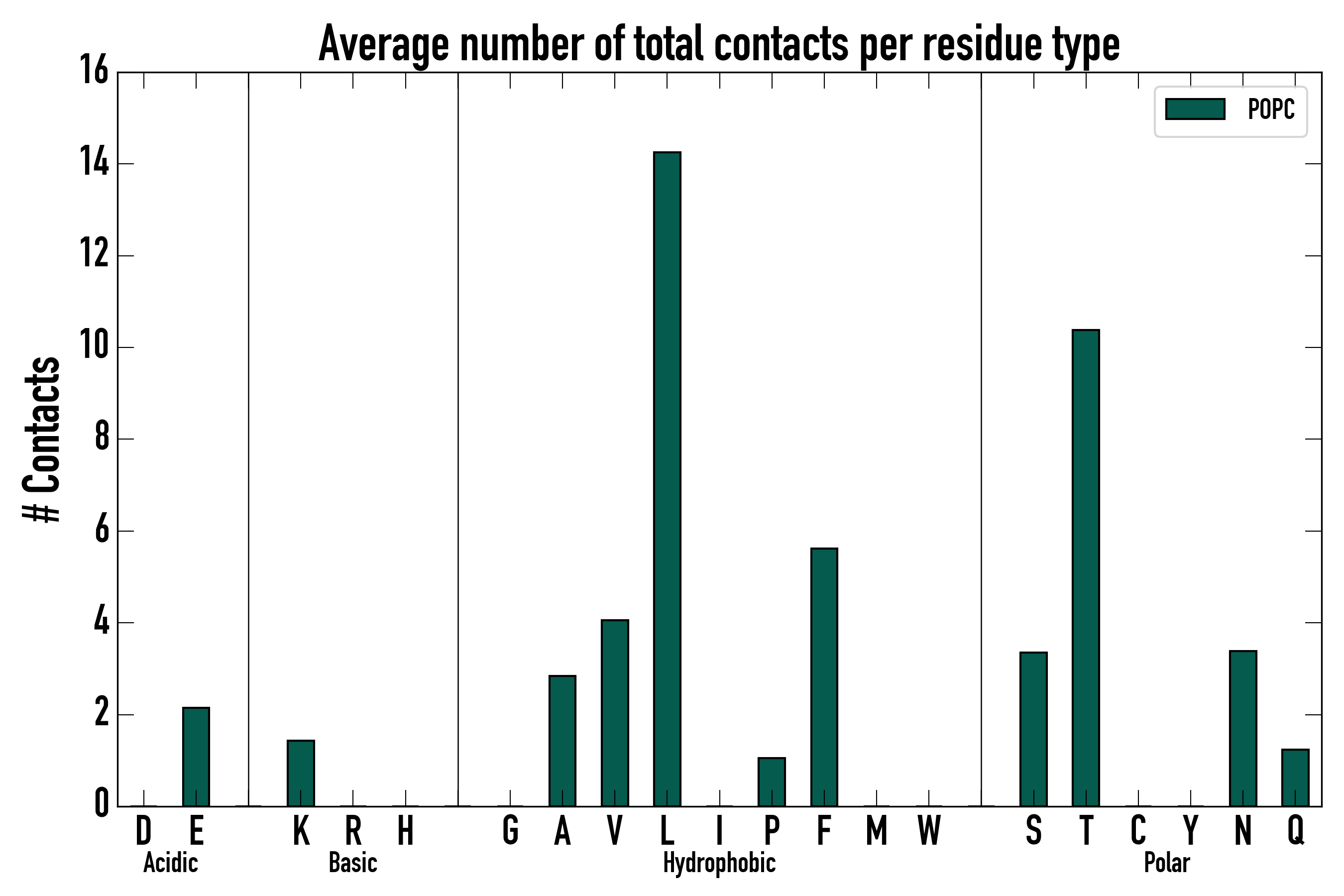 Number of contacts between each residue of the peptide backbone and the different lipid types, averaged over the last microsecond and using a cut-off of 0.6 nm.
