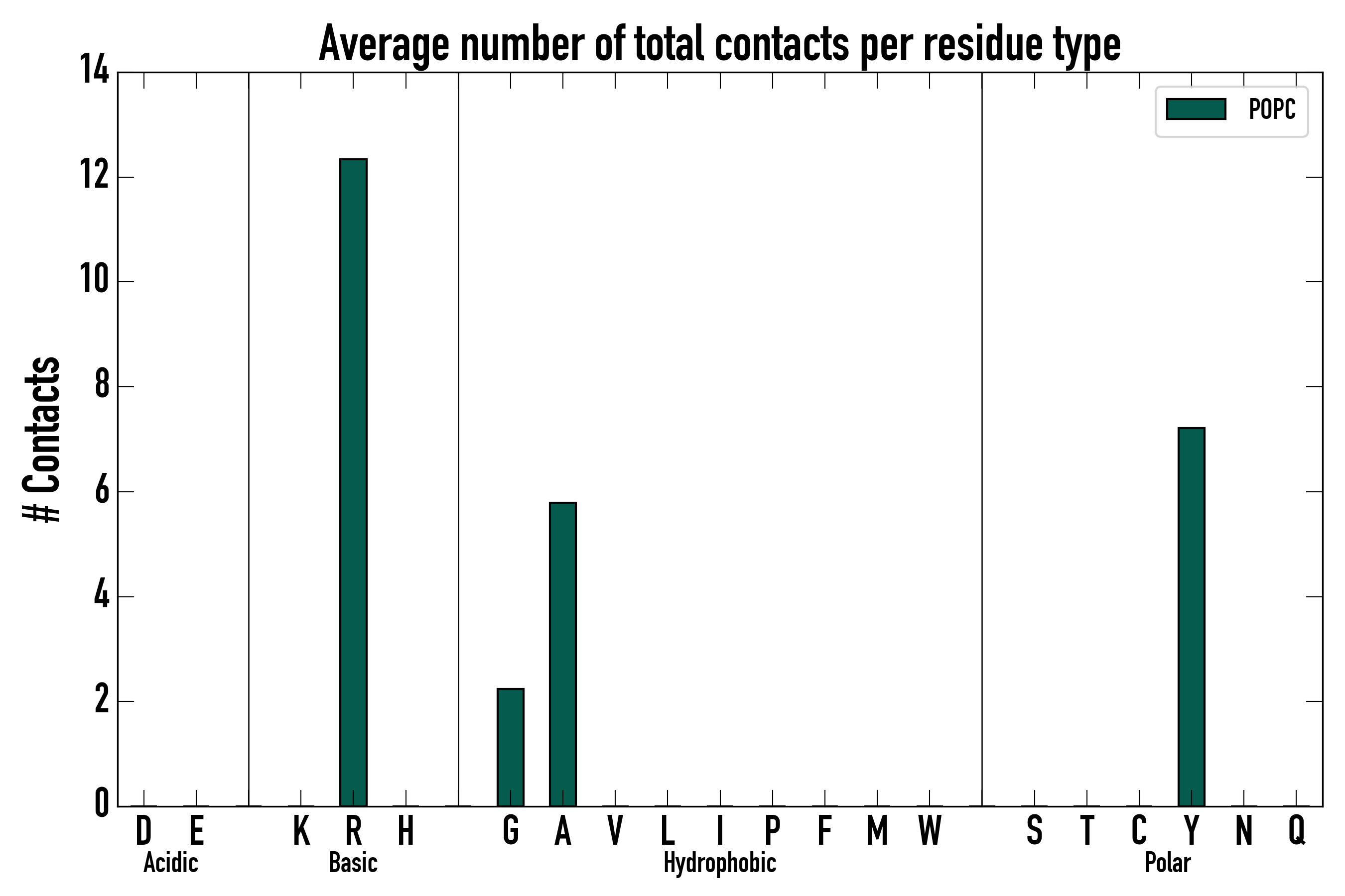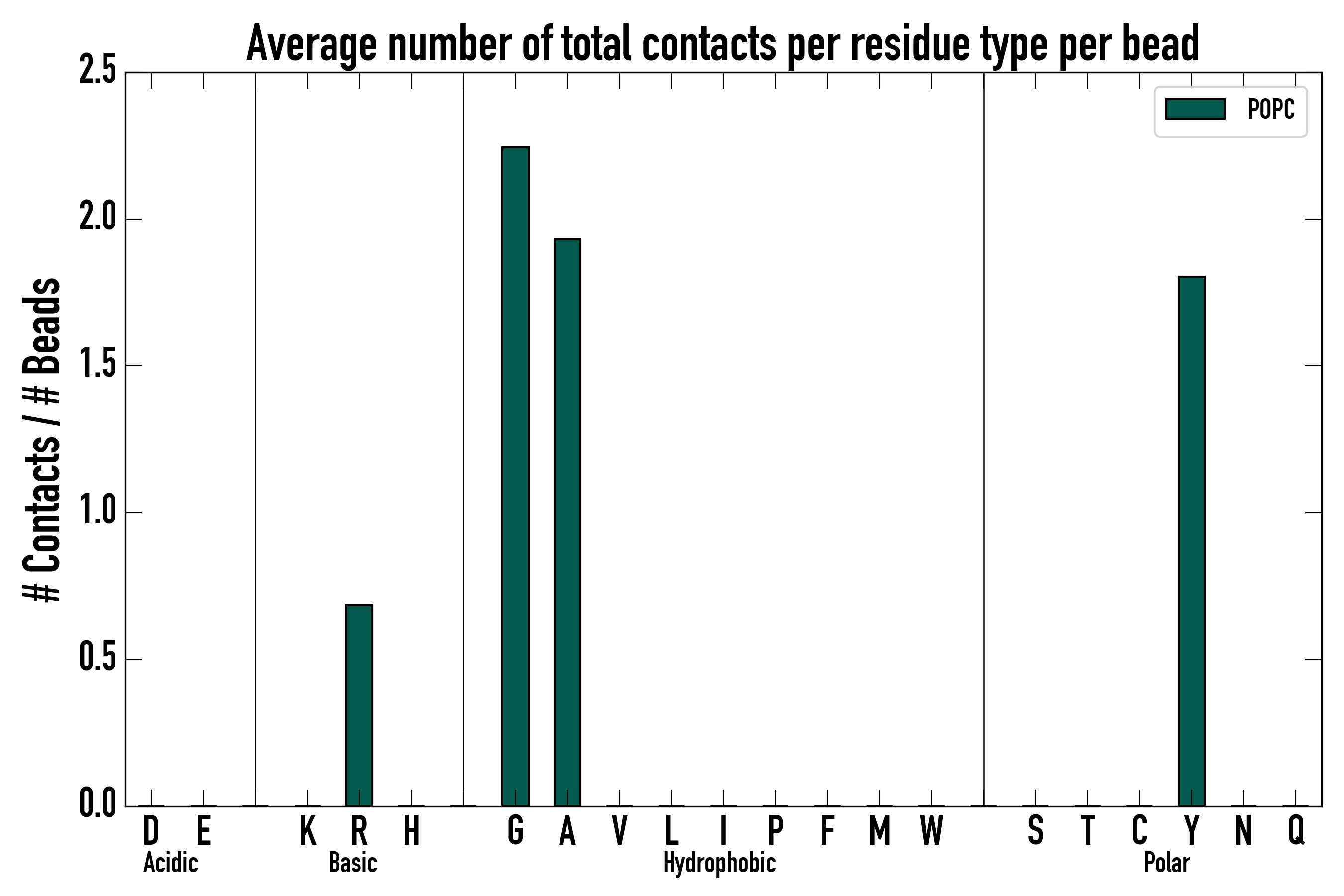 Number of contacts between each residue of the peptide backbone and the different lipid types, averaged over the last microsecond and using a cut-off of 0.6 nm.