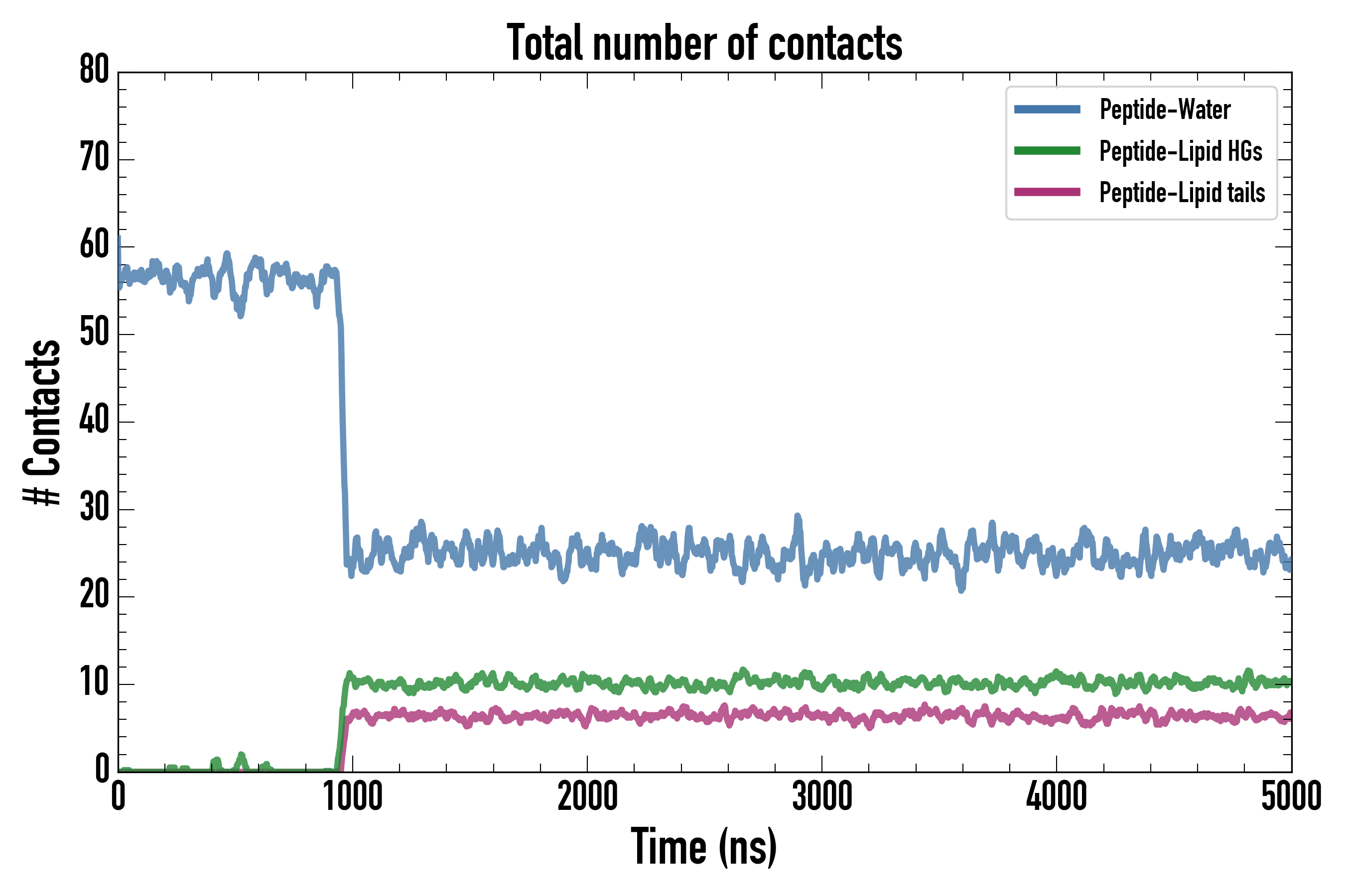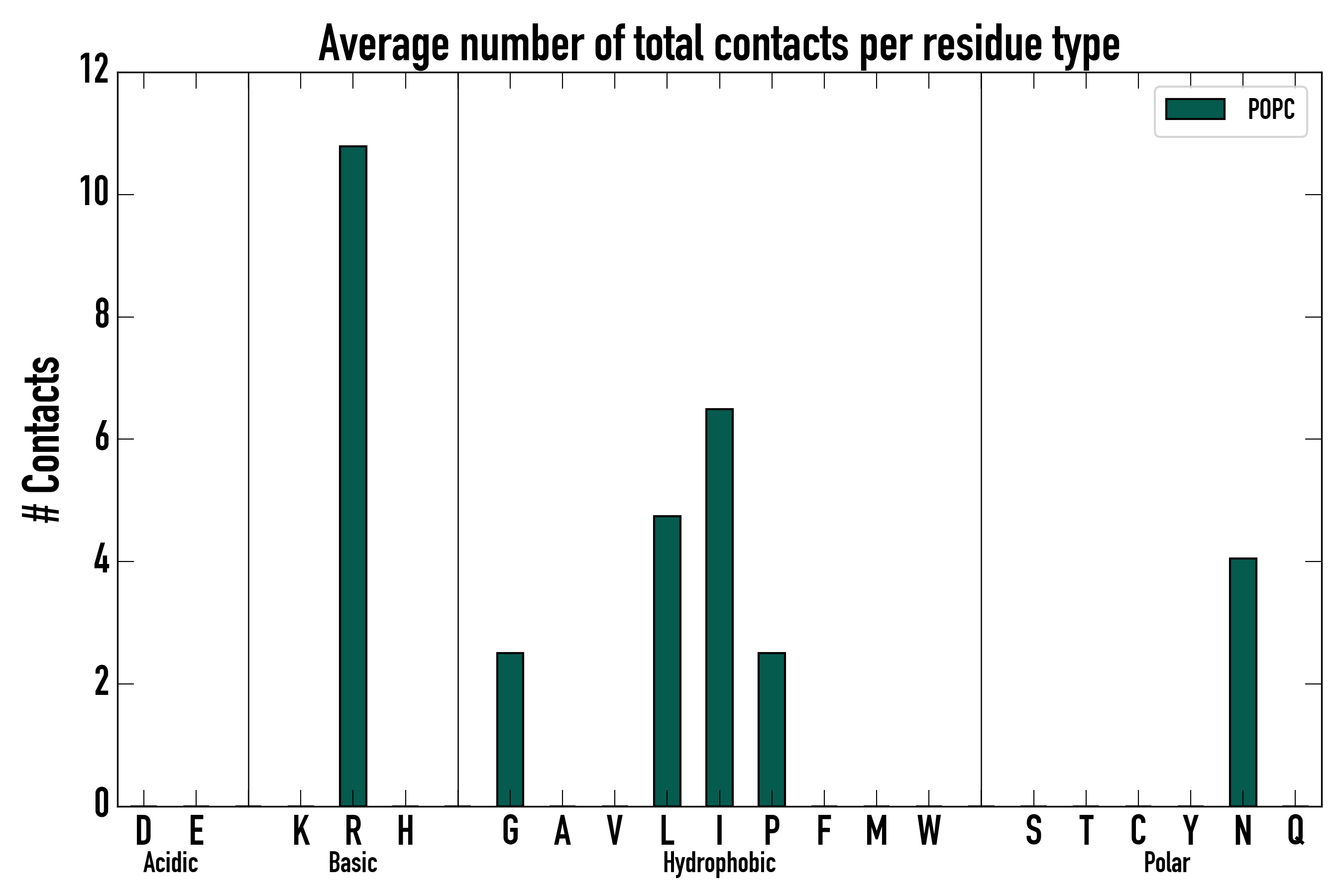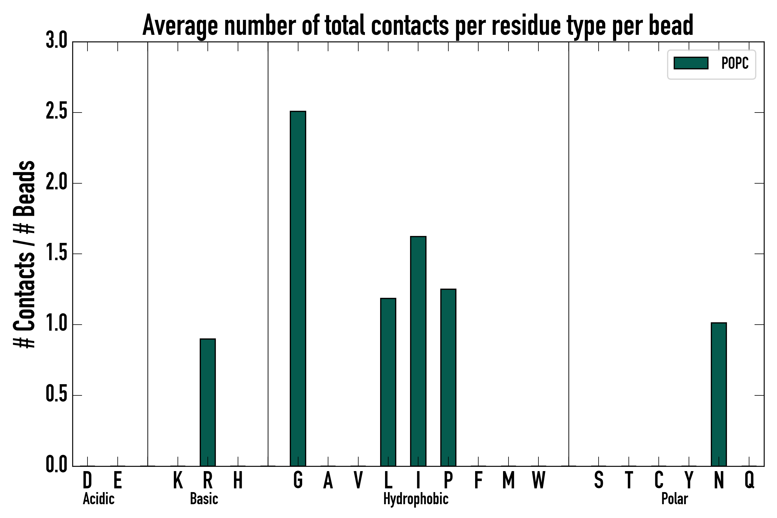 Number of contacts between each residue of the peptide backbone and the different lipid types, averaged over the last microsecond and using a cut-off of 0.6 nm.