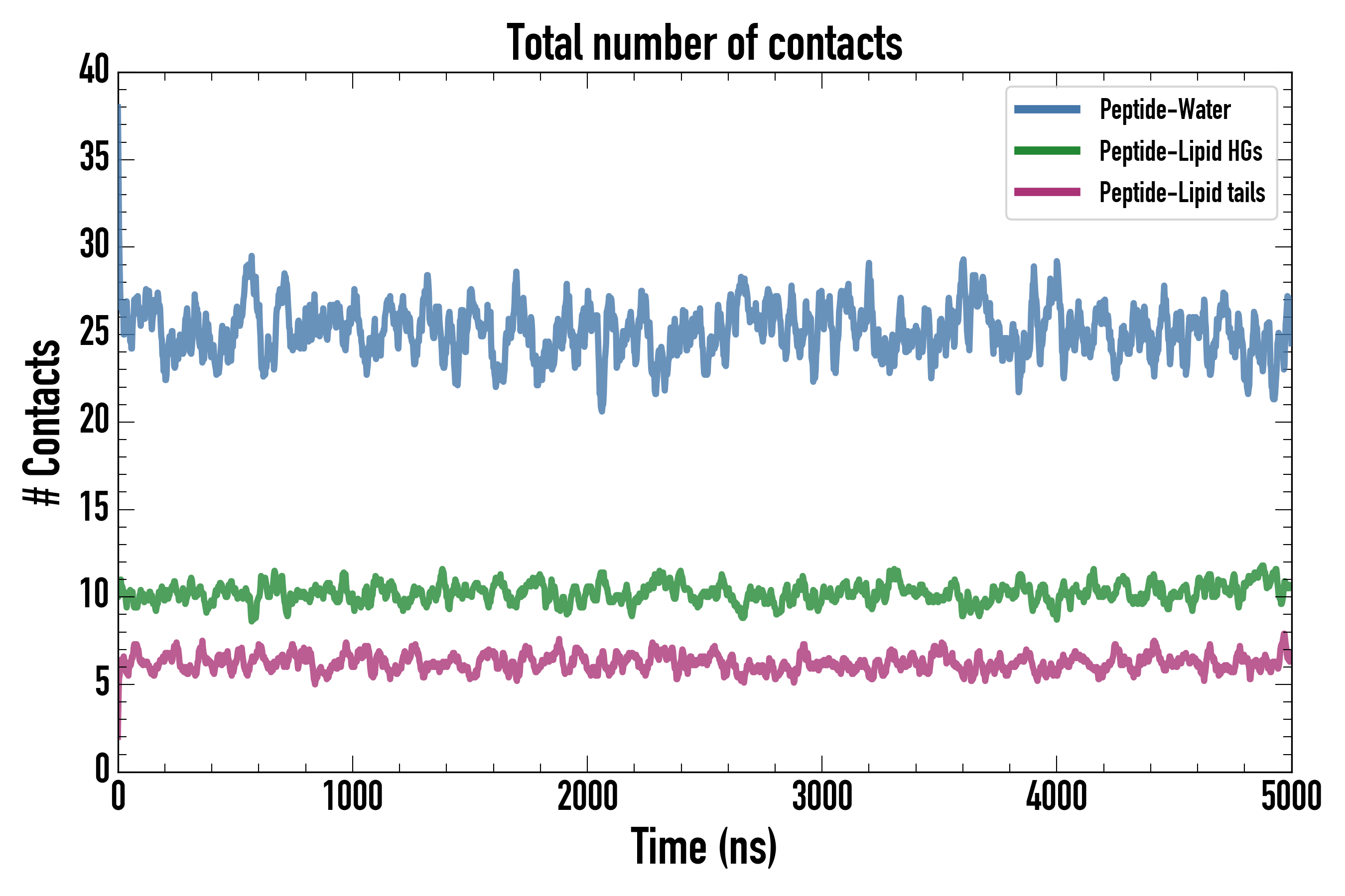 Number of contacts between each residue of the peptide backbone and the different lipid types, averaged over the last microsecond and using a cut-off of 0.6 nm.