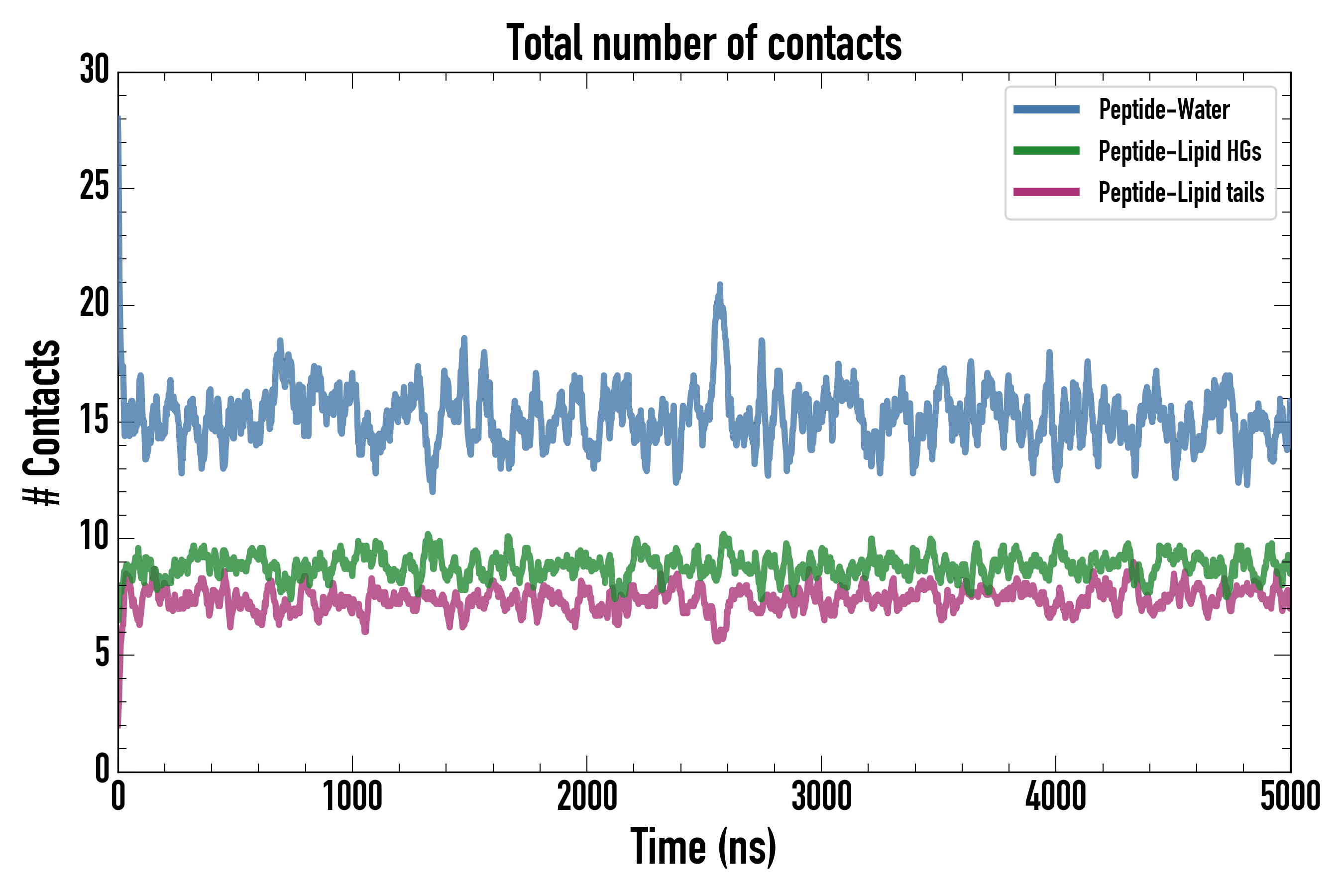 Number of contacts between each residue of the peptide backbone and the different lipid types, averaged over the last microsecond and using a cut-off of 0.6 nm.
