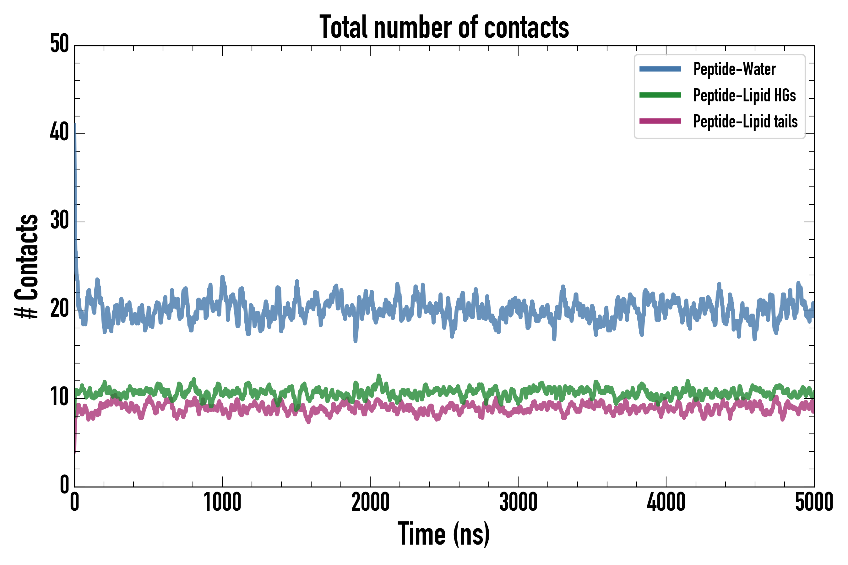 Number of contacts between each residue of the peptide backbone and the different lipid types, averaged over the last microsecond and using a cut-off of 0.6 nm.