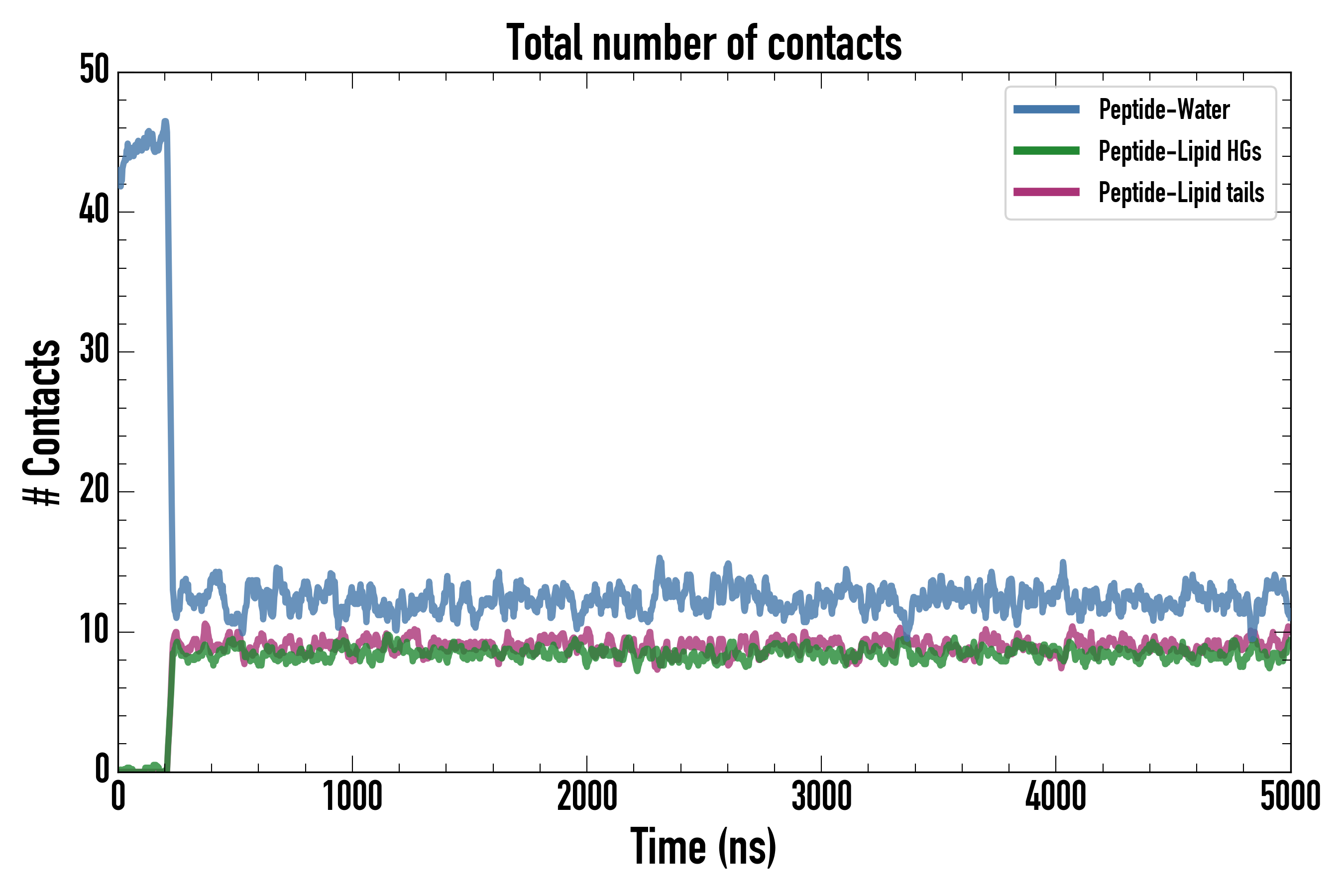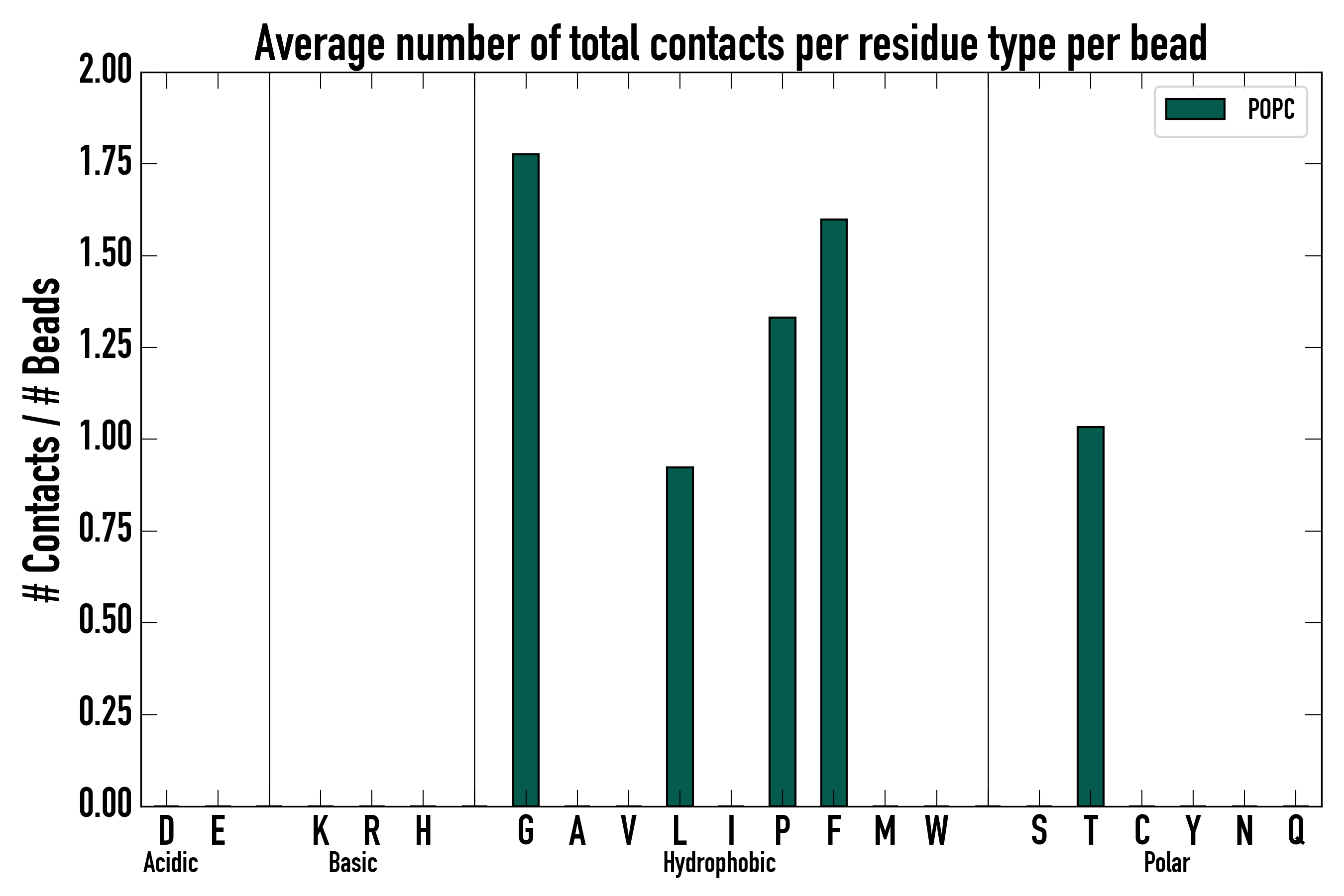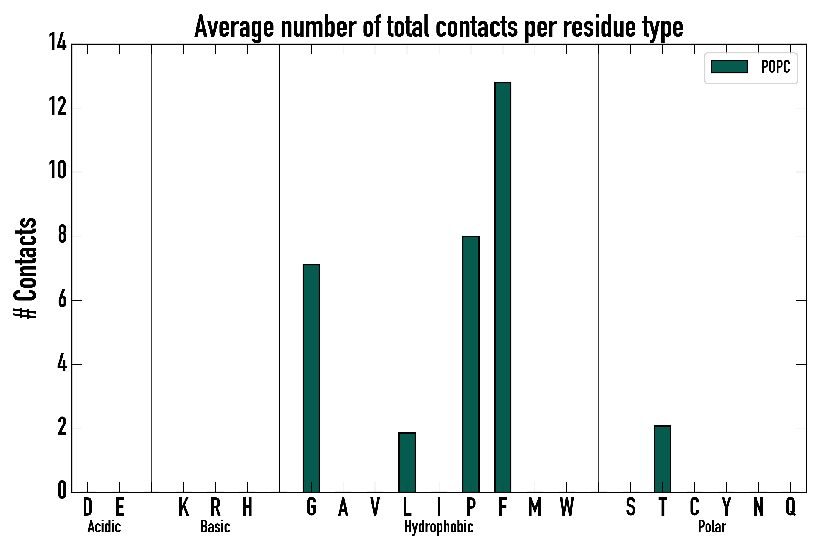 Number of contacts between each residue of the peptide backbone and the different lipid types, averaged over the last microsecond and using a cut-off of 0.6 nm.