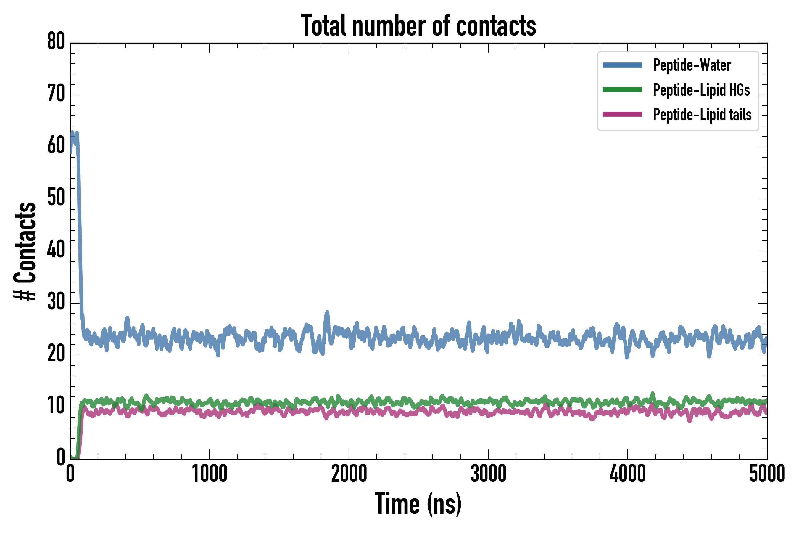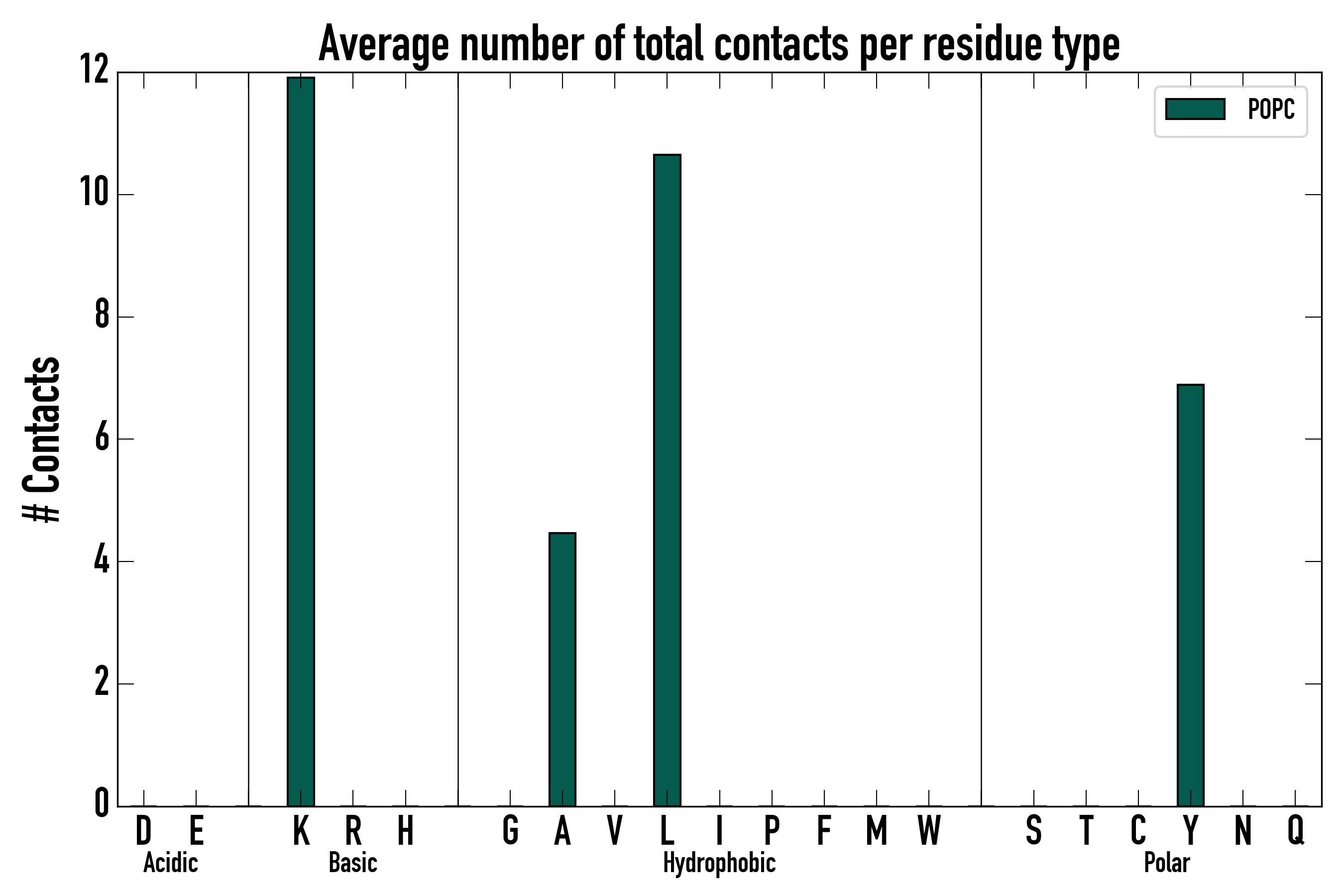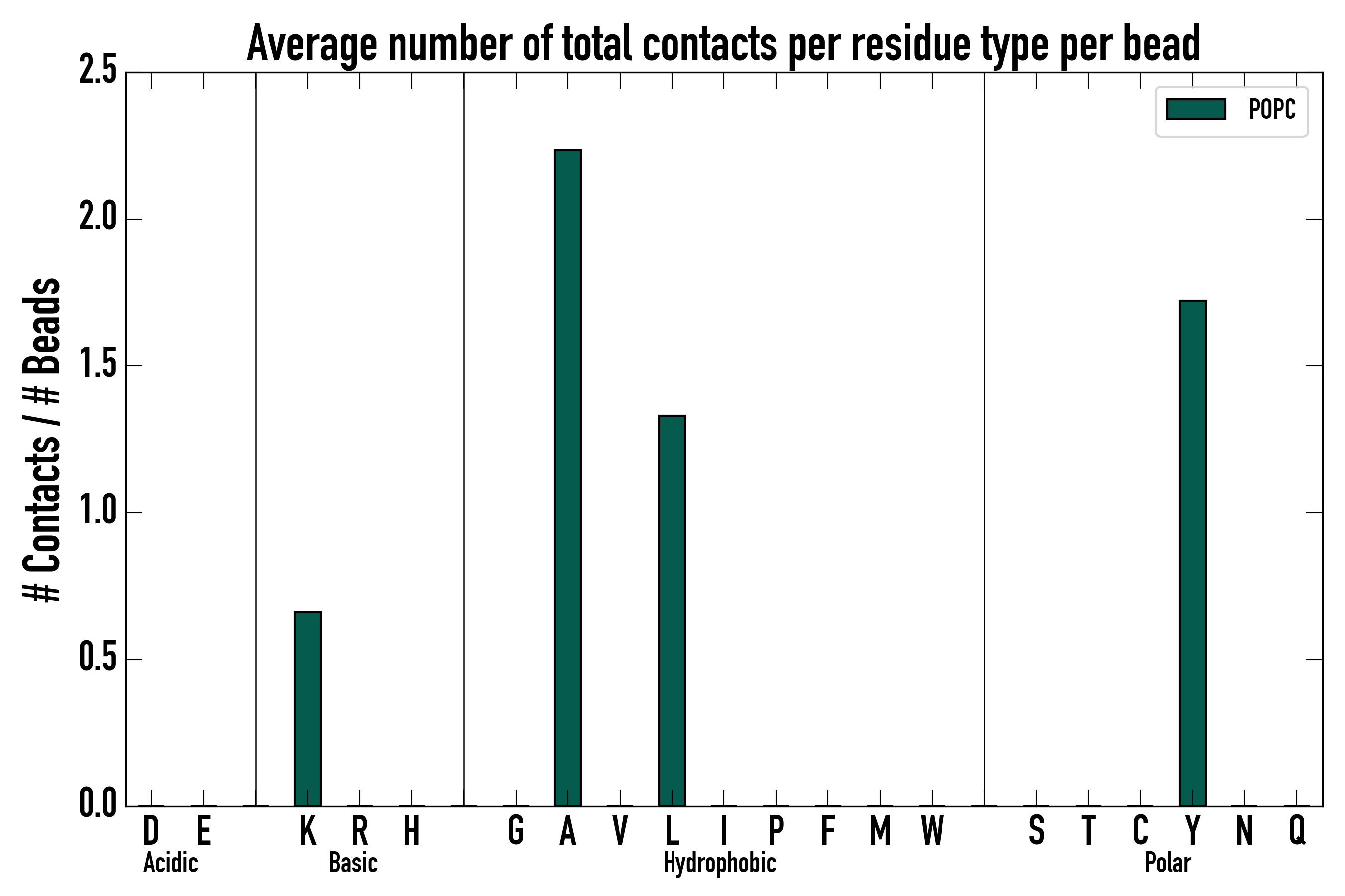 Number of contacts between each residue of the peptide backbone and the different lipid types, averaged over the last microsecond and using a cut-off of 0.6 nm.