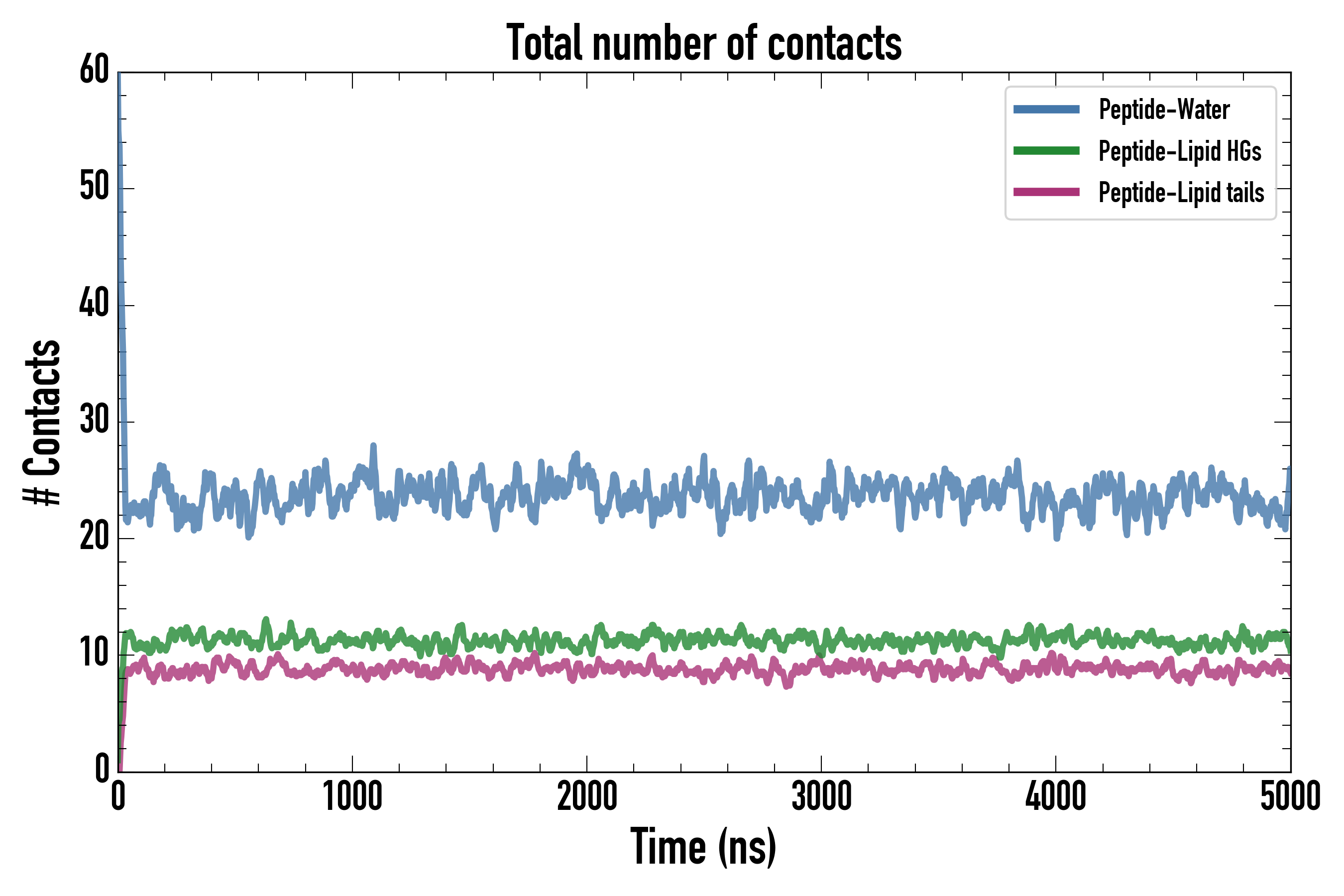 Number of contacts between each residue of the peptide backbone and the different lipid types, averaged over the last microsecond and using a cut-off of 0.6 nm.
