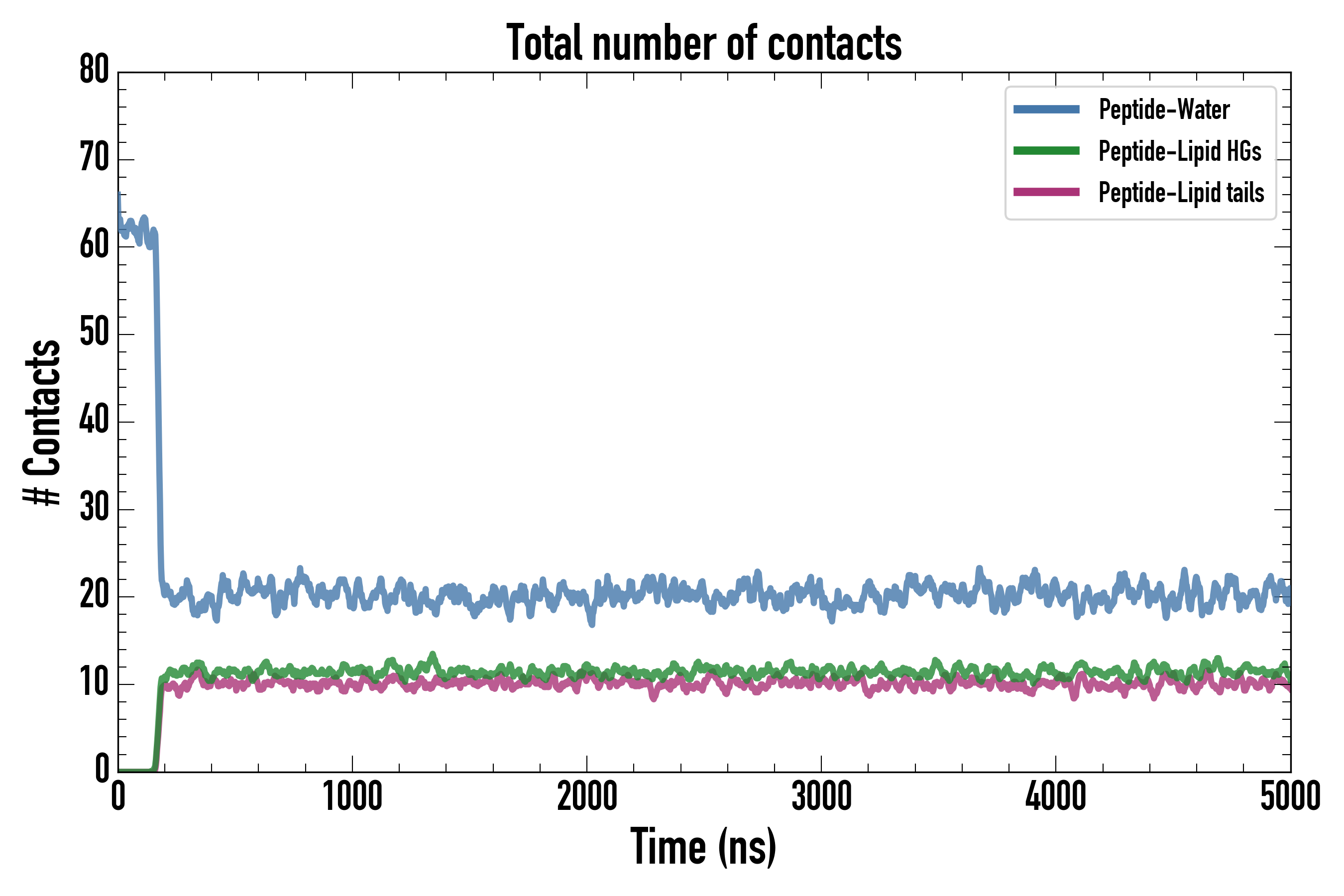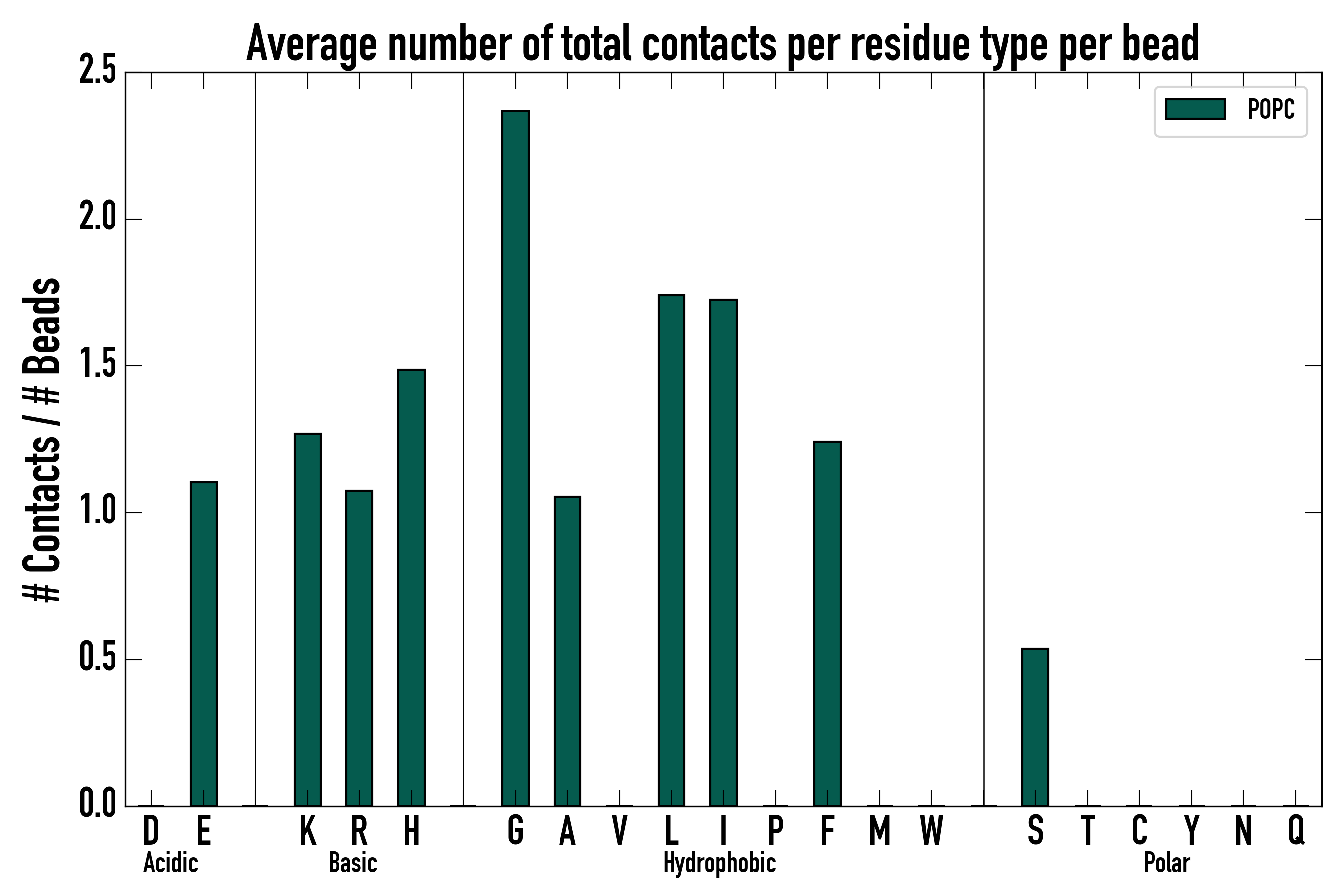 Number of contacts between each residue of the peptide backbone and the different lipid types, averaged over the last microsecond and using a cut-off of 0.6 nm.