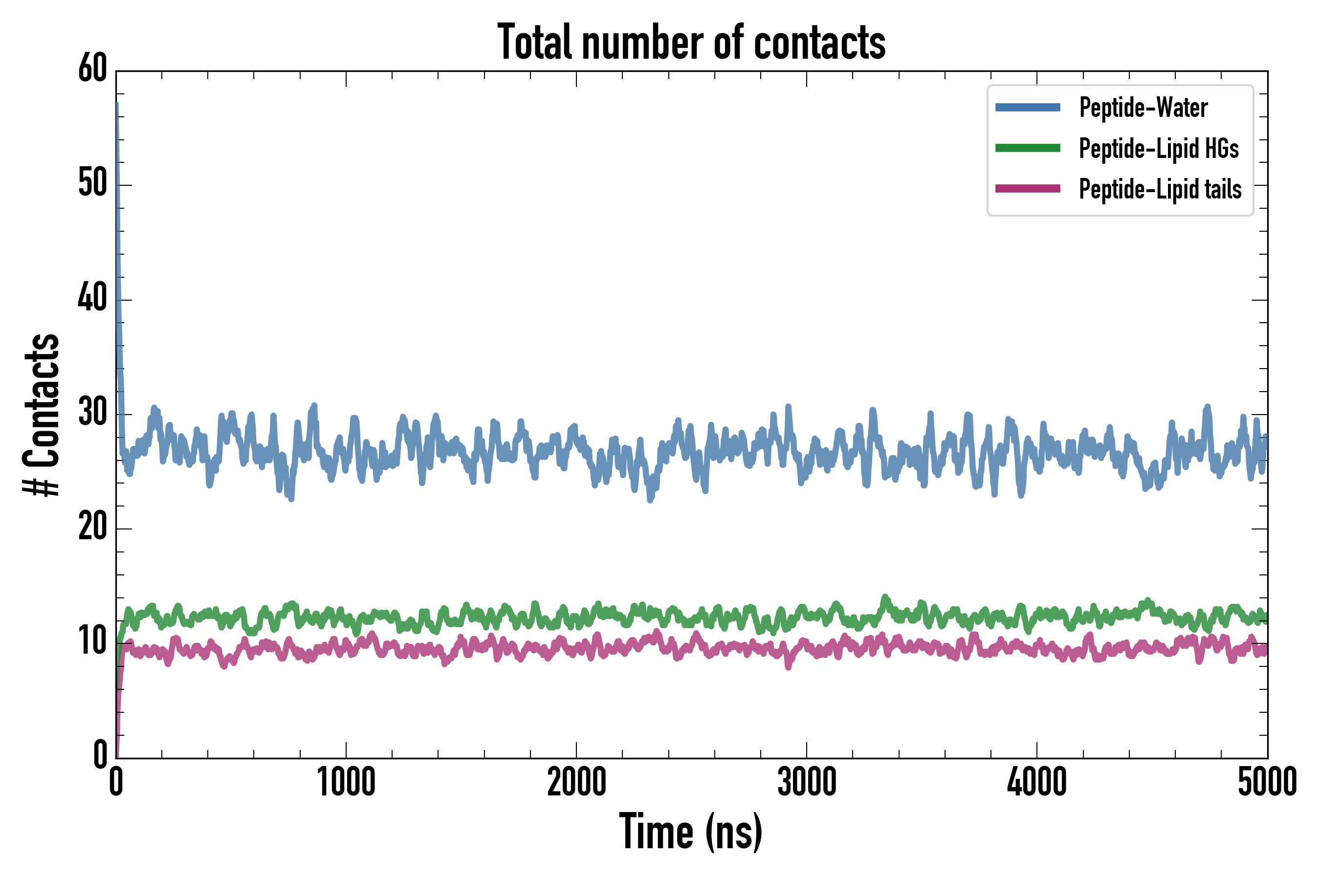 Number of contacts between each residue of the peptide backbone and the different lipid types, averaged over the last microsecond and using a cut-off of 0.6 nm.