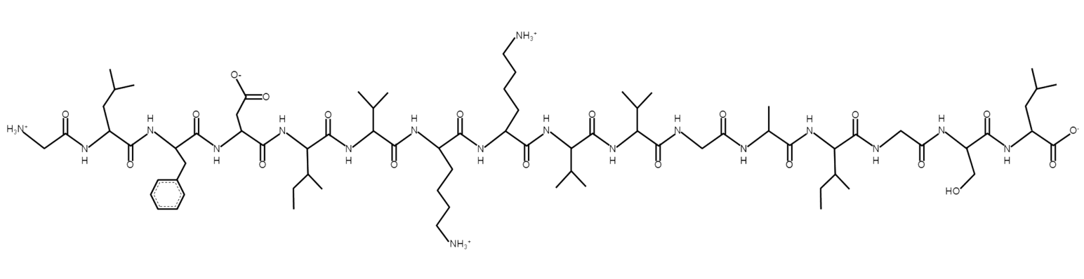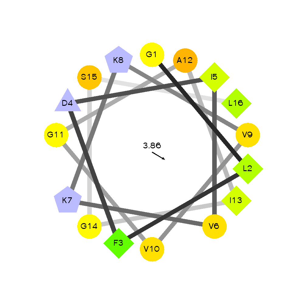 By amino acid: Basic: 2 Acidic: 1 Hydrophobic: 12 Polar: 1 Electrostatic Dipolar Moment (e nm): 2.54