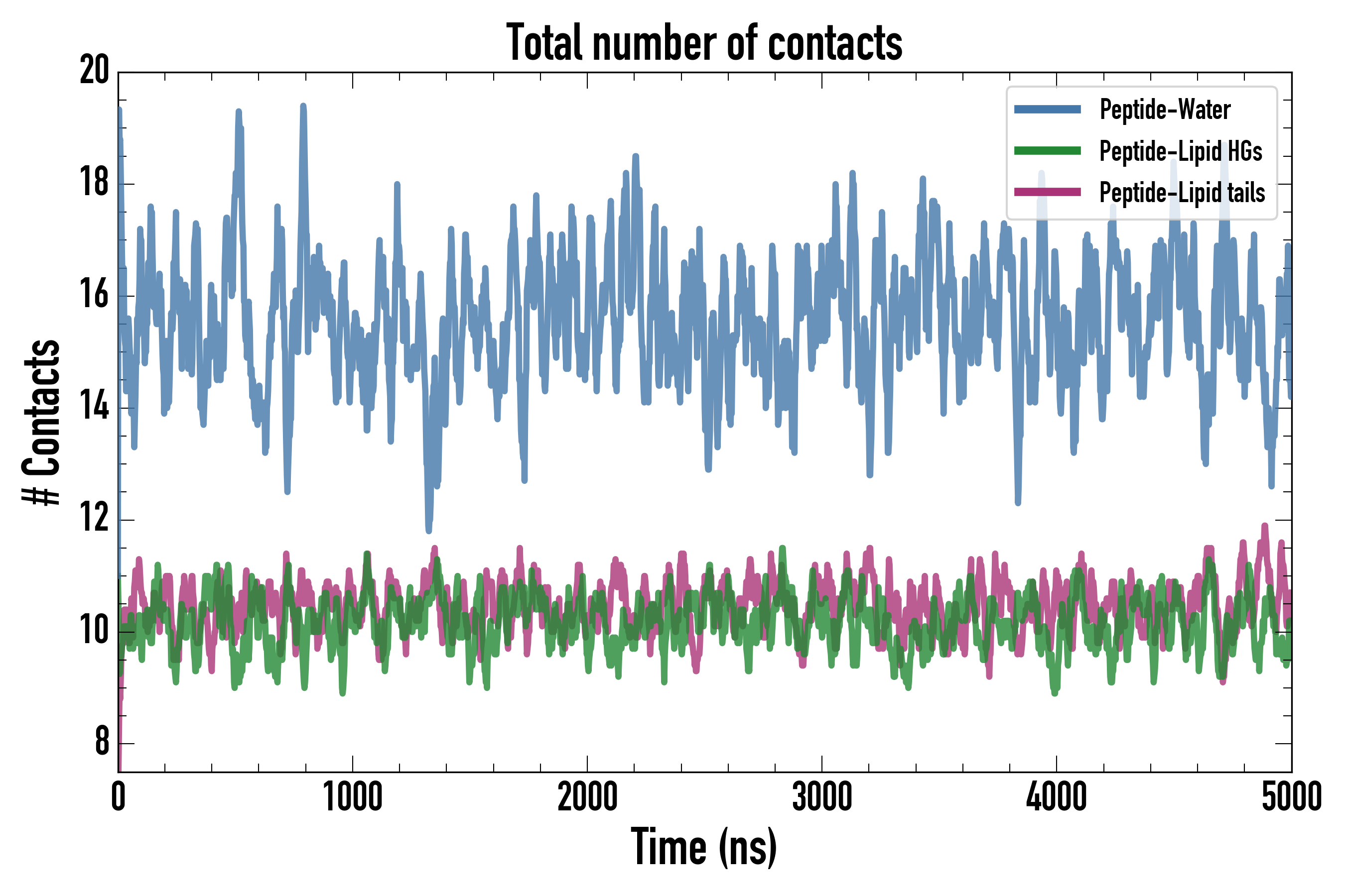 Number of contacts between each residue of the peptide backbone and the different lipid types, averaged over the last microsecond and using a cut-off of 0.6 nm.