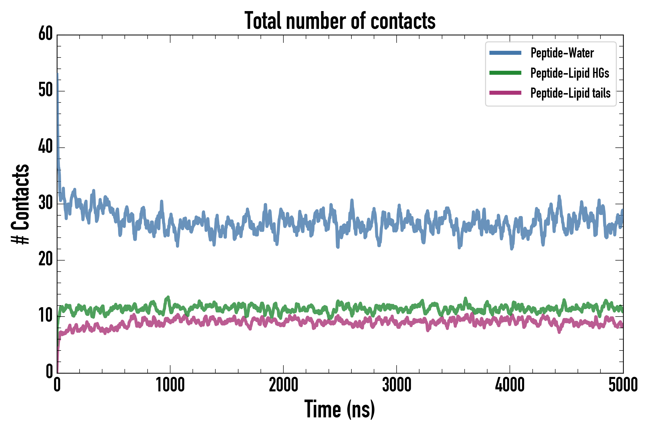 Number of contacts between each residue of the peptide backbone and the different lipid types, averaged over the last microsecond and using a cut-off of 0.6 nm.