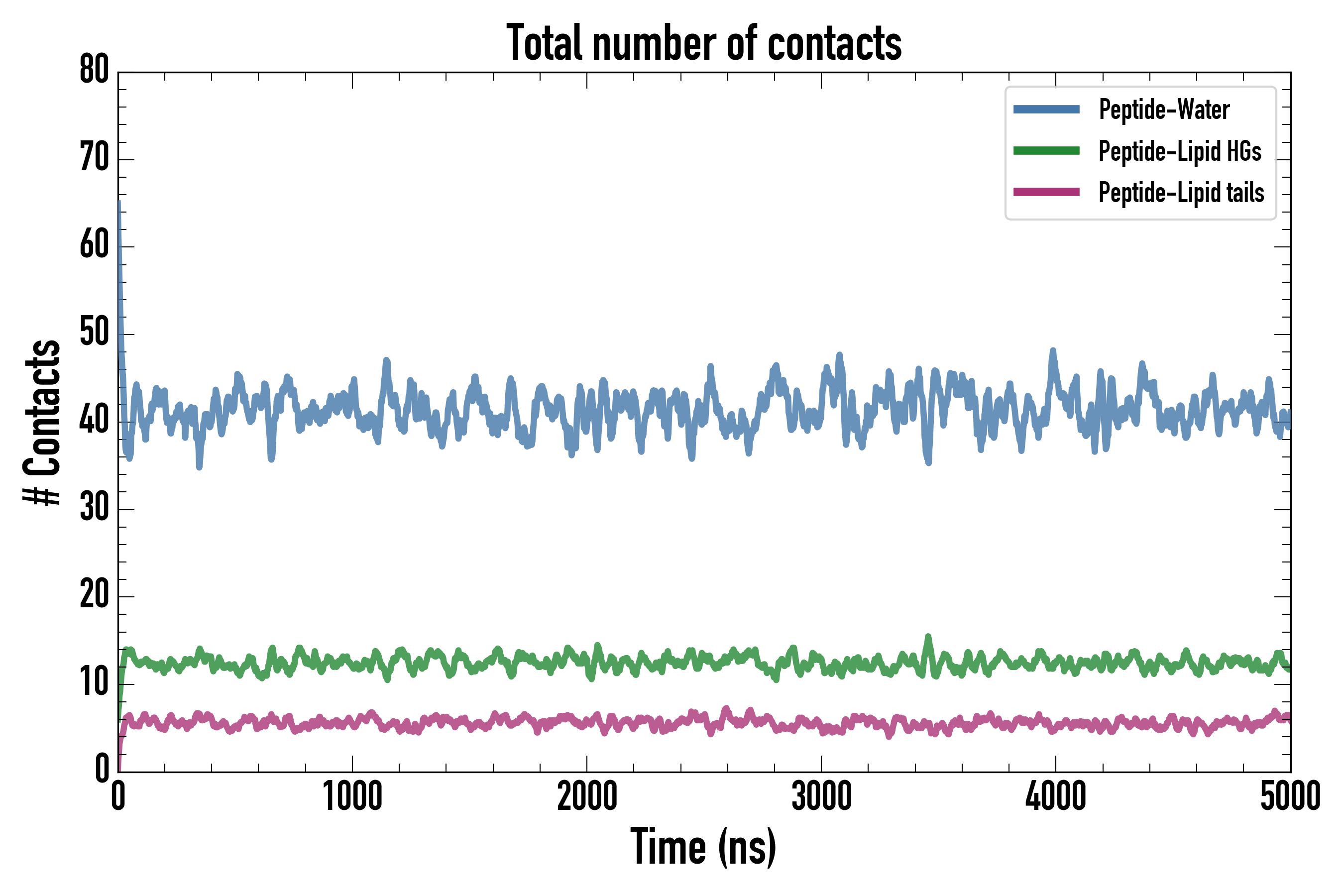 Number of contacts between each residue of the peptide backbone and the different lipid types, averaged over the last microsecond and using a cut-off of 0.6 nm.