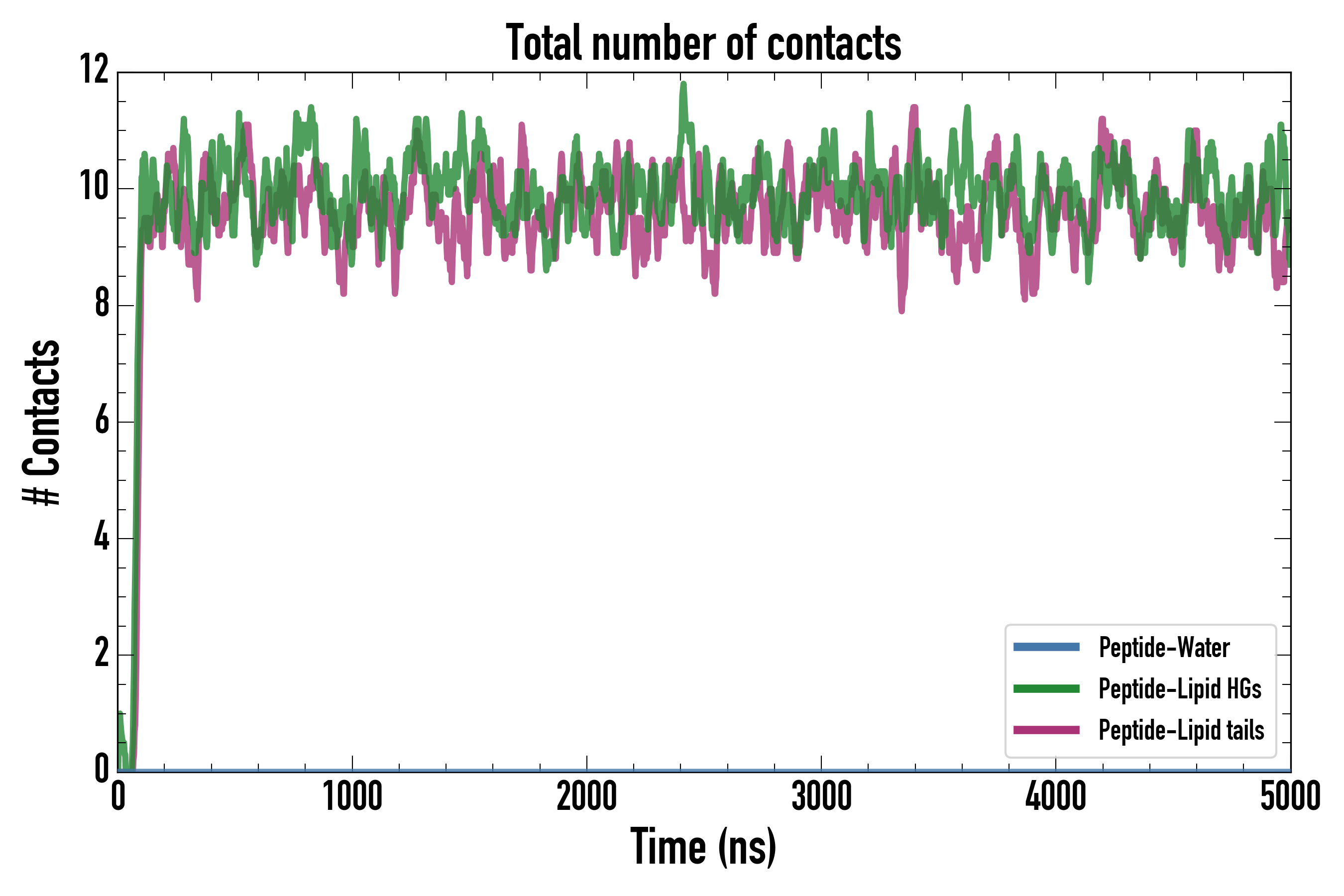 Number of contacts between each residue of the peptide backbone and the different lipid types, averaged over the last microsecond and using a cut-off of 0.6 nm.