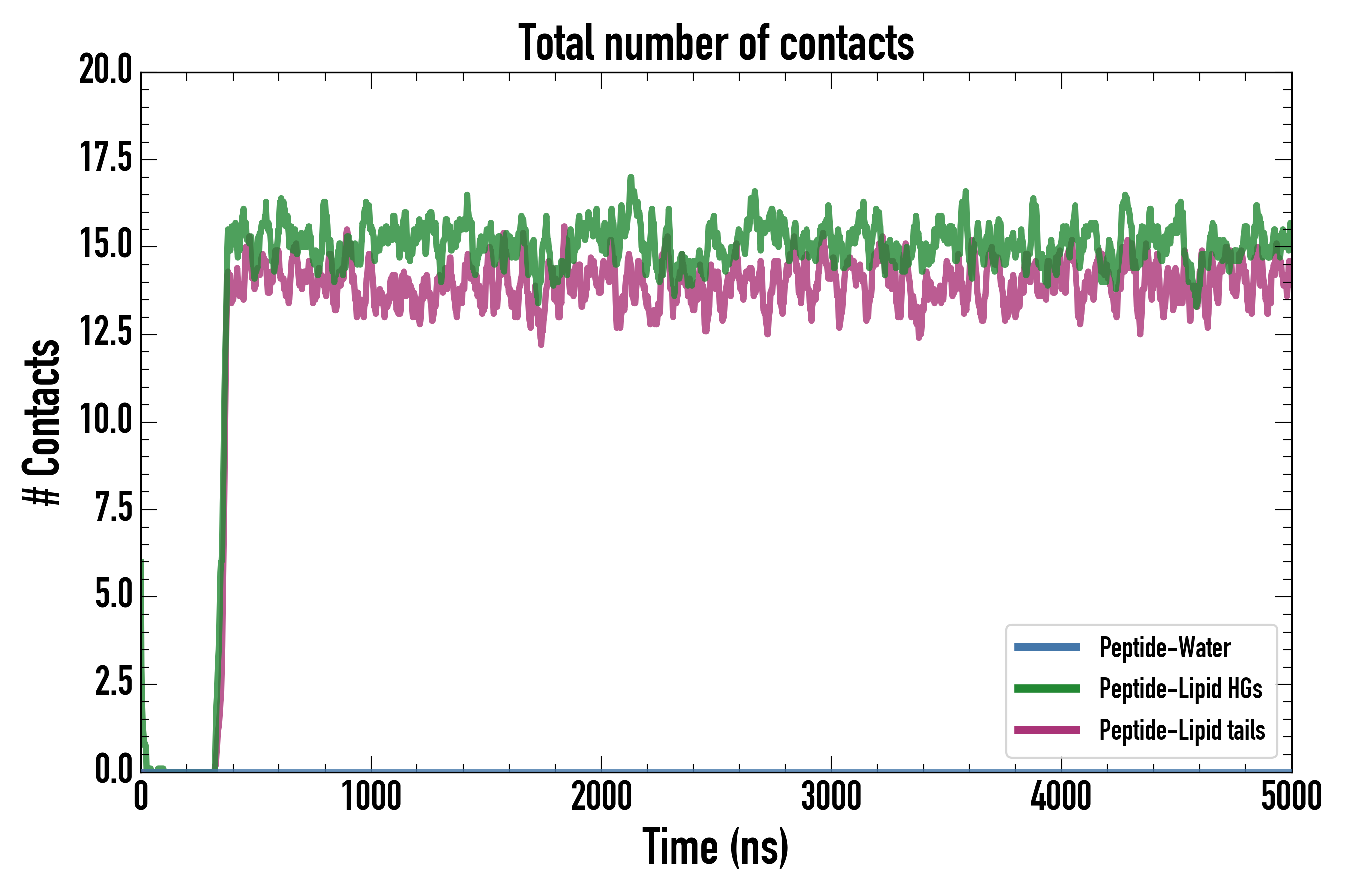 Number of contacts between each residue of the peptide backbone and the different lipid types, averaged over the last microsecond and using a cut-off of 0.6 nm.