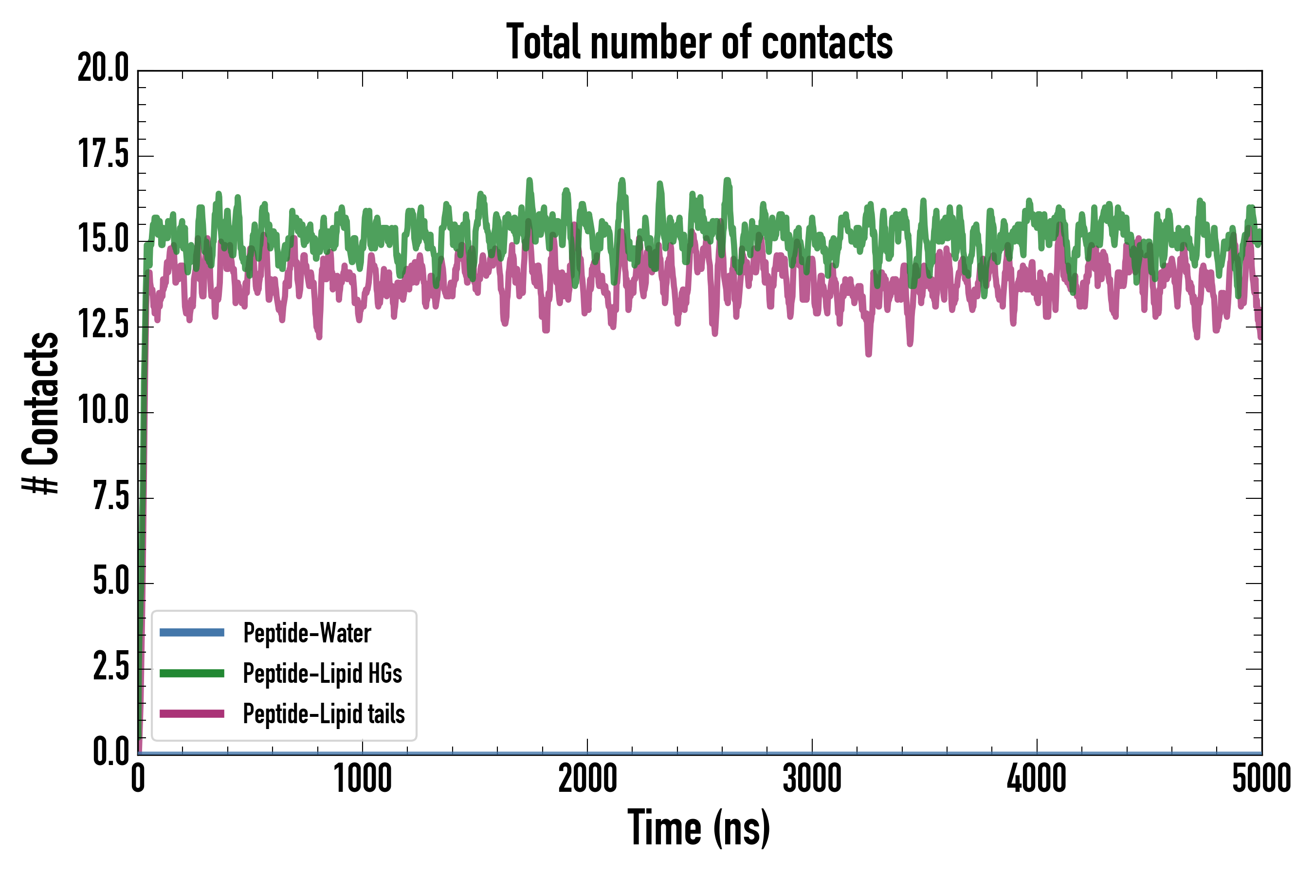 Number of contacts between each residue of the peptide backbone and the different lipid types, averaged over the last microsecond and using a cut-off of 0.6 nm.