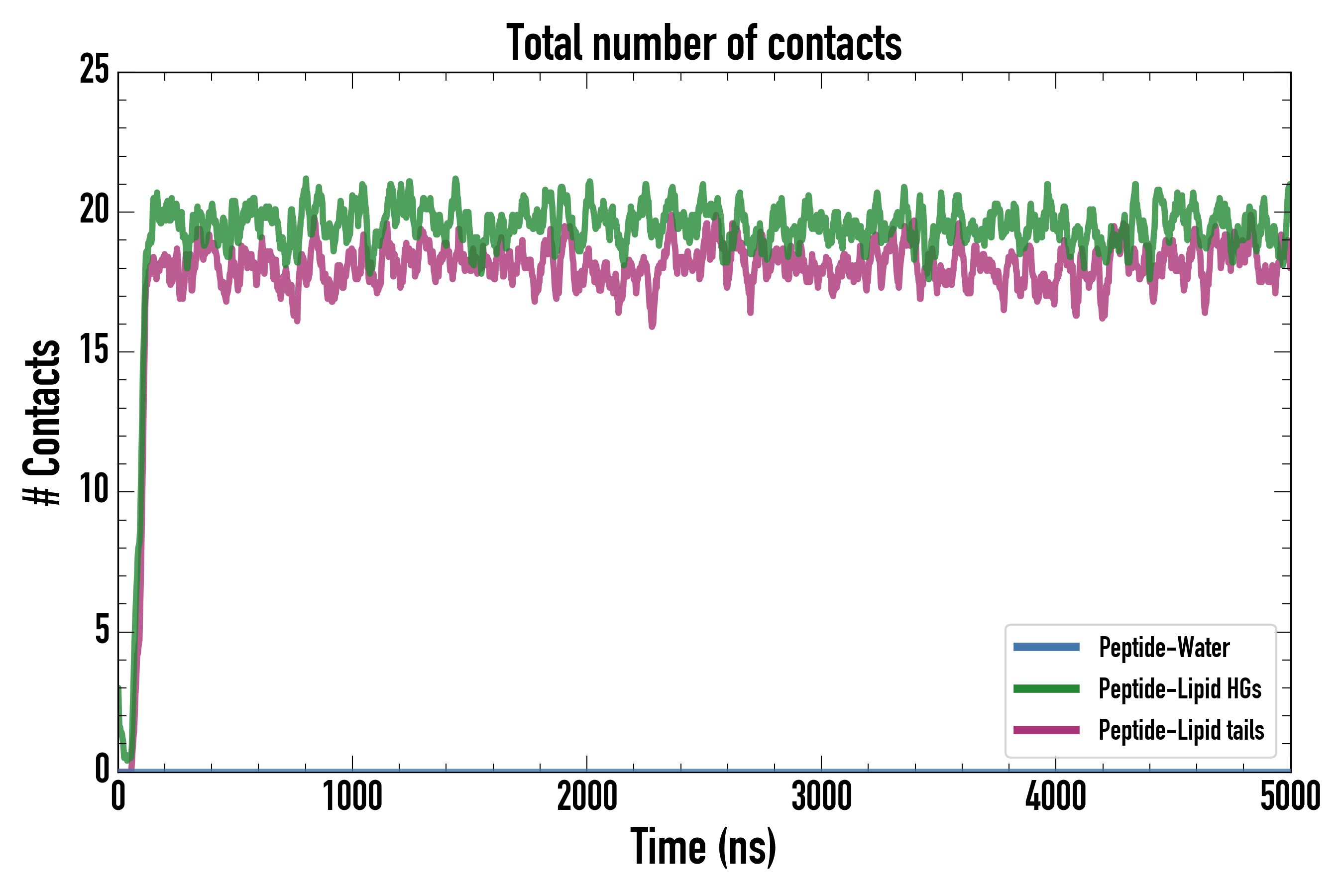 Number of contacts between each residue of the peptide backbone and the different lipid types, averaged over the last microsecond and using a cut-off of 0.6 nm.
