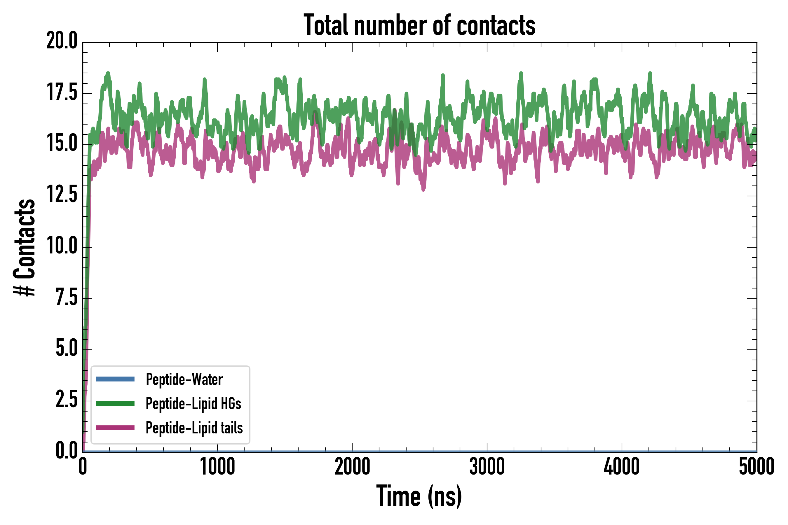 Number of contacts between each residue of the peptide backbone and the different lipid types, averaged over the last microsecond and using a cut-off of 0.6 nm.