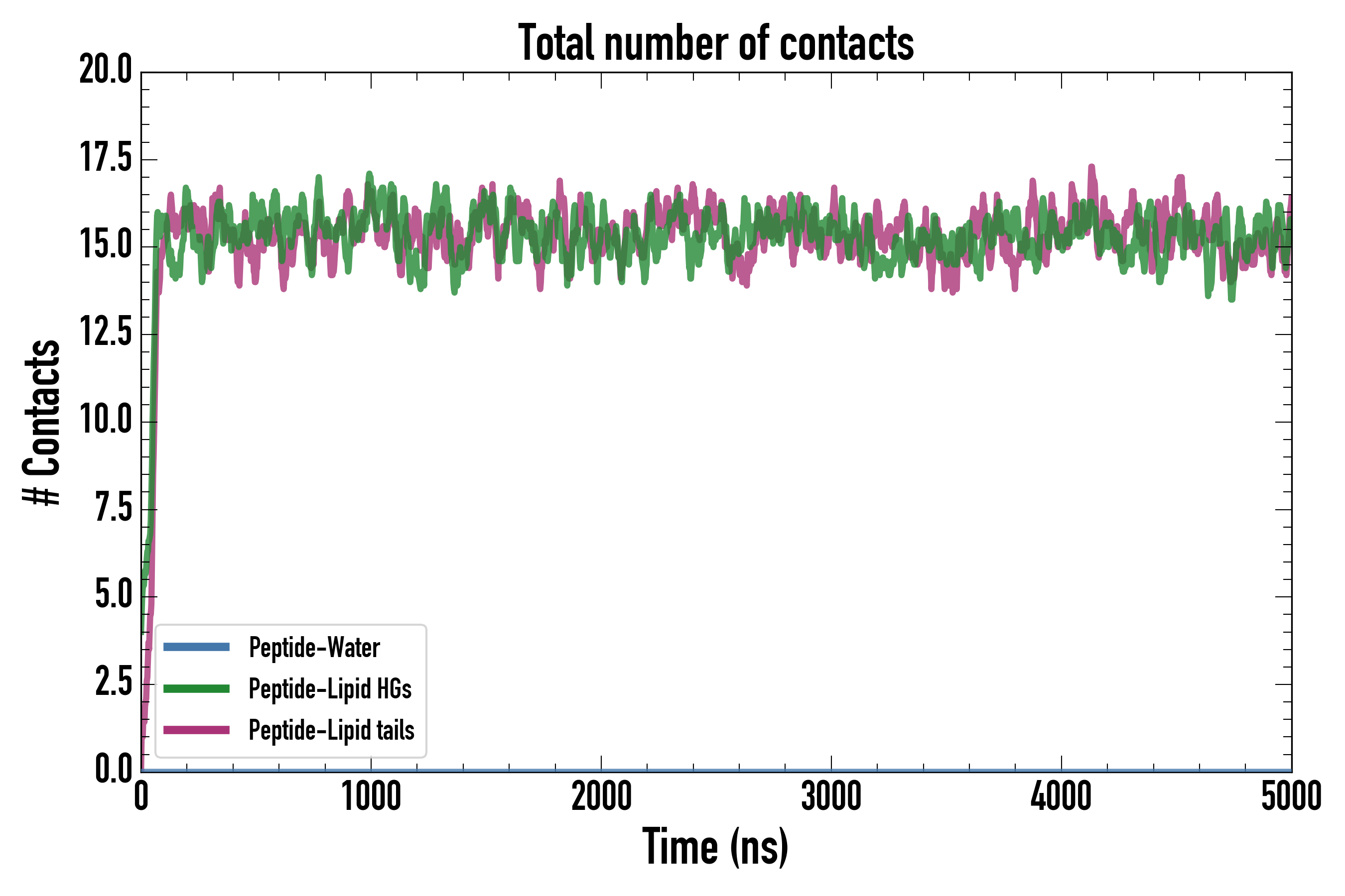 Number of contacts between each residue of the peptide backbone and the different lipid types, averaged over the last microsecond and using a cut-off of 0.6 nm.