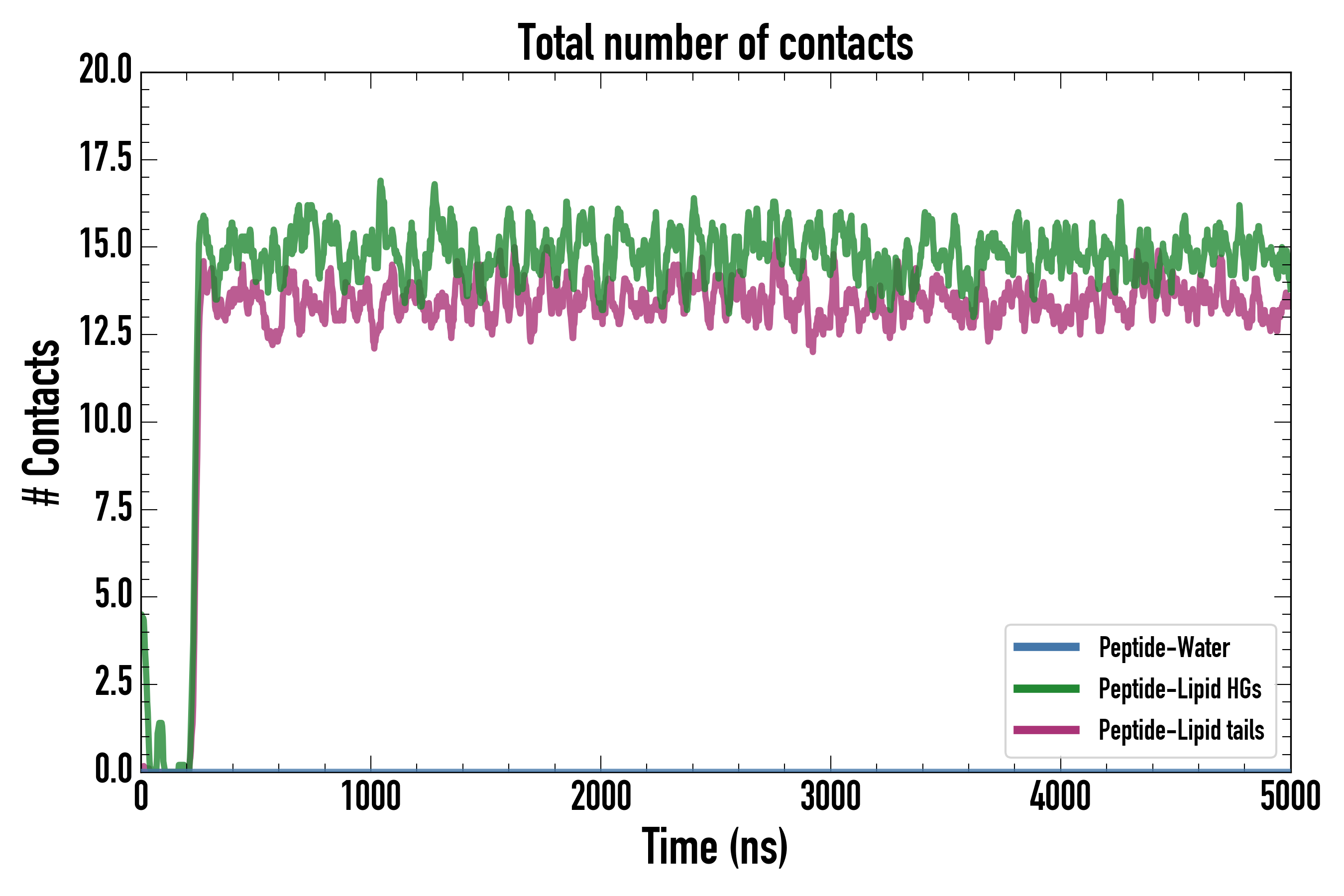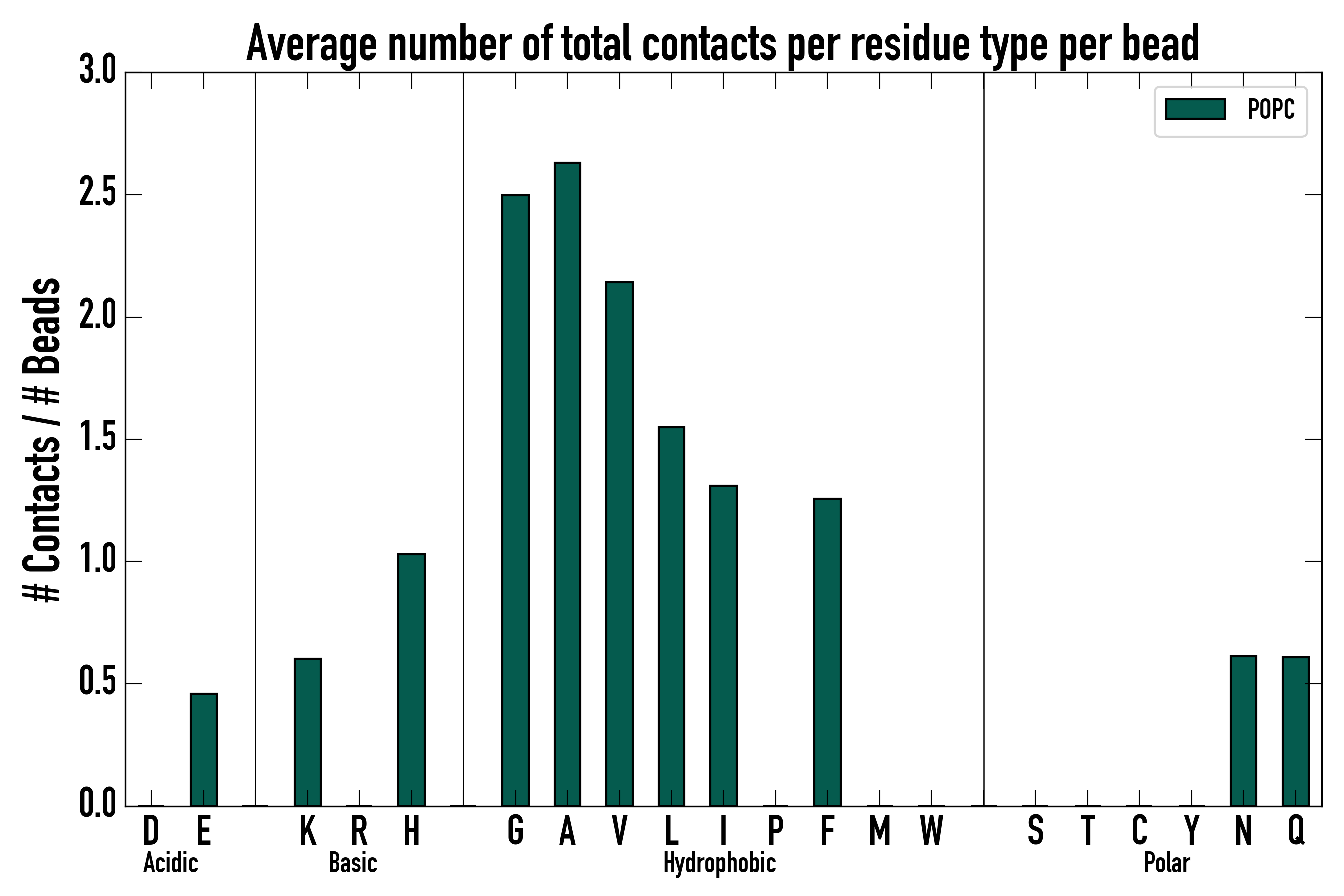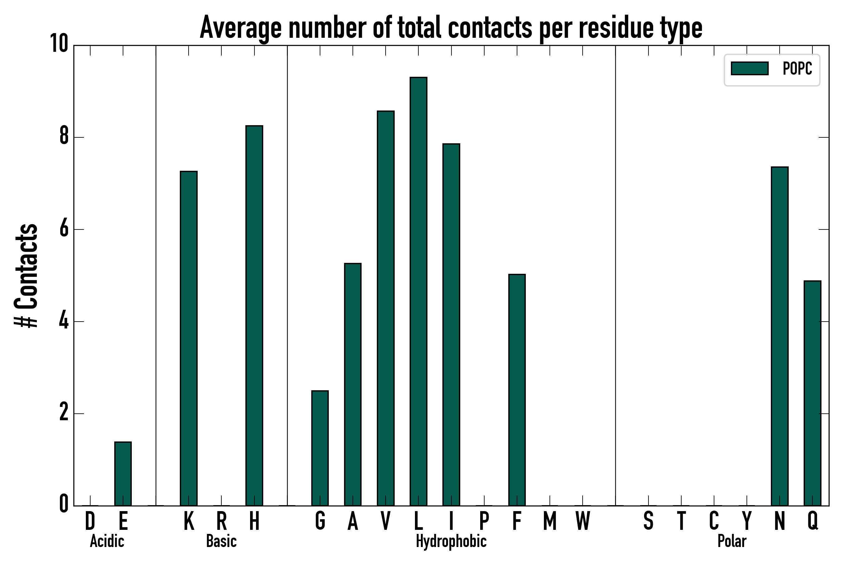 Number of contacts between each residue of the peptide backbone and the different lipid types, averaged over the last microsecond and using a cut-off of 0.6 nm.
