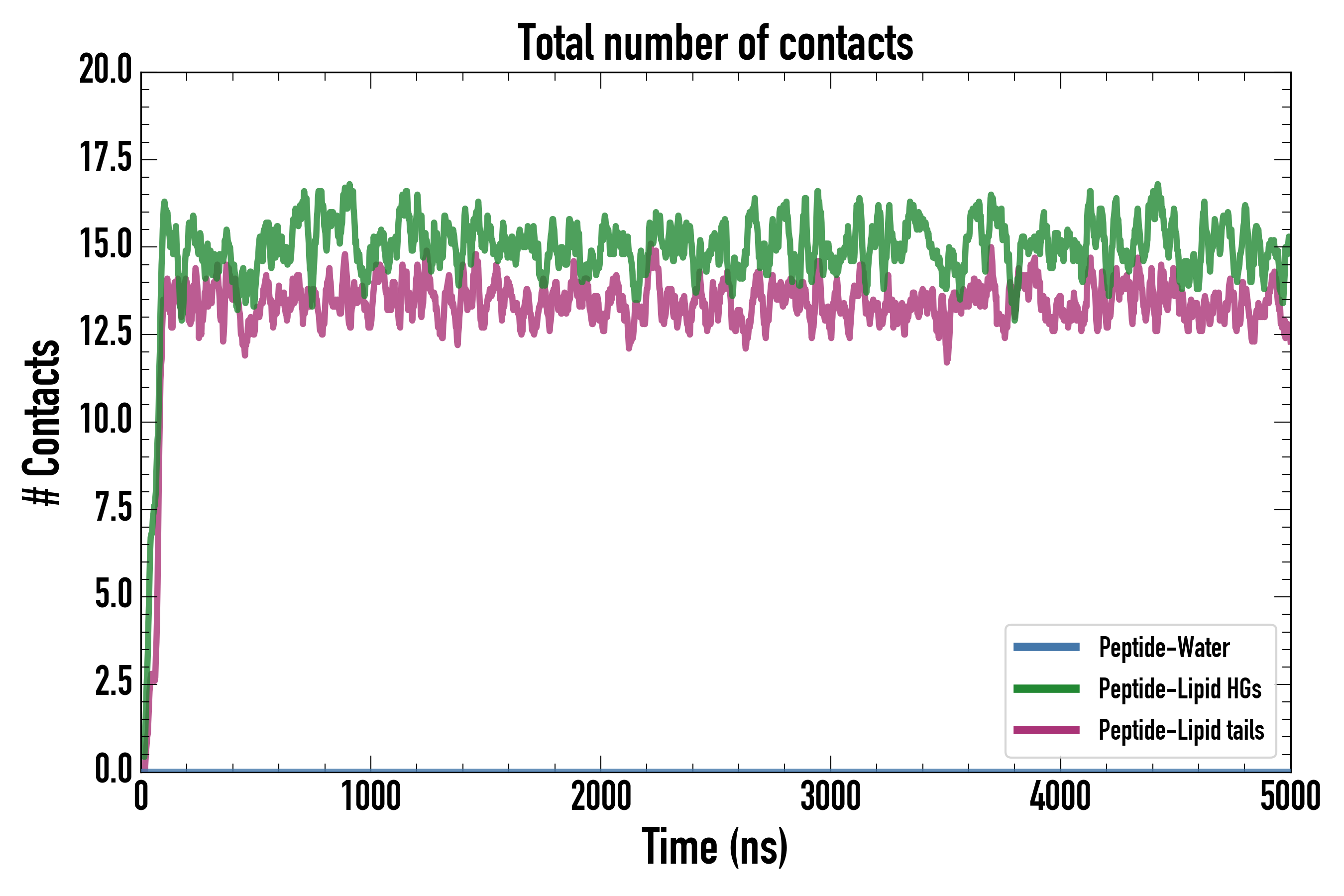 Number of contacts between each residue of the peptide backbone and the different lipid types, averaged over the last microsecond and using a cut-off of 0.6 nm.