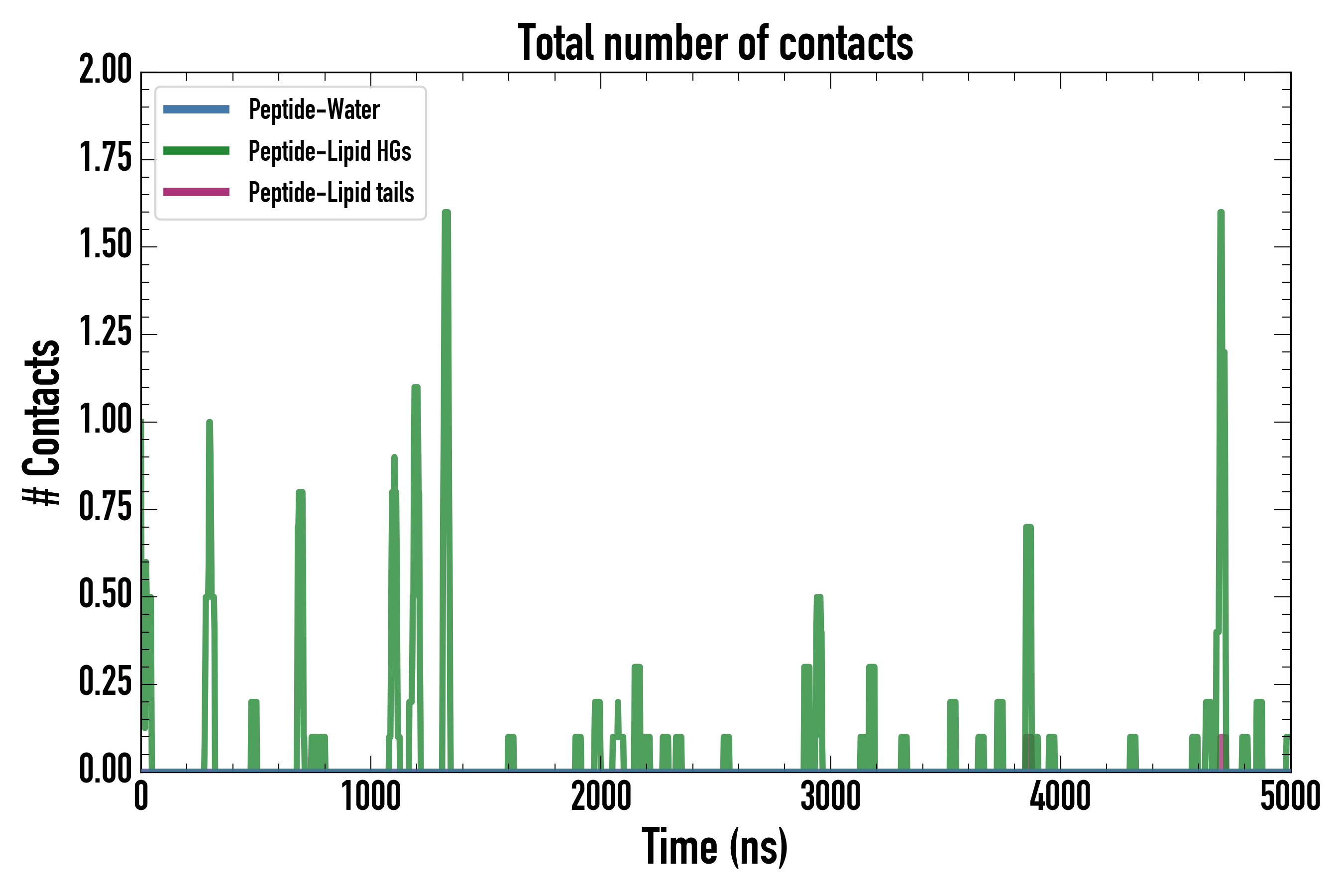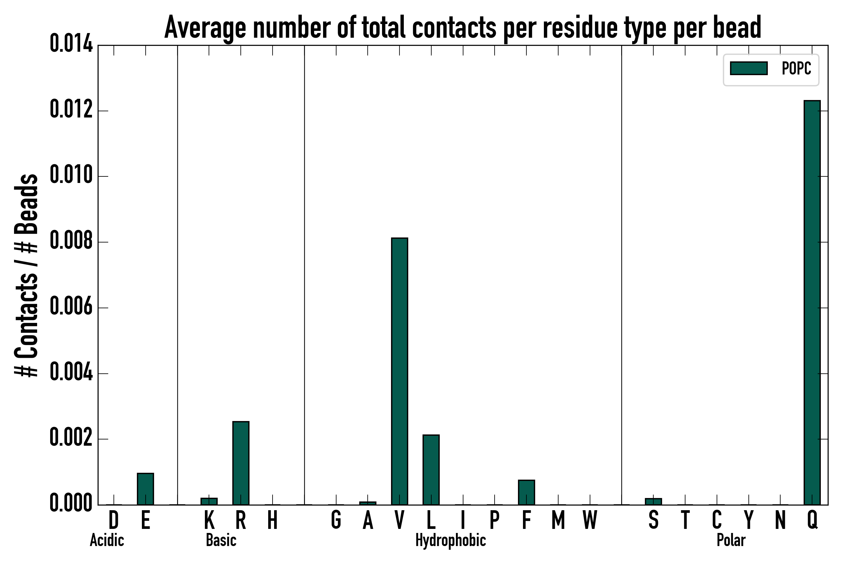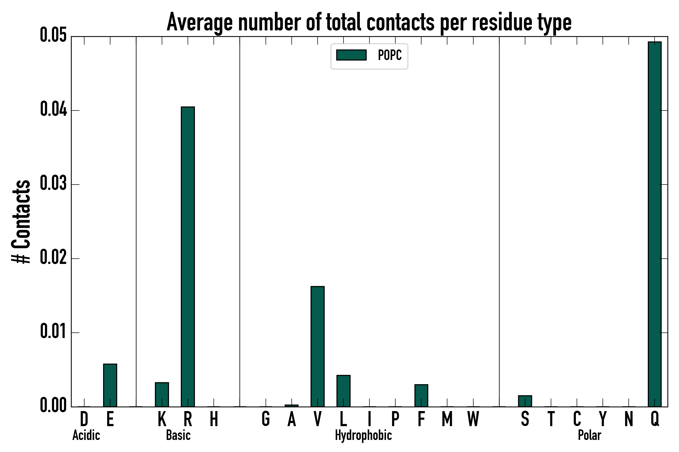 Number of contacts between each residue of the peptide backbone and the different lipid types, averaged over the last microsecond and using a cut-off of 0.6 nm.