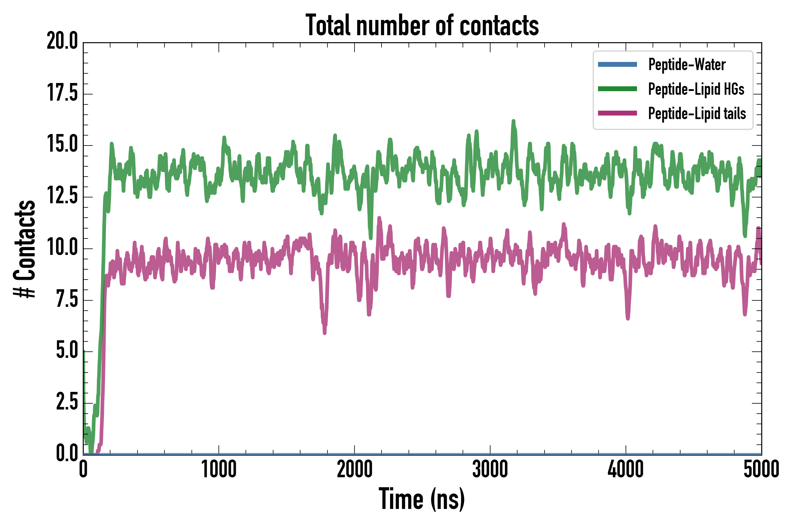 Number of contacts between each residue of the peptide backbone and the different lipid types, averaged over the last microsecond and using a cut-off of 0.6 nm.