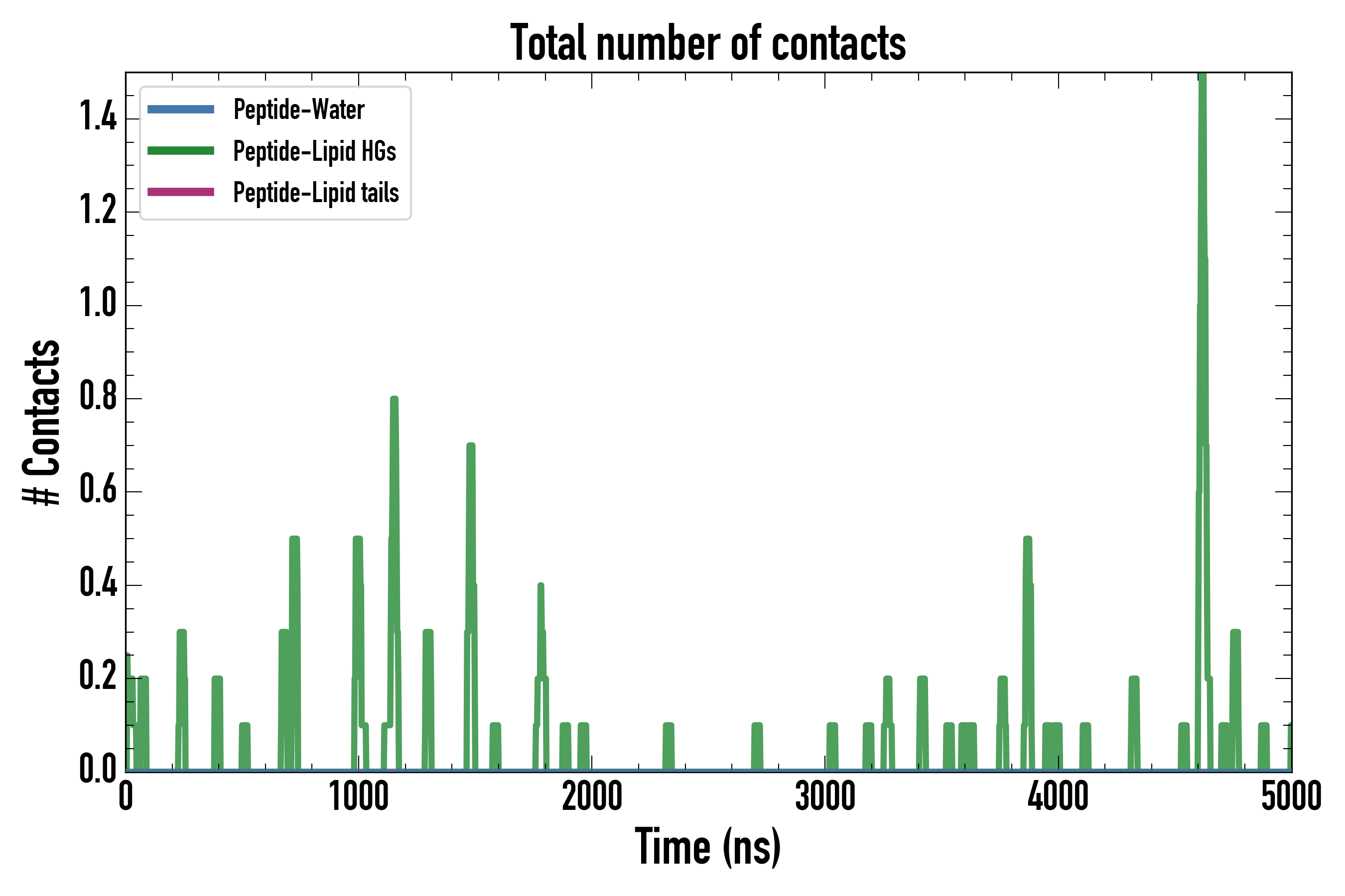 Number of contacts between each residue of the peptide backbone and the different lipid types, averaged over the last microsecond and using a cut-off of 0.6 nm.