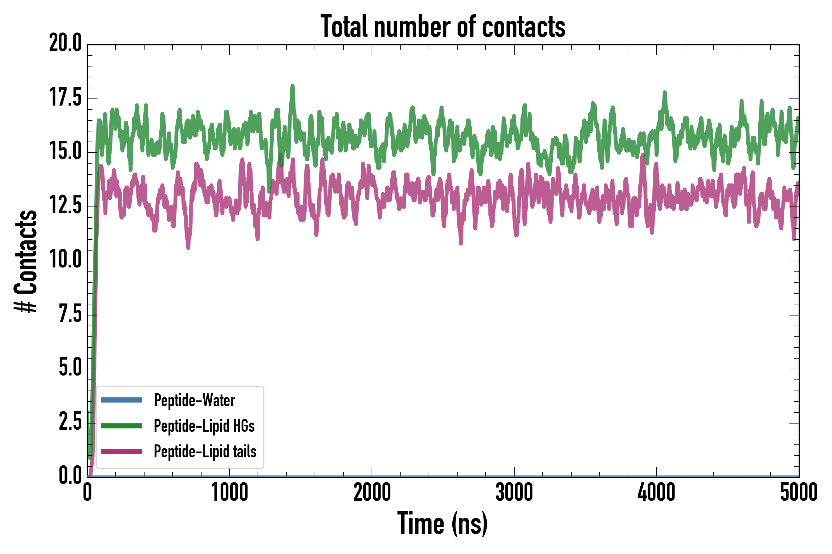 Number of contacts between each residue of the peptide backbone and the different lipid types, averaged over the last microsecond and using a cut-off of 0.6 nm.