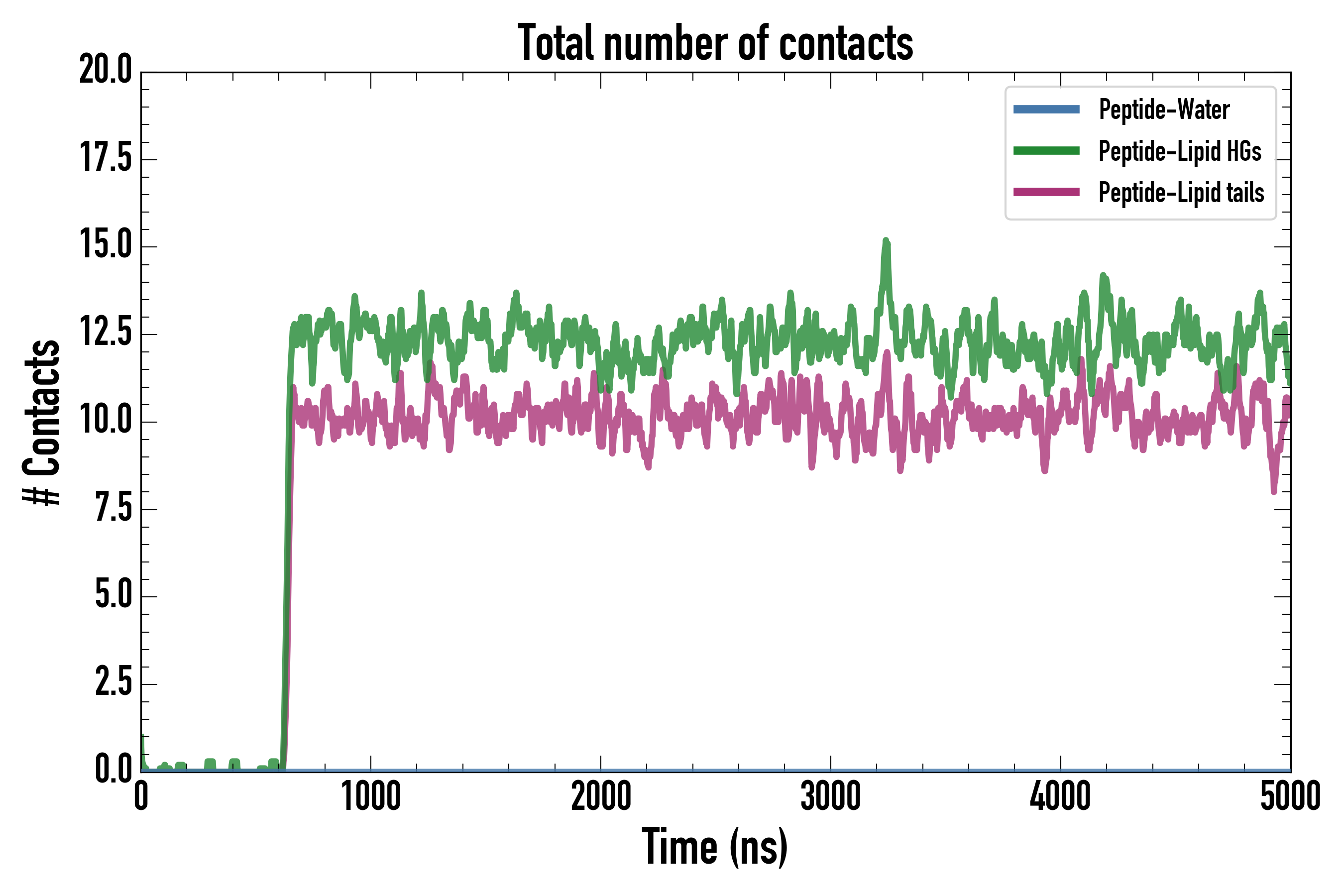 Number of contacts between each residue of the peptide backbone and the different lipid types, averaged over the last microsecond and using a cut-off of 0.6 nm.