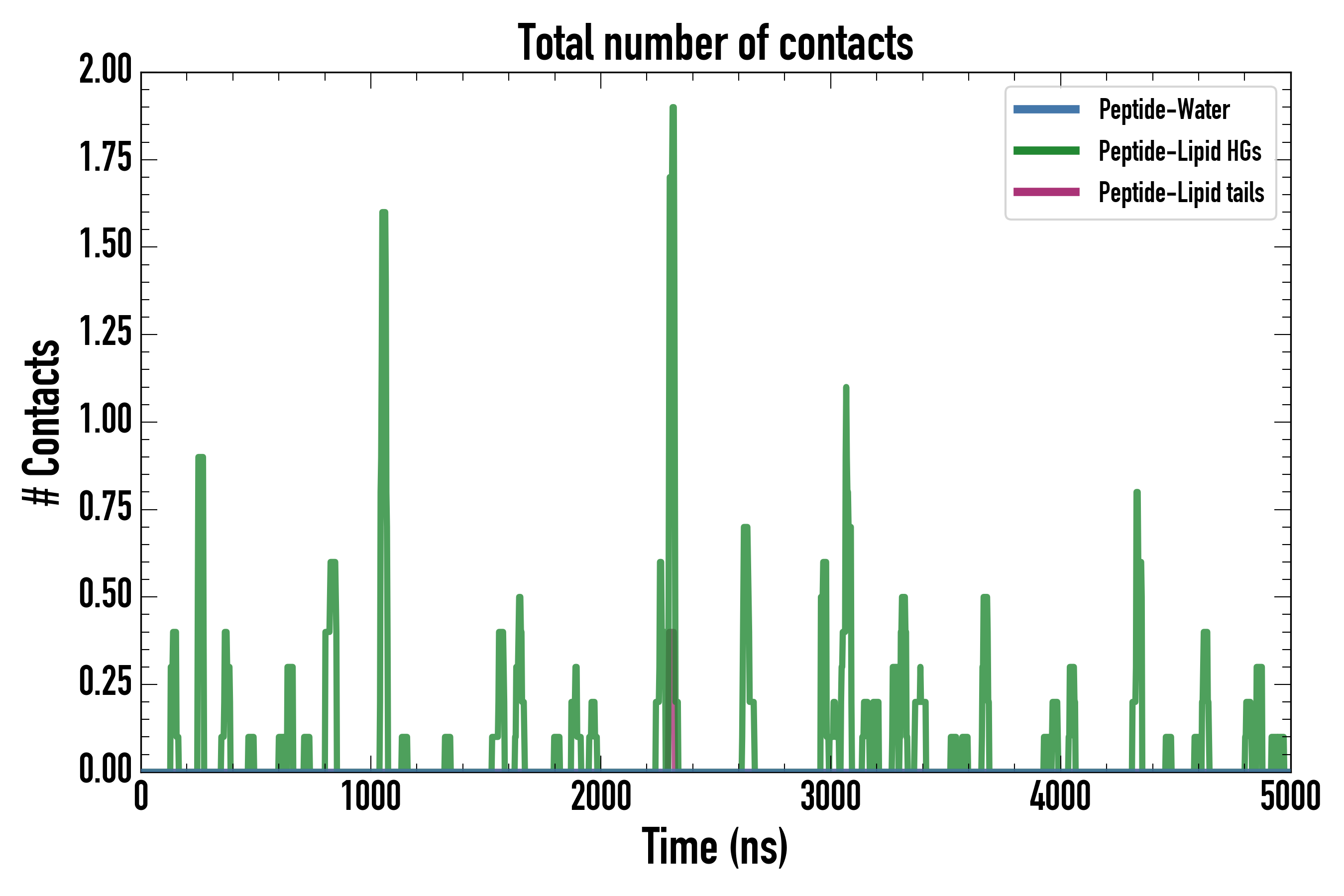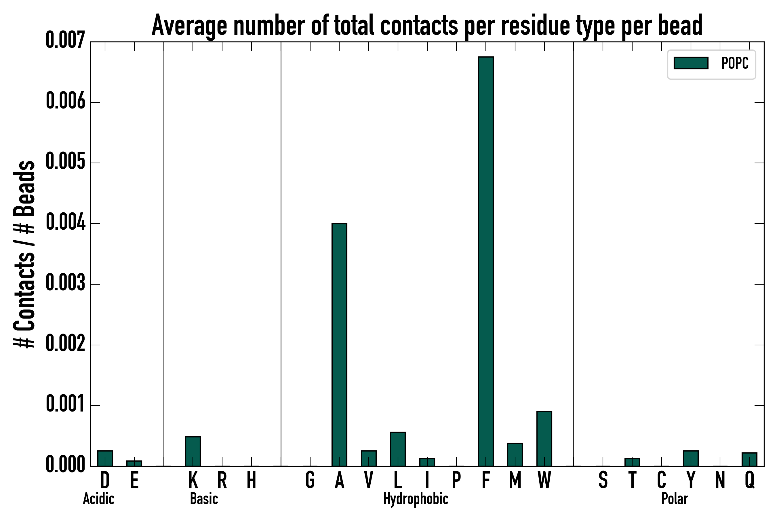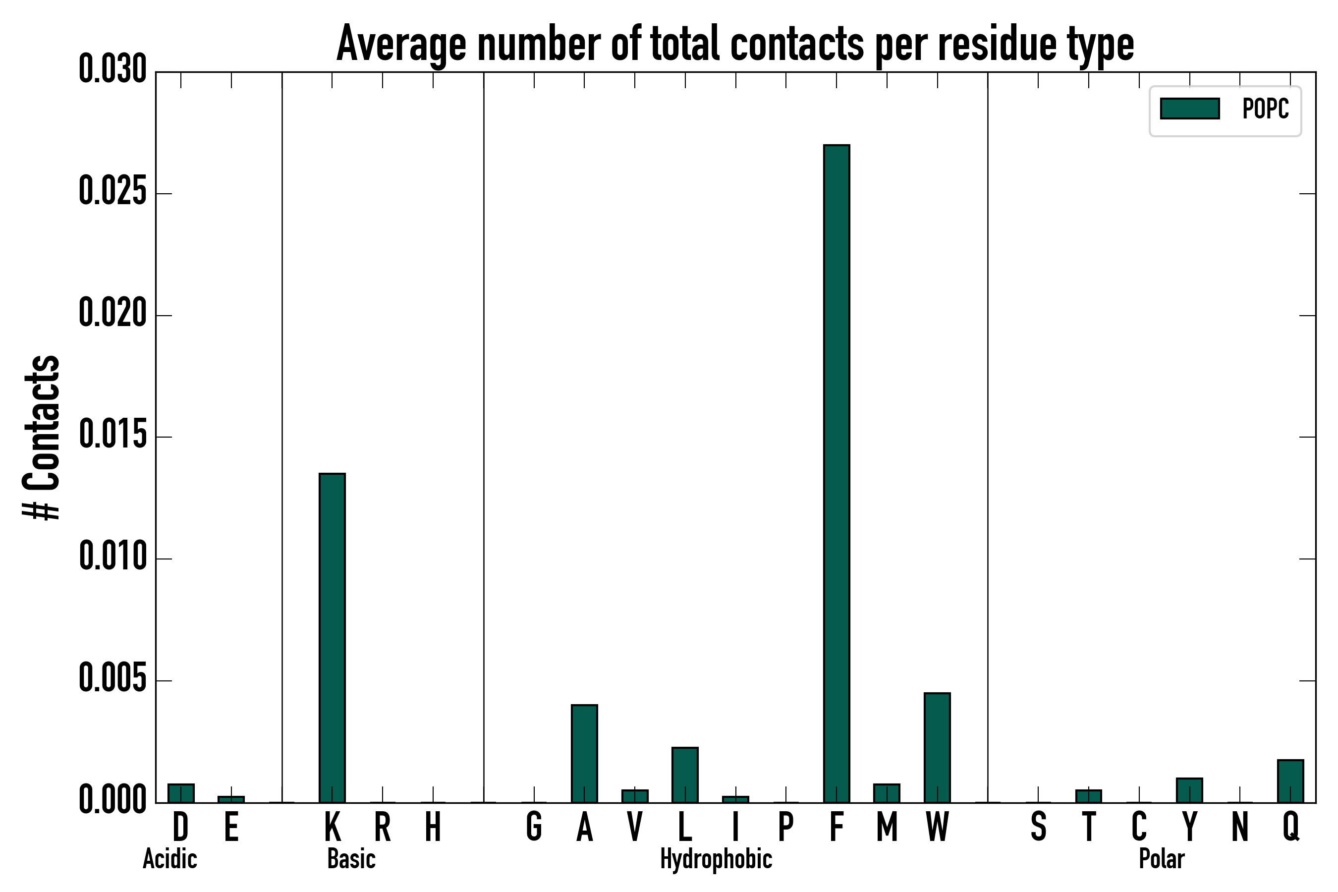 Number of contacts between each residue of the peptide backbone and the different lipid types, averaged over the last microsecond and using a cut-off of 0.6 nm.