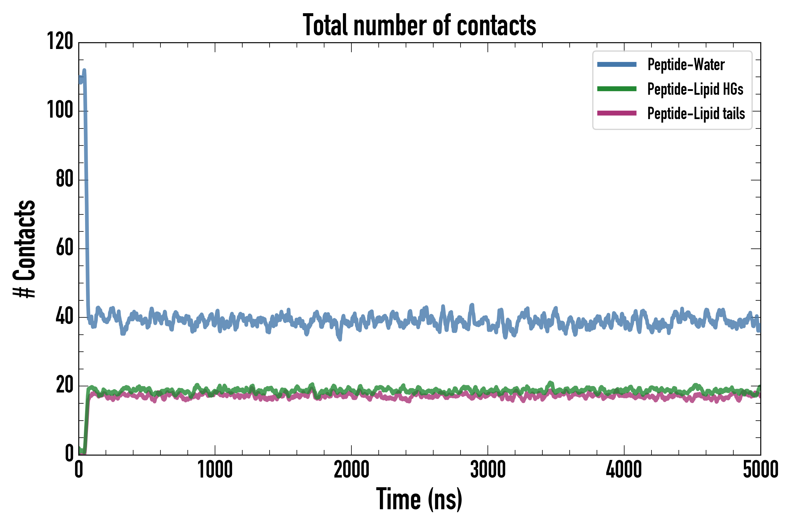 Number of contacts between each residue of the peptide backbone and the different lipid types, averaged over the last microsecond and using a cut-off of 0.6 nm.