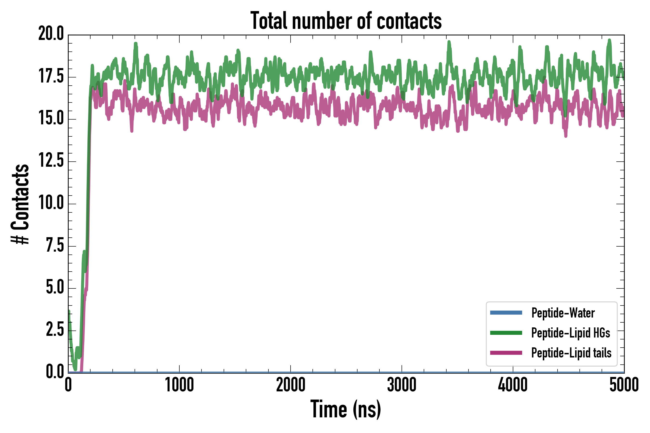 Number of contacts between each residue of the peptide backbone and the different lipid types, averaged over the last microsecond and using a cut-off of 0.6 nm.