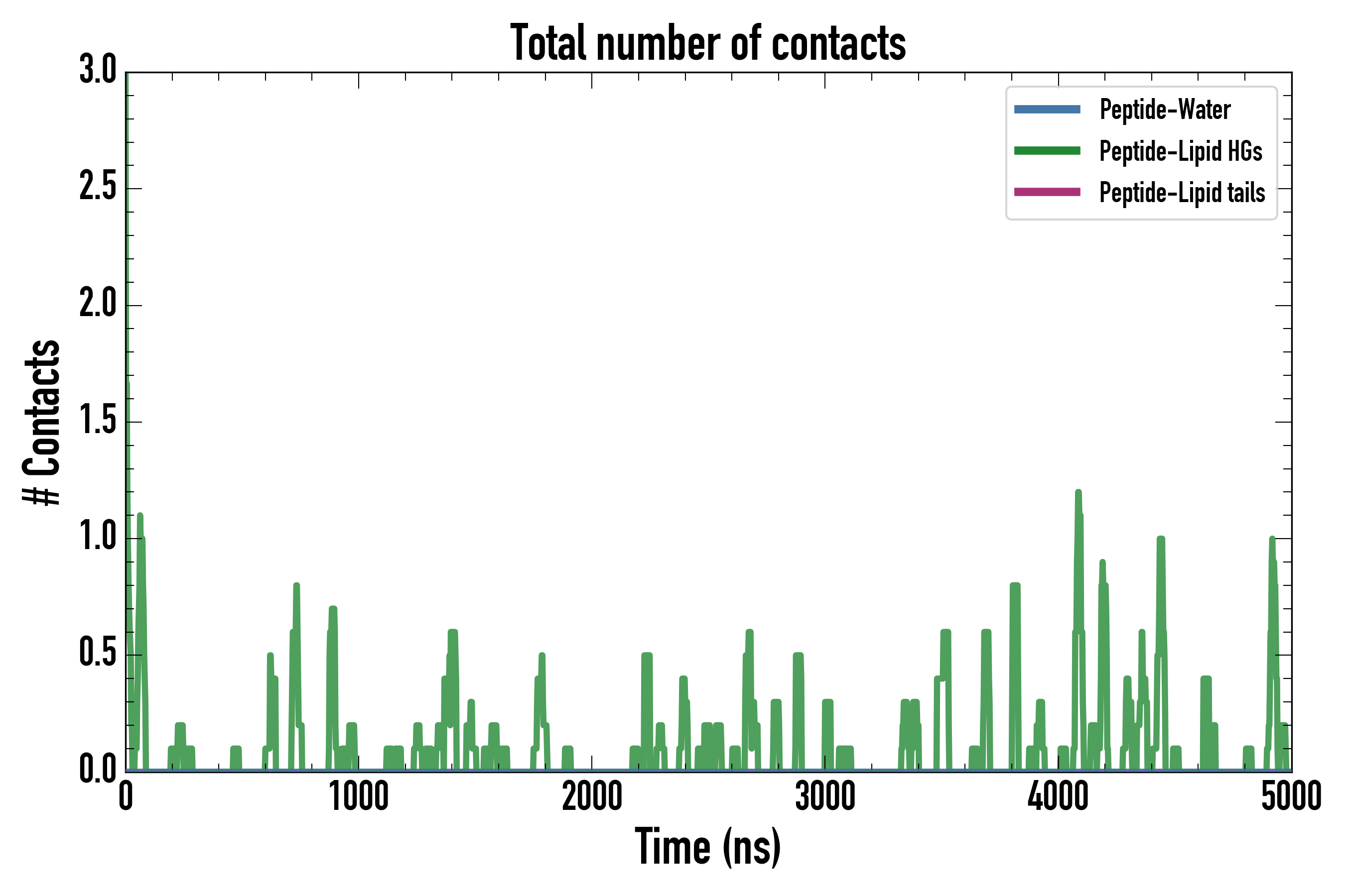 Number of contacts between each residue of the peptide backbone and the different lipid types, averaged over the last microsecond and using a cut-off of 0.6 nm.