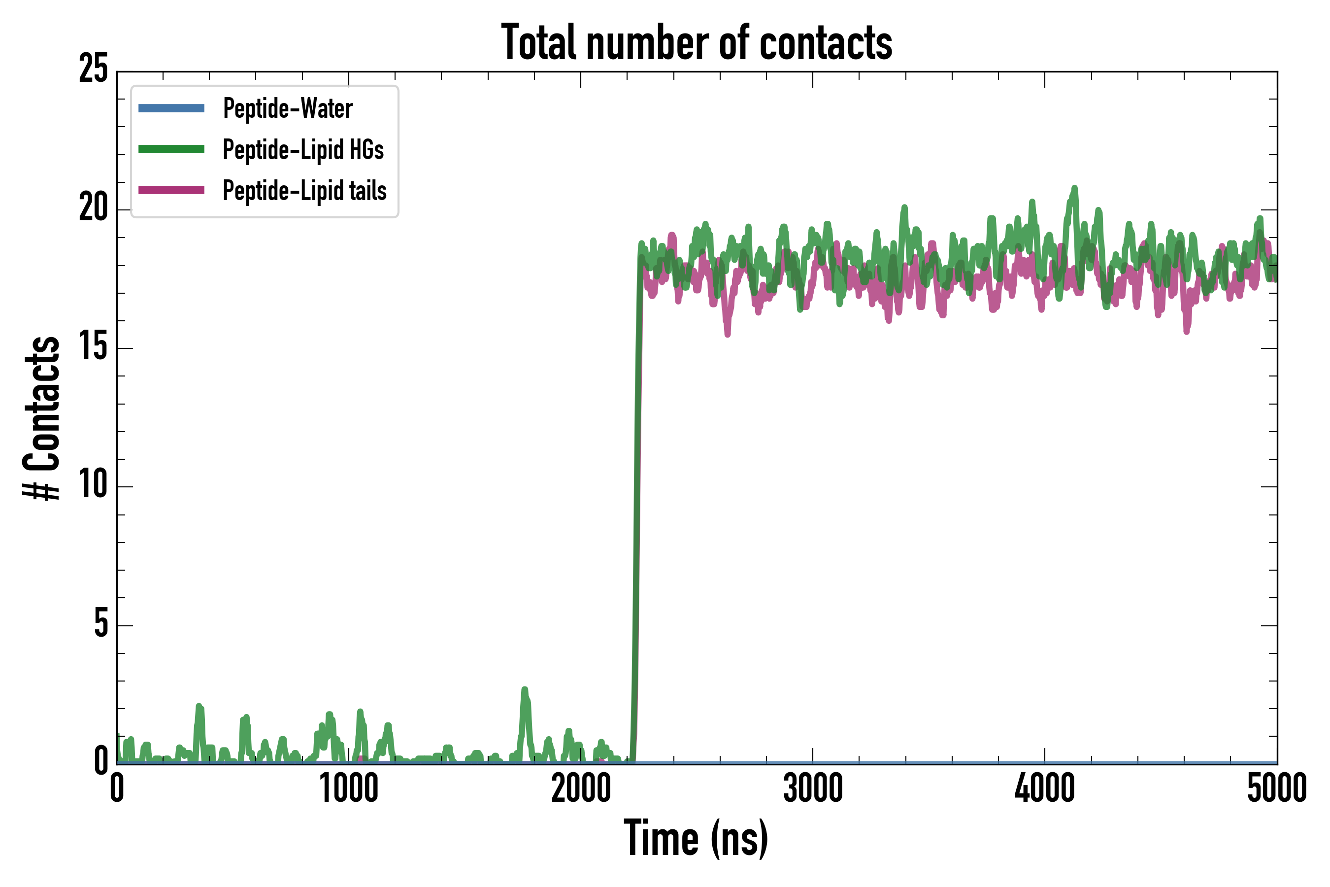 Number of contacts between each residue of the peptide backbone and the different lipid types, averaged over the last microsecond and using a cut-off of 0.6 nm.
