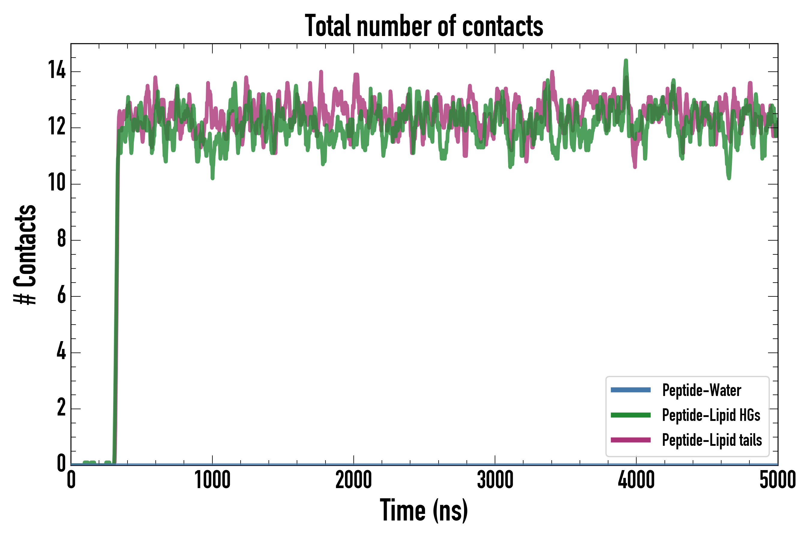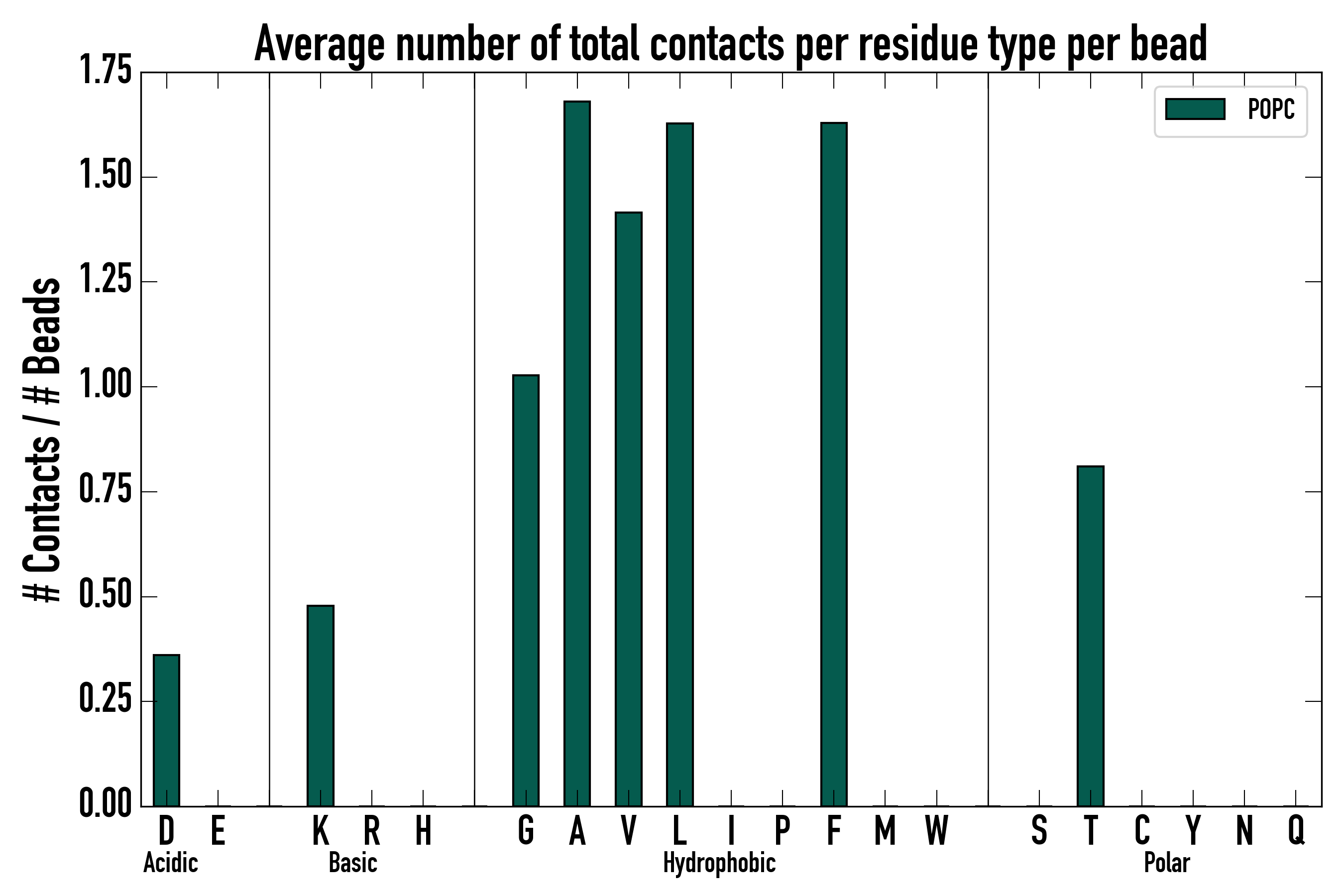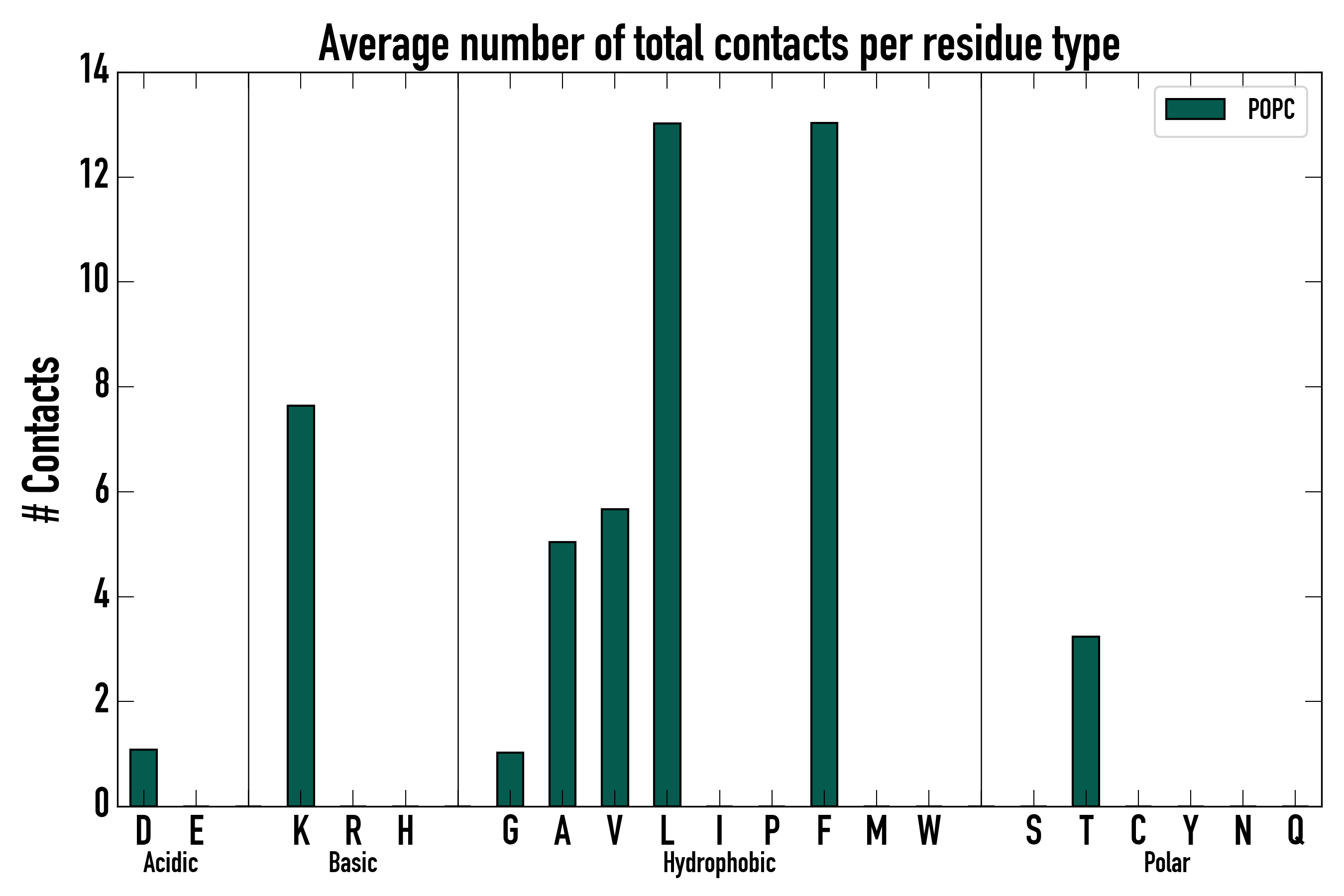 Number of contacts between each residue of the peptide backbone and the different lipid types, averaged over the last microsecond and using a cut-off of 0.6 nm.