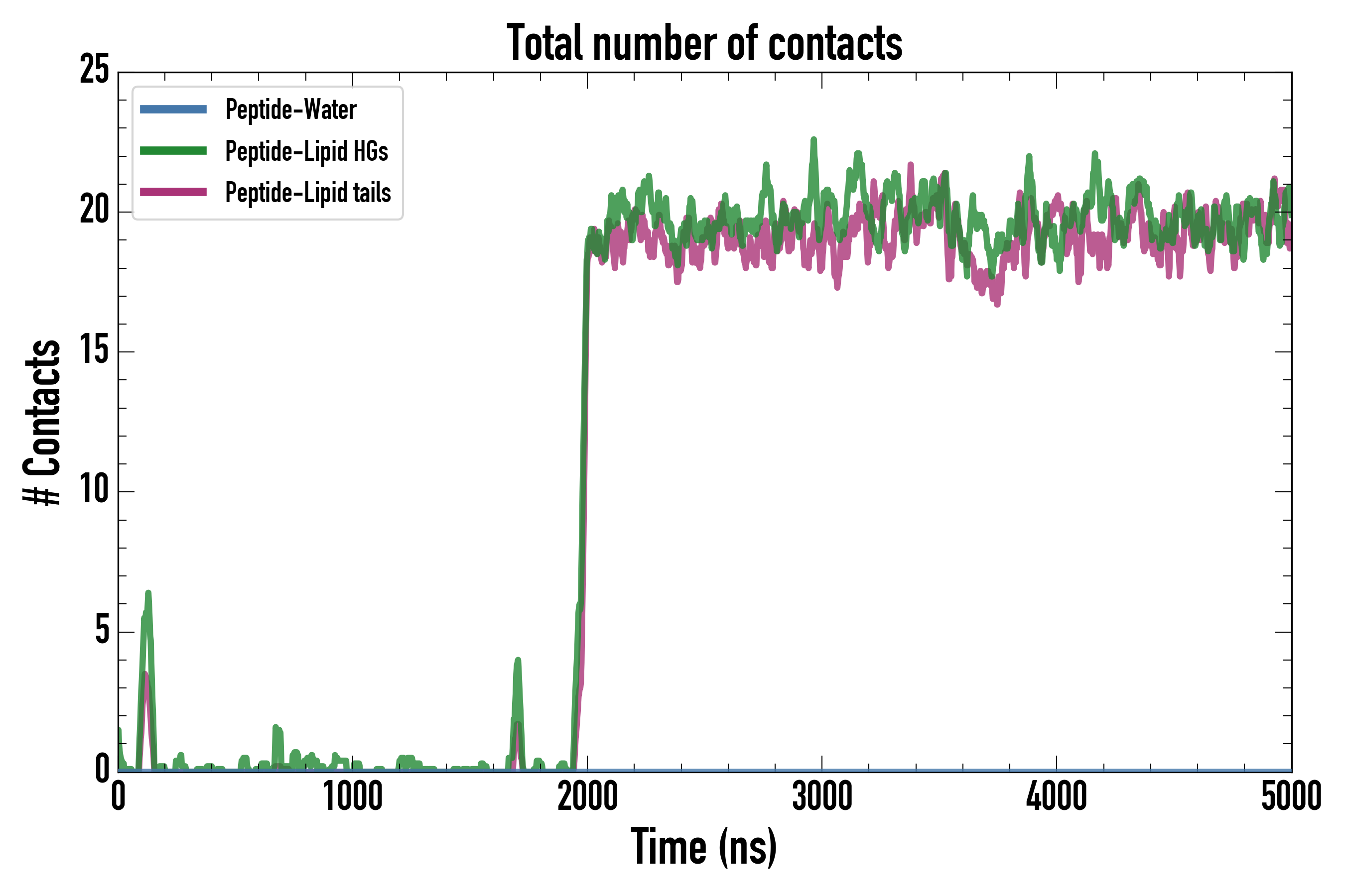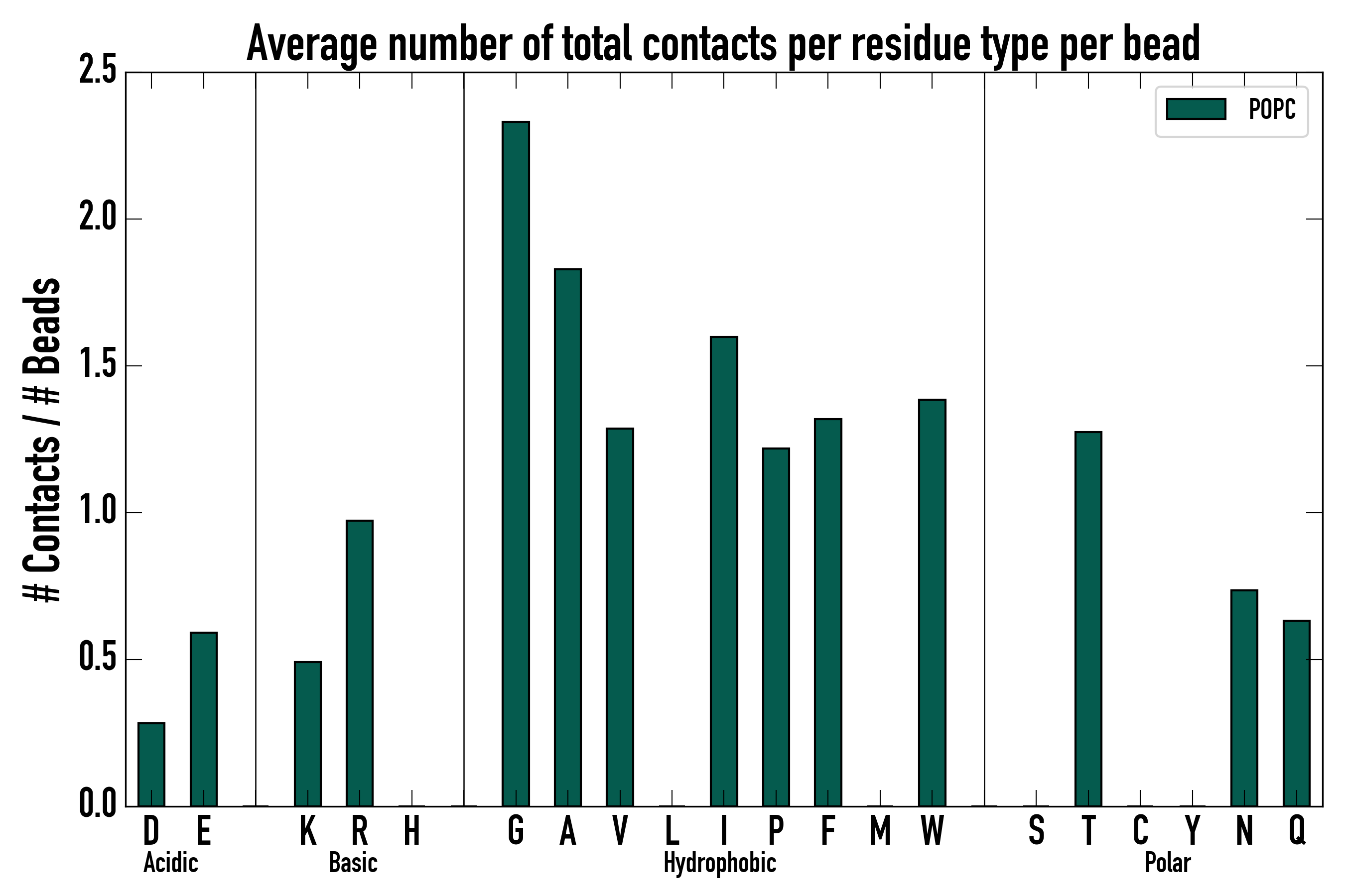 Number of contacts between each residue of the peptide backbone and the different lipid types, averaged over the last microsecond and using a cut-off of 0.6 nm.