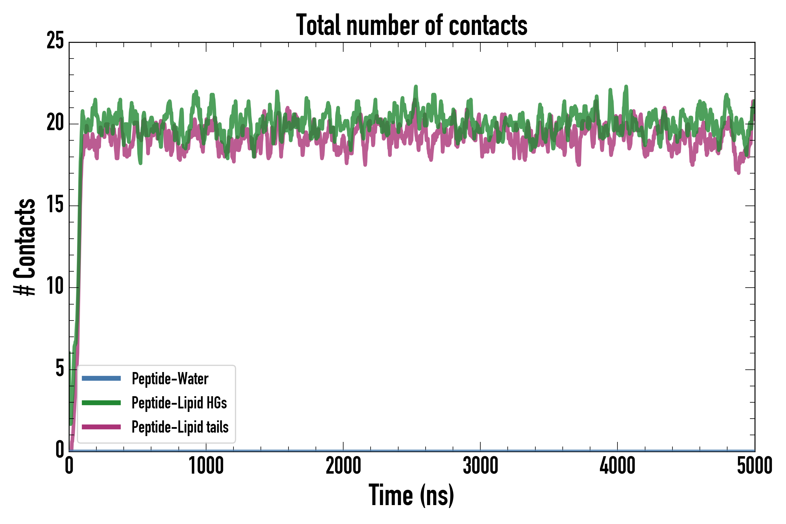 Number of contacts between each residue of the peptide backbone and the different lipid types, averaged over the last microsecond and using a cut-off of 0.6 nm.