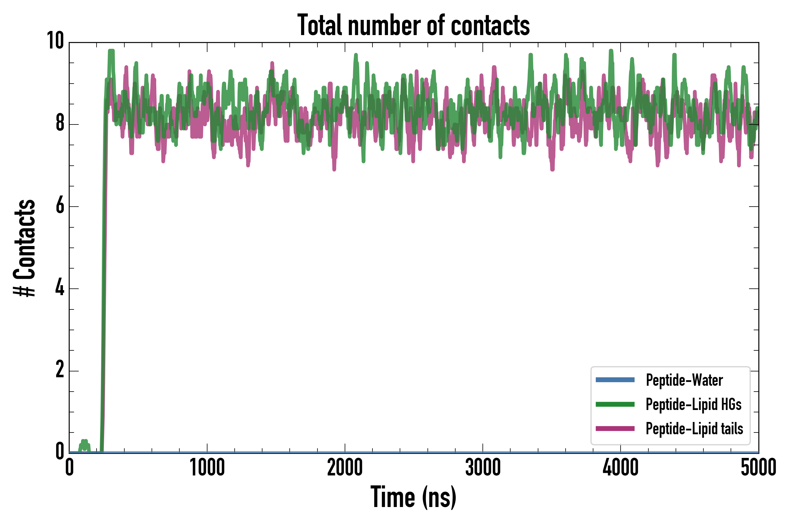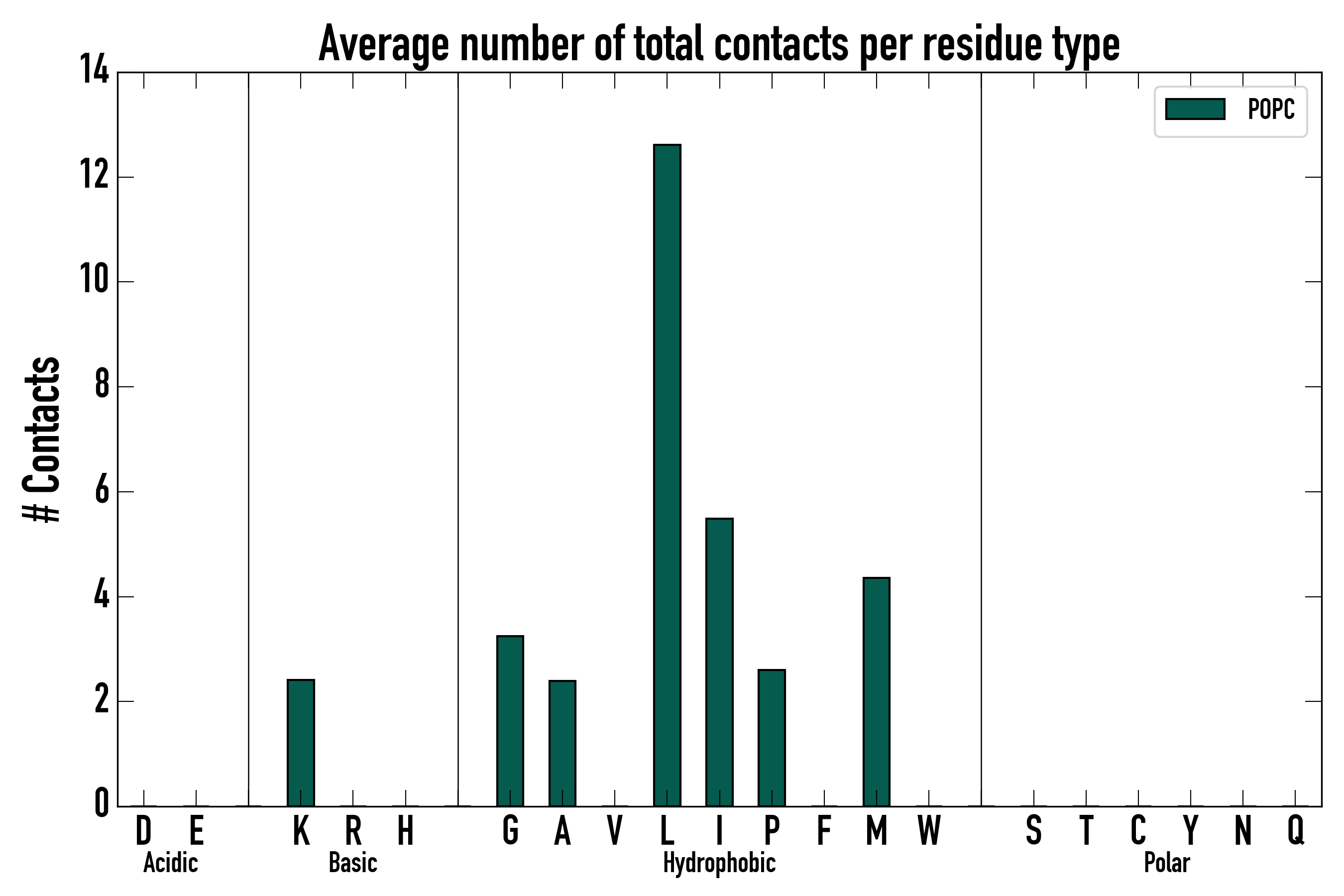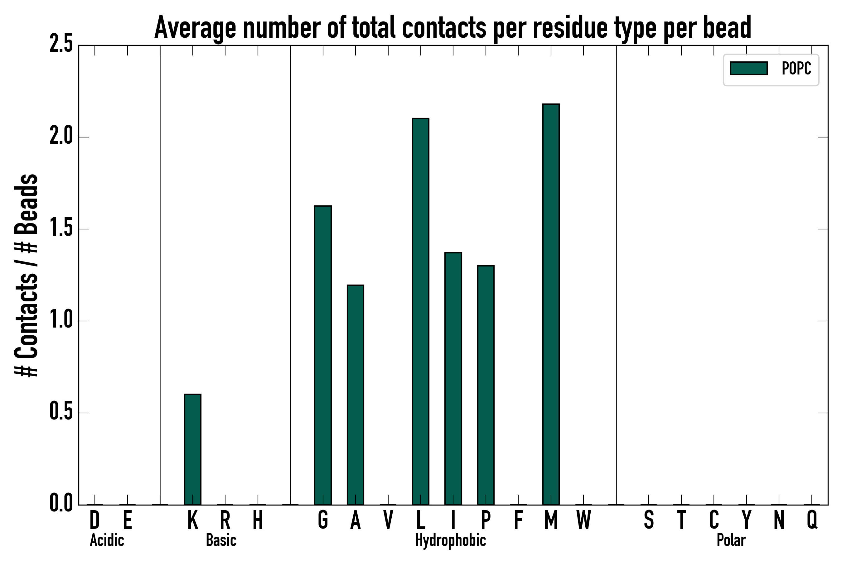 Number of contacts between each residue of the peptide backbone and the different lipid types, averaged over the last microsecond and using a cut-off of 0.6 nm.
