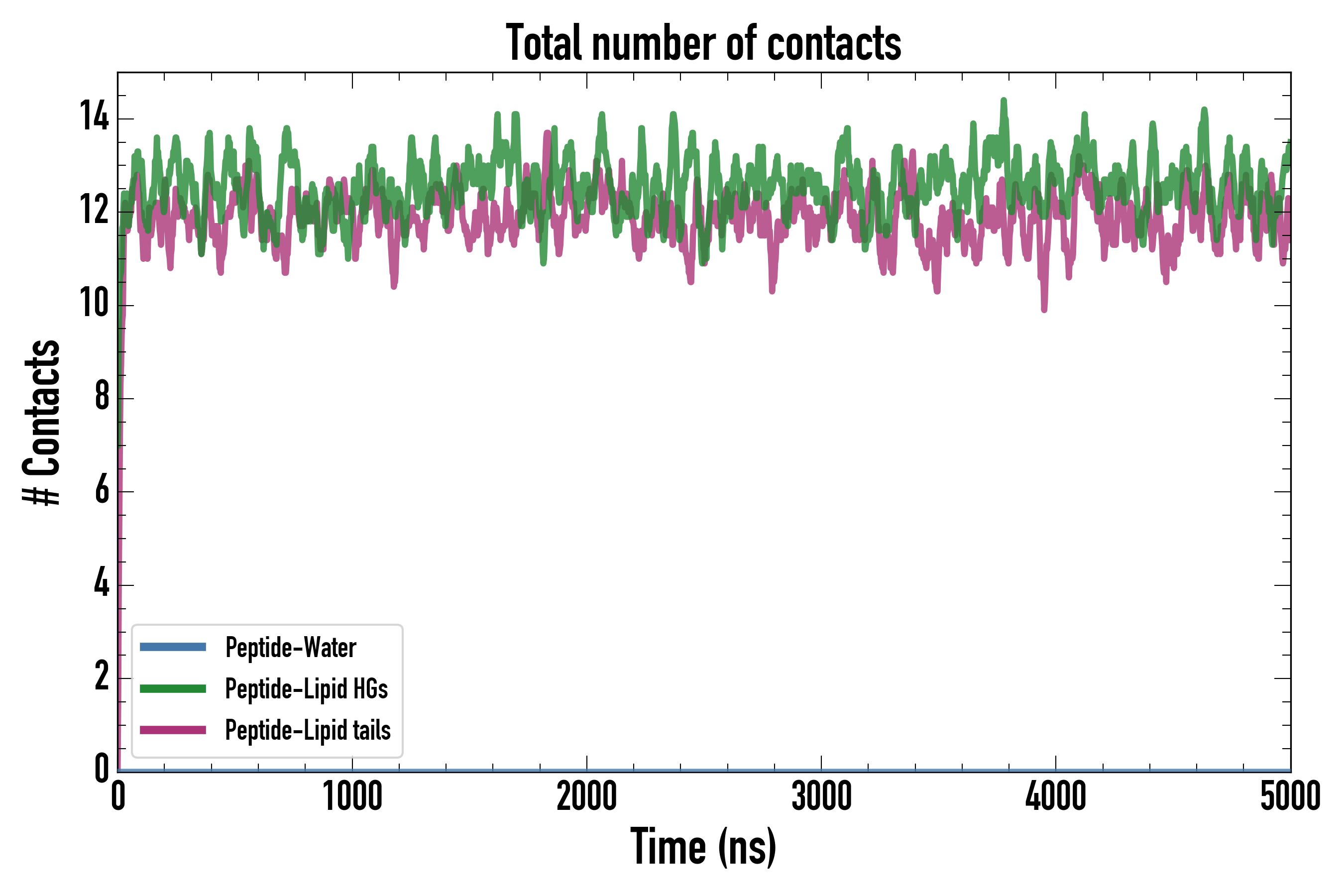 Number of contacts between each residue of the peptide backbone and the different lipid types, averaged over the last microsecond and using a cut-off of 0.6 nm.
