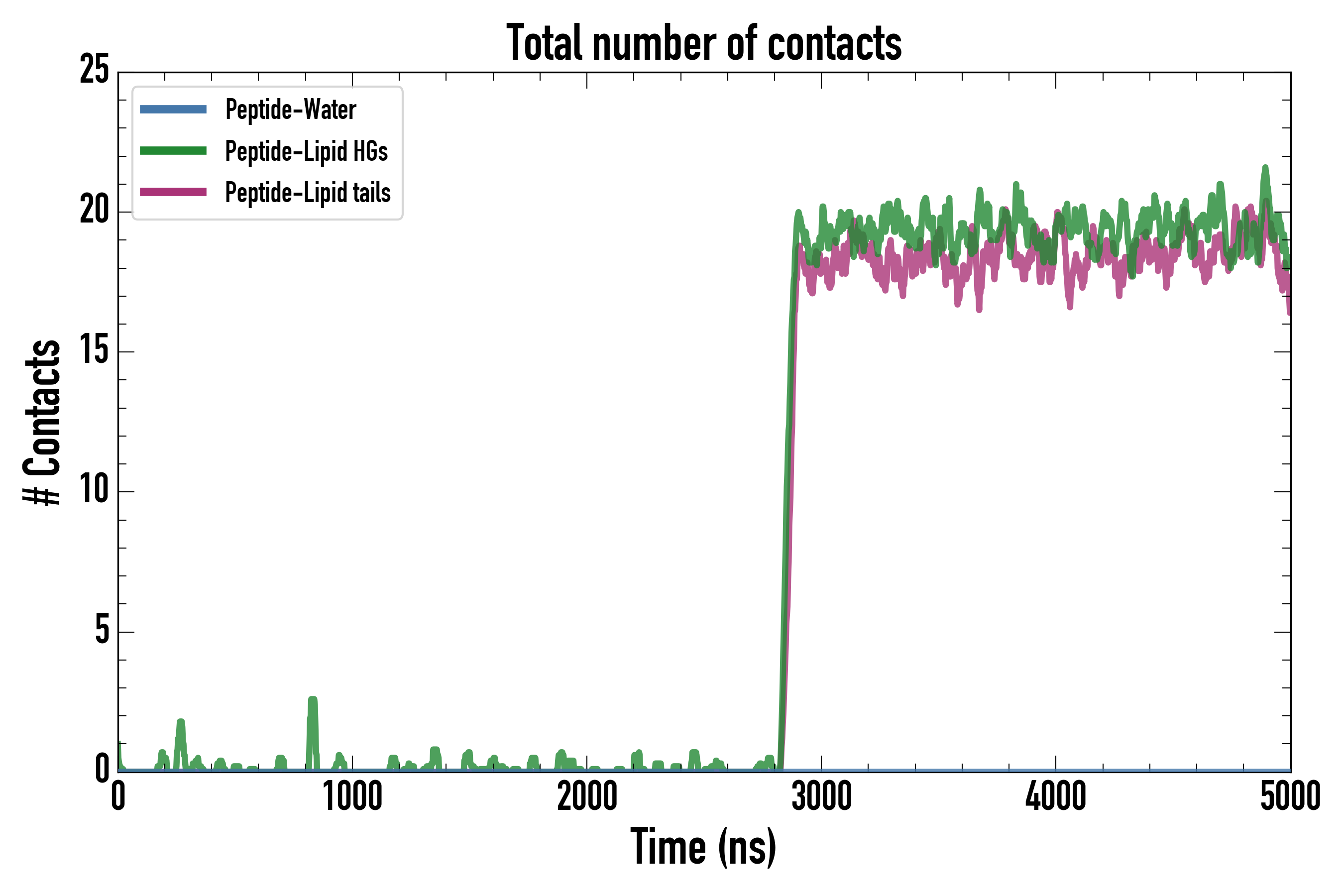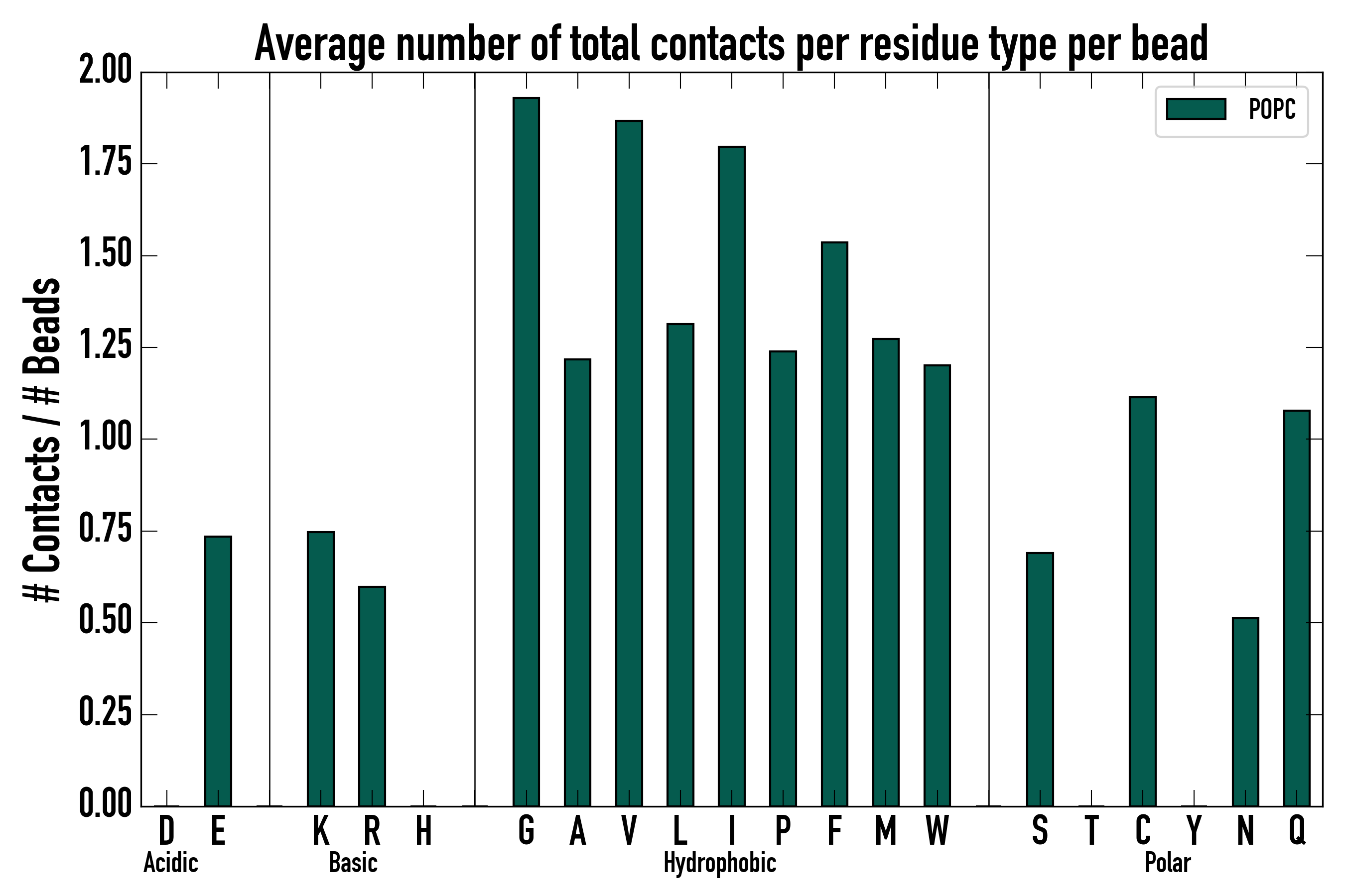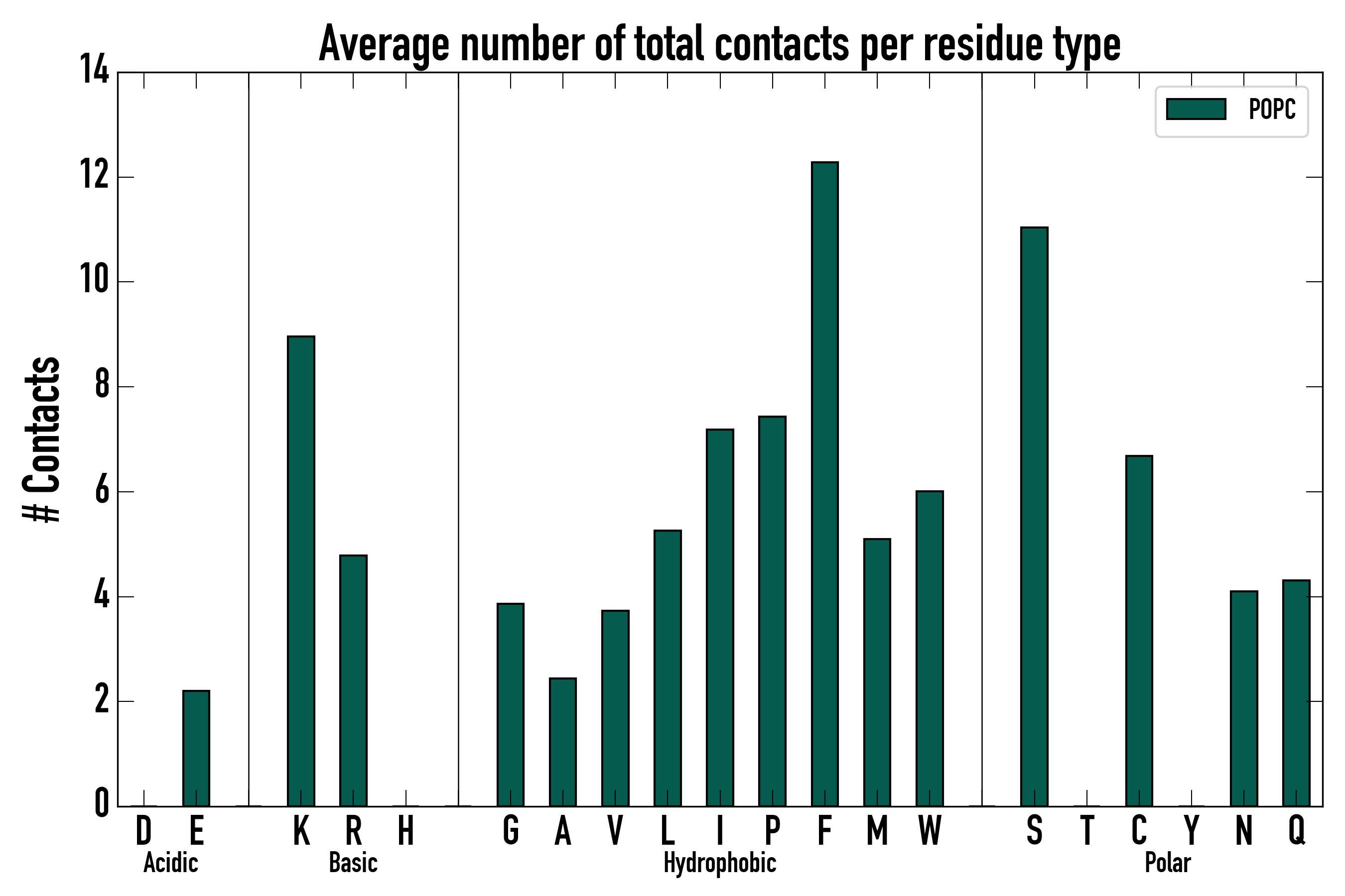 Number of contacts between each residue of the peptide backbone and the different lipid types, averaged over the last microsecond and using a cut-off of 0.6 nm.