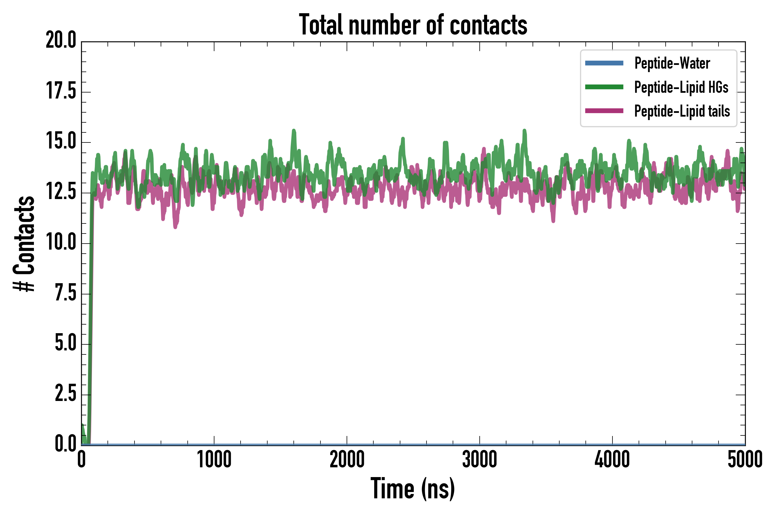 Number of contacts between each residue of the peptide backbone and the different lipid types, averaged over the last microsecond and using a cut-off of 0.6 nm.