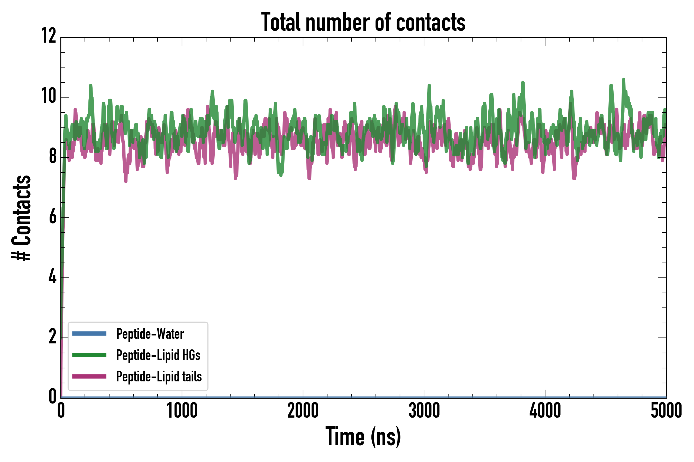 Number of contacts between each residue of the peptide backbone and the different lipid types, averaged over the last microsecond and using a cut-off of 0.6 nm.